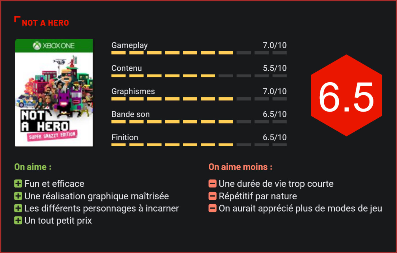 Après Crossing Souls, Devolver porte une autre pépite de son catalogue sur Switch, avec une fois de plus le pixel-art en ligne de mire. Décidément très actif sur Switch en cette période estivale, Devolver Digital nous livre un second jeu après l’excellent Crossing Souls. Déjà sorti sur PC, Not A Hero est un jeu d’action dans la plus pure tradition des films de John Woo, qui présente la particularité d’être entièrement en 2D et de reprendre le style caractéristique – et très rétro – des autres productions Devolver Digital. Dès les premières minutes de jeu, le ton est donné. Not A Hero ne s’encombre guère d’un scénario ni d’un semblant de mise en scène. Le joueur est plongé immédiatement dans l’action et doit apprendre à maîtriser les mécanismes de jeu dans la foulée. Par chance, le gameplay du jeu est relativement plus simple puisque le joueur passera la plupart de son temps à effectuer des roulades et à se planquer derrière un mur ou une porte pour éviter les tirs de ses adversaires. Une touche pour tirer, une autre pour recharger, et une pour rouler / se planquer. C’est à peu près tout. Nerveux, le jeu de Devolver Digital est un véritable délice à parcourir grâce à son level design ingénieux qui pousse le joueur à ouvrir des portes et prendre des cages d’escalier sans cesse pour surprendre ses adversaires. Plusieurs séquences plus originales viennent ponctuer les missions avec par exemple l’apparition d’un hélicoptère. Globalement toutefois, ne vous attendez pas à de grosse surprise. Not A Hero est un titre qui reste dirigiste, fun, mais plutôt à petite dose. D’ailleurs, le jeu n’est pas bien long. Il ne vous faudra que quelques heures pour en voir le bout et déverrouiller l’intégralité de son contenu. Par cela, comprenez des personnages supplémentaires à incarner, plutôt bien différenciés vu leur arsenal différent, mais qui n’apportent pas forcément un très gros plus. Vu son prix, rien de très grave en soi, mais on aurait aimé davantage de surprises et de contenu. En l’état, reste un divertissement accrocheur qui jouera parfaitement son rôle dans les transports en commun. Côté réalisation technique, Devolver Digital frappe très fort, comme à son habitude, avec une bande sonore accrocheuse et un style graphique rétro en pixel-art absolument superbe. Certes, on pourrait penser au premier coup d’œil qu’il s’agit d’un rescapé des années 90, mais le titre est d’une fluidité étonnante et beaucoup plus moderne qu’il n’y paraît dans sa construction. Difficile donc de trouver quoi que ce soit à redire à ce niveau… Conclusion Délicieusement jouissif dès la première minute de jeu, Not A Hero montre toutefois assez vite ses limites. Dans la plus pure tradition des films de John Woo, la production de Devolver Digital vante des affrontements nerveux, que l’on croirait tout droit tirés d’un film d’action. L’ennui, c’est que si le gameplay est accrocheur et la réalisation maîtrisée, on en voit un peu trop vite le bout et surtout le divertissement a tendance à se montrer très vite répétitif… Plus de diversité et de modes de jeu ne lui auraient clairement pas fait de mal. En l’état, reste un titre très fun qui mérite le détour si le pixel-art est votre dada…