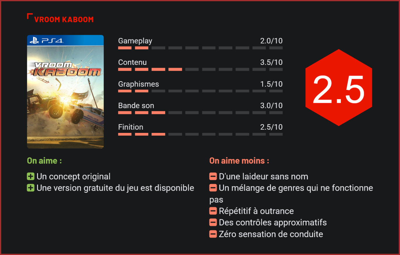 Attendu au tournant par les propriétaires du PlayStation VR, Vroom Kaboom s’annonçait comme un titre particulièrement prometteur pour la plate-forme de Sony, et une jolie alternative aux Carmageddon et autres Vigilante 8-likes. Plutôt que de simplement recopier un concept, les développeurs de Vroom Kaboom ont toutefois tenu à faire preuve d’originalité. Leur titre n’est donc pas une pâle copie de Vigilante 8 mais bien un jeu sortant réellement des sentiers battus, mélangeant séquences de conduite, construction de decks, MOBA et Tower Defense. Dans la pratique, deux joueurs s’affrontent dans une arène qui s’étend d’un bord à l’autre d’une route en ligne droite. Le joueur dispose d’un deck de plusieurs cartes qu’il a soigneusement choisies pour sa mission, et doit envoyer ses véhicules détruire les structures de son opposant. Pour ce faire, il devra prendre directement le contrôle des véhicules et utiliser leurs capacités spéciales. Le tank permet par exemple de tirer des obus sur les structures ennemies, mais a tendance à être plus lent que les autres véhicules. D’autres bolides se faufilent plus facilement et peuvent tirer parti des boosts pour effectuer de jolies figures dans les airs avant de se crasher sur les structures adverses. Les développeurs ont ajouté une dose de complexité en proposant aux joueurs de récupérer cartes et denrées sur le terrain de jeu. Dans la pratique toutefois, rien de bien compliqué puisque les bulles à récupérer et cartes sont nombreuses sur le terrain… Séduisant sur le papier, le concept montre toutefois vite ses limites. Car dans la pratique, le jeu n’est pas stratégique pour deux sous et se transforme vite en un gigantesque défouloir. Les véhicules se croisent et se crashent sans qu’on y comprenne quoi que ce soit, et à moins de n’avoir jamais touché un jeu de course, difficile d’éprouver des sensations de conduite aux commandes de “bolides” qui ont un comportement totalement surréaliste et donnent l’impression de rouler sur des nuages. Approximative, la prise en main n’est également clairement pas adapté à ce style de jeu. Les puristes remarqueront d’ailleurs qu’ici, le joueur ne gère que la direction et le boost du véhicule, et pas sa vitesse, gérée automatiquement par le jeu. Le véhicule avance en ligne droite et le joueur devra juste se contenter d’éviter les adversaires… Inutile de préciser qu’on a déjà vu plus accrocheur… Vroom Kaboom avait pourtant tout pour séduire : de son concept qui sortait des sentiers battus à sa compatibilité avec le PS VR, en passant par ses multiples factions, ses nombreux bolides et son univers post-apocalyptique séduisant. Projet trop ambitieux sans doute pour le petit studio de développement qui l’a imaginé, Vroom Kaboom n’est clairement pas le hit que l’on attendait. Sa réalisation graphique d’un autre âge, ses contrôles approximatifs, son concept mal-ficelé et sa répétitivité (chaque partie se joue exactement de la même façon) en font un titre absolument dispensable. Dommage, d’autant plus que le jeu était proposé gratuitement (avec une option payante pour débloquer du contenu). Mais même gratuit, Vroom Kaboom est un joli gâchis qui ne procure strictement aucun plaisir de jeu. Conclusion Gratuit, Vroom Kaboom n’en reste pas moins un titre à éviter. Car si son concept séduit sur le papier, difficile d’accrocher à un mélange de genres qui ne fonctionne pas. Lorgnant tantôt du côté du jeu de course, tantôt du côté du tower-defense et du jeu de cartes, Vroom Kaboom ne brille dans aucun domaine et devient très vite un lourd fardeau à porter pour le joueur. Qu’il se joue au pad ou en réalité virtuelle, le jeu de Ratloop Games est donc à éviter à tout prix…