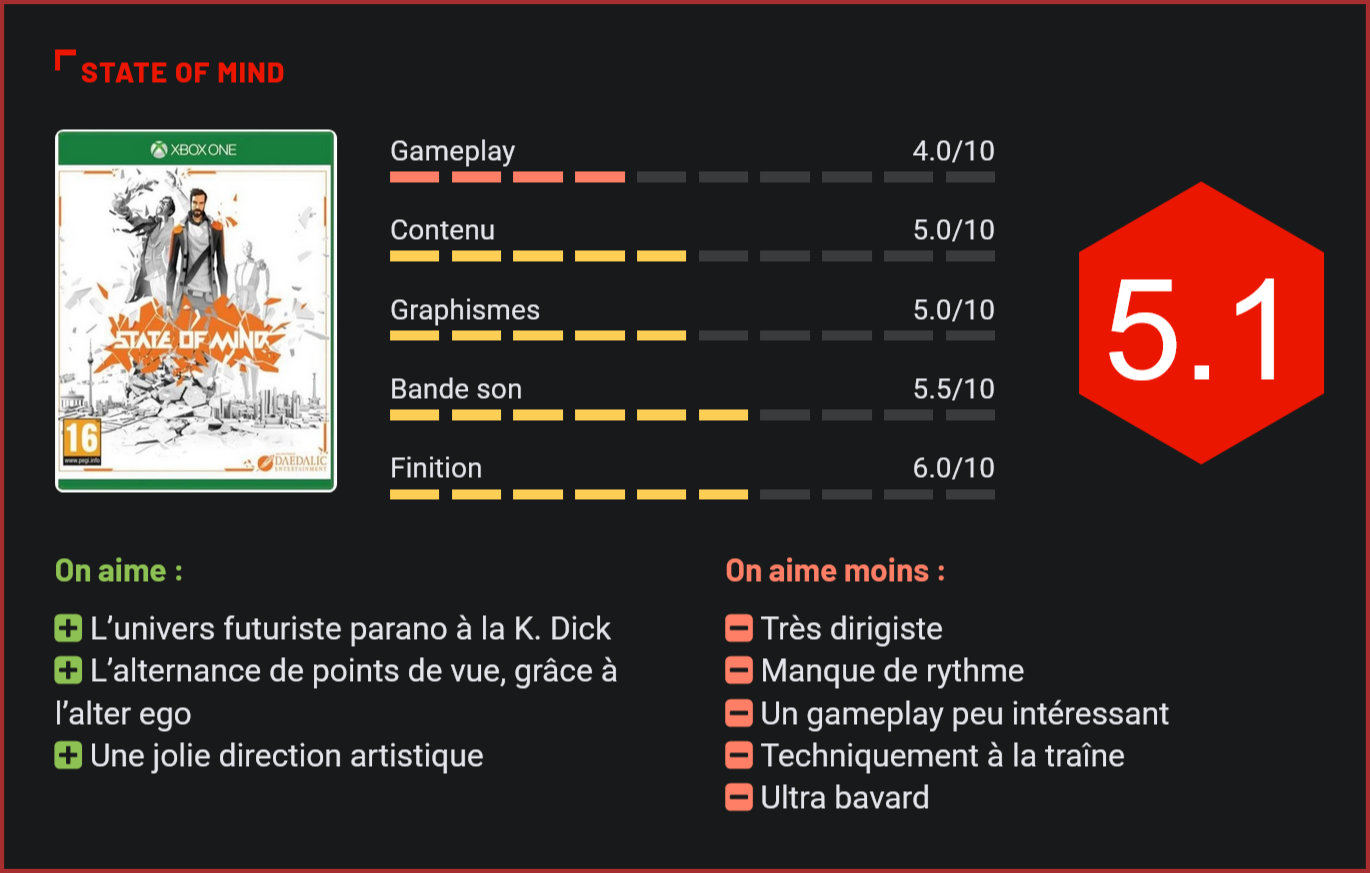 Issu du studio Daedalic (Deponia), State of Mind emprunte autant au point & click qu’aux œuvres de Philip K. Dick, le mètre-étalon en matière de science-fiction. Les ombres de Blade Runner, Total Recall ou même Minority Report planent sur State of Mind, récit interactif qui puise son inspiration dans les œuvres du maître de la science-fiction : Philip K. Dick. Le transhumanisme et la famille forment les deux mamelles de ce titre se déroulant en 2048. On est à Berlin et l’on suit les déboires de Richard Nolan, un journaliste ouvertement opposé à l’interconnectivité qui étouffe la liberté d’une grande partie de la population. Il faut dire que l’univers dystopique dans lequel il évolue fourmille de robots et d’IA en tous genre et que l’humain, lui, s’évade bien souvent dans des paradis virtuels. L’aventure débute lorsque Nolan, amnésique, se réveille à l’hôpital suite à un accident de voiture. Son fils et sa femme ont dès lors mystérieusement disparu et il va tenter de les retrouver en démêlant le vrai du faux. Le joueur prend donc le contrôle de Nolan et, bientôt, de Adam Newman, son alter ego évoluant dans un univers virtuel. A moins que ce ne soit l’inverse. Mais on n’en dévoilera guère plus sur les tenants et aboutissants de ce thriller SF paranoïaque sur fond de complot mondial. Se diriger et appuyer Connu pour avoir développé Les Chroniques de Sadwick, Deponia ou plus récemment Les Piliers de la Terre, Daedalic œuvre depuis plus de dix ans dans le point & click. State of Mind ne déroge pas à la règle, même si les développeurs ont ici ajouté une dimension « action ». Par « action » on entend que l’on déplace son avatar dans un environnement 3D, que l’on interagit avec les objets qui nous entourent (un second bouton nous permet aussi d’en obtenir une description, mais c’est bien souvent sans intérêt), que l’on participe à l’un ou l’autre mini-jeux (le pilotage de drone, notamment), que l’on fait le tri parmi des documents et que l’on peut switcher avec son alter ego. Le gameplay se limite à ces aspects et, la plupart du temps, on se contente de se déplacer en appuyant sur le bouton d’action pour interagir et ainsi faire avancer l’intrigue. Pas très excitant. On dispose aussi d’un semblant d’inventaire comprenant des objets (très peu sont à récolter) et des contacts téléphoniques que le script déclenche automatiquement ou qu’il nous met en gras lorsque l’on peut les appeler. State of Mind est en effet ultra dirigiste et vous laisse très peu de liberté, et ce ne sont certainement pas les quelques environnements confinés délimités par des murs invisibles ni les nombreux allers-retours maison-boulot qui changeront la donne. Les polygones du passé Le titre est très peu engageant, surtout lors des premières minutes, d’autant qu’il arbore une direction artistique tout en polygones qui divise. Sur les environnements, cela donne un cachet certain, mais sur les visages, il est difficile de s’extasier. Impossible de ressentir la moindre empathie pour des personnages inexpressifs au possible souffrant en prime d’un lipping à côté de la plaque. Techniquement, le bât blesse, avec des animations atrocement raides et une maniabilité flottante. On se croirait presque revenu dans les années 90, le titre nous rappelant d’ailleurs très brièvement The Nomad Soul, la variété du gameplay en moins. State of Mind se regarde et s’écoute (les voix des doublages – uniquement en anglais et en allemand – sont assez réussies) plus qu’il ne se joue. Quelque part entre le point & click et le jeu narratif à la Telltale Games, il contient d’innombrables bavardages à choix multiples, mais qui n’auront aucune réelle incidence sur les évènements qui suivront. Aussi amorphe que les PNJ qu’il croisera durant l’« aventure », le joueur regagnera un peu de vitalité lorsqu’il pourra alterner entre les deux personnages principaux afin de récolter et déchiffrer des fragments de données permettant de se remémorer des évènements du passé pour décoder le présent. Les parallèles ainsi effectués entre un monde réel sombre à souhait et un univers virtuel lumineux deviennent intéressants et nous raccrochent à l’histoire, qui monte subtilement en crescendo. La dernière partie devient alors plus trépidante mais il est déjà trop tard, dix petites heures se sont écoulées, durant lesquelles on s’est majoritairement ennuyé. Dommage. Conclusion State of Mind compose un thriller SF tout à fait honorable dans le fond. Sur la forme c’est en revanche une autre paire de manche avec une direction artistique qui divisera et un gameplay très pauvre. Tout juste regardable (à condition que l’on adhère à l’esthétique), il est assez pénible pad ou clavier en main. Entre le point & click et le jeu narratif, l’aventure se regarde et s’écoute plus qu’elle ne se joue véritablement, mais pour pouvoir vraiment l’apprécier, il faut faire preuve de patience. Gare à l’endormissement !