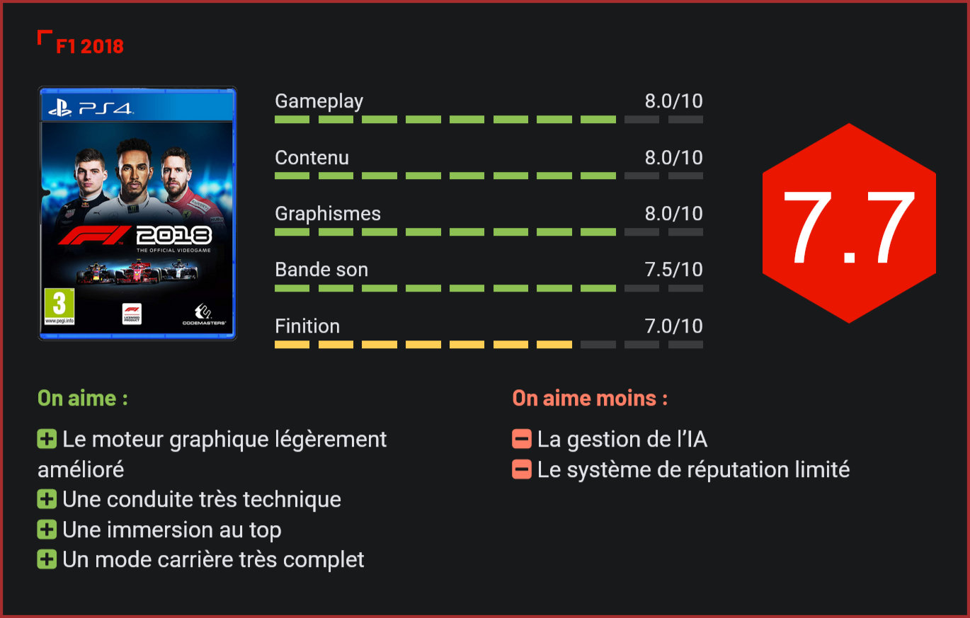 Pourvu de tout le contenu officiel de la saison de Formule 1 en cours et d’un mode carrière amélioré, le titre de Codemasters revient en forme cette année pour satisfaire les amateurs les plus exigeants de la reine des sports automobiles. Chaque fin d’année, c’est la même rengaine : le football (le soccer, mais aussi le foot américain), le basket et la formule 1, entre autres sports, reviennent dans des titres flambants neufs pour célébrer la nouvelle saison. Mais si les versions vidéoludiques des disciplines usant de ballons ronds peuvent la plupart du temps satisfaire un public large qui n’en est pas forcément adepte, les jeux de Formule 1, eux, s’adressent plutôt aux fans purs et durs de ce sport automobile aimant la simulation. Sans surprise, F1 2018 est plus beau que ses prédécesseurs. Le moteur du jeu affiche de très beaux rendus, que ce soit au niveau des lumières ou des textures, et l’ensemble tourne parfaitement en 4K 60 fps chez les joueurs équipés de PC, de Xbox One X ou de PS4 Pro. Très technique, le titre joue la carte de la simulation pure. La moindre sortie de route se paie cher et la maîtrise du frein est de rigueur. Les dégâts surviennent vite sur votre véhicule, demandant un passage obligatoire par le stand pour effectuer les réparations. De même, le moindre coup de volant brusque et c’est le dérapage assuré. Certaines aides au pilotage sont bien là pour les débutants, mais il faudra tout de même faire preuve de beaucoup de concentration et de patience avant de briller sur les circuits. La physique est donc très réaliste et ravira les plus tatillons, jusque dans les suspensions. L’immersion est totale, d’autant qu’il est possible de parler directement avec le staff technique via un casque, le jeu prenant en compte la reconnaissance vocale. Enfin, F1 2018 est plus riche, disposant de plusieurs modes. Outre les entraînements et championnats personnalisables, le gros morceau est le mode carrière qui vous demande dès son entame de choisir votre écurie (Ferrari, Mercedes, Aston Martin, Renault, McLaren, Alfa Romeo, Williams Racing ou encore Haas). Un arbre de compétences imposant apparait sous l’appellation du département R&D afin d’améliorer son véhicule grâce à de nouvelles pièces plus performantes. Les contrats peuvent pour leur part être renégocié en cours de route avec des bonus à la clé suivant l’expérience engrangée, et il est également possible de changer d’écurie. On conseillera d’ailleurs aux débutants de commencer par une des écuries les moins prestigieuses, les exigences étant moins hautes dans ces dernières. Bref, le mode carrière de F1 2018 est très riche et complet et il ne pâtit que d’un système de réputation relativement binaire qui est défini par les réponses que vous donnerez à la presse à l’issue des courses les plus importantes. En gros, soit vous choisissez des réponses qui flatteront votre écurie, soit vous vous la jouez perso. On constate au passage lors de ces séquences de dialogues que le lipping n’a pas été autant soigné que le reste. Dommage. On regrette également la gestion de l’IA qui n’hésite pas à vous coller aux pneus, sans pour autant être pénalisée pour cela. Par contre, si c’est vous qui allez au contact, la sanction sera immédiate. Une belle injustice. Pour éviter les joueurs « agressifs », le mode online prend en compte le fair-play de l’adversaire et réunit même les joueurs les plus appliqués dans des sessions qui leur sont dédiées. Bref, tout (ou presque) est réuni pour faire vivre aux passionnés de Formule 1 des sessions de jeu agréables et réalistes, en immersion totale. Conclusion F1 2018 est bien la simulation exigeante attendue par les fans. Complète, immersive et très technique, elle n’a à vrai dire pas d’équivalent dans ce domaine, si ce n’est son édition précédente. Les possesseurs de F1 2017 peuvent d’ailleurs conserver leur copie du jeu, le cru 2018 ne proposant pas de grosse révolution.