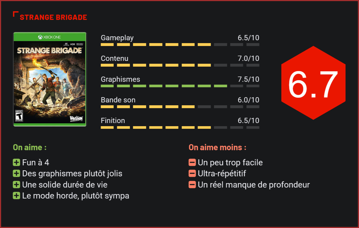 Tout droit sorti du studio Rebellion, auteur notamment de la série des Sniper Elite et du sympathique Zombie Army Trilogy, Strange Brigade était attendu au tournant par les amateurs de jeux coopératifs. Capable du meilleur (Sniper Elite) comme du pire (Shellshock 2), le studio britannique Rebellion s’était déjà essayé au FPS coopératif avec le sympathique Zombie Army Trilogy. Il récidive avec une nouvelle franchise qui emprunte plusieurs éléments de gameplay à Left-4-Dead tout en proposant une atmosphère inspirée de la franchise Indiana Jones. Décidément très en vogue, le FPS coopératif fait un retour en force. Inspiré de Left-4-Dead, Strange Brigade est le dernier représentant du genre du studio britannique Rebellion. Particularité du jeu : il abandonne la vue à la première personne pour une vue à la troisième personne, moins immersive mais qui offre un meilleur aperçu du terrain et plus de lisibilité. Bien qu’il propose une campagne solo, Strange Brigade est avant tout un titre multijoueur, qui se joue jusqu’à 4 en coop. Les joueurs sont ici envoyés sous la forme d’une brigade de chasseurs de trésors dans des environnements inspirés de films d’aventuriers, façon Indiana Jones. Sans surprise, les développeurs ont choisi l’Egypte comme destination principale. Plus surprenant en revanche, c’est le 20 ème siècle qui a été choisi. Pas de sulfateuse donc à l’horizon puisque le joueur ici devra principalement utiliser des armes blanches et fusils de chasse pour chasser les montres. Plus intéressant, Rebellion a ajouté une dimension compétitive à son jeu pourtant coopératif. Les joueurs devront en effet se lancer dans une véritable course aux âmes durant l’aventure. Tout en s’entraidant, ils tenteront de récupérer un maximum d’âmes des créatures abattues. Assez paradoxalement, si les ennemis sont plutôt nombreux et variés et le jeu mélange brillamment séquences de tir et énigmes, la lenteur des adversaires rend presque trop facile la progression. La plupart du temps, le joueur devra se contenter de courir à reculons tout en massacrant les hordes d’adversaires qui le poursuivent. Presque trop facile, Strange Brigade déçoit donc quelque peu au niveau de l’immersion et de l’action, pas aussi nerveuse qu’on l’aurait espéré. Les combats de boss viendront en revanche ajouter un peu de piment aux parties. Drôle, volontairement kitsch et plutôt fun, Strange Brigade est un divertissement plutôt réussi, qui parvient à séduire par son univers décalé et son aspect coopératif. Visuellement, le jeu est plutôt joli sans être extraordinaire. La bande son est soignée, la durée de vie suffisamment longue et plusieurs modes de jeu sont même au programme, dont un mode “Horde” qui proposera aux joueurs de survive le plus longtemps possible face à des hordes d’ennemis. Au final, difficile donc de lui reprocher quoi que ce soit, si ce n’est peut-être sa trop grande accessibilité. L’ennui, c’est que si Strange Brigade est un titre plutôt fun, il ne brille dans aucun domaine. Conclusion A défaut de faire forte impression, le nouveau jeu de Rebellion parvient à séduire grâce à son univers décalé, ses décors variés et son gameplay axé sur la coopération. Pour peu que vous ayez quelques amis avec qui parcourir l’aventure, vous devriez en avoir largement pour votre argent, d’autant plus que le titre est assez long. Efficace à défaut d’être brillant, Strange Brigade manque toutefois de ce petit quelque chose qui en aurait fait un hit. Trop facile, trop répétitif et sans doute pas assez marquant, le dernier bébé de Rebellion est typiquement le genre de jeu popcorn sur lequel on se jettera une fois le titre soldé.