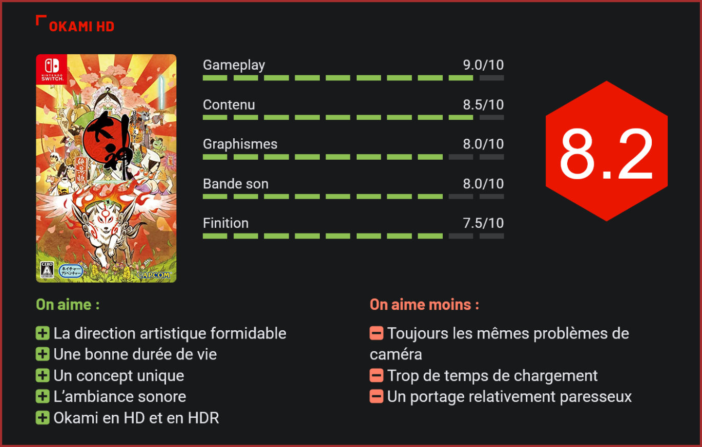 Après la Xbox One et la PS4, Okami HD débarque sur Switch. Rappelez-vous, en décembre dernier, Capcom nous livrait une refonte à la sauce HD d’Okami sur Xbox One et PS4. Près d’un an plus tard, le portage Switch arrive enfin. L’occasion de nous replonger dans l’univers grandiose d’Okami. Grosse surprise au moment de sa sortie en 2006, sur PlayStation 2, Okami reste un véritable classique du jeu d’aventure sur consoles, et un titre incontournable pour tout gamer qui se respecte. Car si le jeu de Capcom n’a pas connu le succès qu’il aurait mérité, Okami n’en reste pas moins un monument du jeu vidéo. Sorte de Zelda-like, à la sauce japonaise, Okami plonge le joueur dans un univers médiéval-fantastique qui s’inspire de la mythologie nippone et nous fait découvrir la formidable histoire d’Amaterasu, une louve-déesse qui va devoir accomplir un véritable périple pour sauver son monde d’une terrible destruction. Outre ses graphismes, inspirés des estampes japonaises, le jeu doit sa réputation à son gameplay unique, qui mélange séquences d’exploration, de plates-formes, de combats et dialogues, à la façon d’un Zelda, tout en ajoutant une dimension supplémentaire avec un “pinceau” qui permet au joueur de dessiner des formes qui prendront ensuite vie, ou de briser la garde des ennemis. En dessinant un trait, le joueur fera ainsi apparaître une corde qui lui permettra de traverser un précipice. En dessinant une boule dans le ciel, il fera apparaître le soleil, qui fera disparaître les ténèbres. Amusant, et drôlement ludique! Loin d’être un simple gadget, cette fonctionnalité représente véritablement l’épine dorsale du jeu, et donne à Okami une richesse insoupçonnée. Car tout au cours de l’aventure, le joueur apprendra à maîtriser de nouvelles techniques qui le rendra plus puissant et ouvrira de nouvelles portes en termes d’interactions. S’il est plus dirigiste qu’un Zelda, Okami n’en reste pas moins un titre très riche en contenu, qui propose son lot de quêtes secondaires, de mini-jeux et d’interactions. Pour le boucler, et à condition de ne pas se précipiter en ligne droite, il vous faudra au bas mot plus de 30 heures de jeu. 30 heures de pur bonheur dans un univers visuellement somptueux, qui, comme nous l’avons dit plus haut, s’inspire grandement de la mythologie japonaise, et se rapproche finalement davantage d’une œuvre d’art que d’un jeu vidéo. Un véritable voyage sensoriel qui vous fera vivre une expérience de jeu unique, dans un monde splendide. La bande sonore n’est pas en reste puisque celle-ci s’accorde parfaitement à l’univers fantastique d’Okami, et transporte littéralement le joueur dans un autre univers, le laissant sombrer dans un doux rêve d’esquisse nippone. Pour autant, si le jeu n’a que très peu vieilli, en grande partie grâce à sa formidable direction artistique, Okami HD conserve les défauts du titre originel, à savoir des angles de caméra pas toujours pratiques, des chargements trop nombreux, des dialogues parfois niais et des décors pas assez vivants. Certes, on aurait mal vu Clover nous livrer un remake complet du jeu, dix ans seulement après sa sortie, mais on aurait aimé que certains de ces défauts soient corrigés avec ce remaster. En l’état, le studio nippon nous livre un portage en bonne et due forme, à la sauce HD et surtout HDR, qui redonne à ce titre fantastique l’allure d’un jeu fraichement sorti des locaux d’un petit studio de développement indé. On appréciera – dans cette version Switch – les nombreux contrôles calqués sur ceux de la Wii en son temps, avec des contrôles aux sticks, avec les joy-cons détachés ou le pad pro. Capcom n’a pas oublié que la Switch est également une console tactile et le prouve avec des contrôles tactiles qui permettent de réellement s’immerger dans l’univers d’Okami. Les possibilités sont ici nombreuses et tout le monde y trouvera son compte. Parfaitement fluide, à 30 images par seconde, ce portage Switch s’en sort donc avec les honneurs, et surprend même agréablement, particulièrement lorsque l’on y joue en mode nomade. Le titre a en outre le mérite d’être proposé à un prix des plus compétitifs puisqu’il ne faudra débourser que 20€ pour en faire l’acquisition! Conclusion S’il ne présente que peu d’intérêt pour les joueurs qui avaient déjà terminé le jeu sur PS2, ce portage d’Okami permettra aux joueurs qui étaient passés à côté de ce monument du jeu vidéo de rattraper leur retard en redécouvrant l’un des meilleurs jeux d’aventure de ces 20 dernières années dans des conditions optimales, sur une console parfaitement adaptée à la prise en main particulière du jeu. Paresseux, le portage ne corrige malheureusement pas les quelques petits défauts du titre originel mais est proposé à un prix particulièrement compétitif.