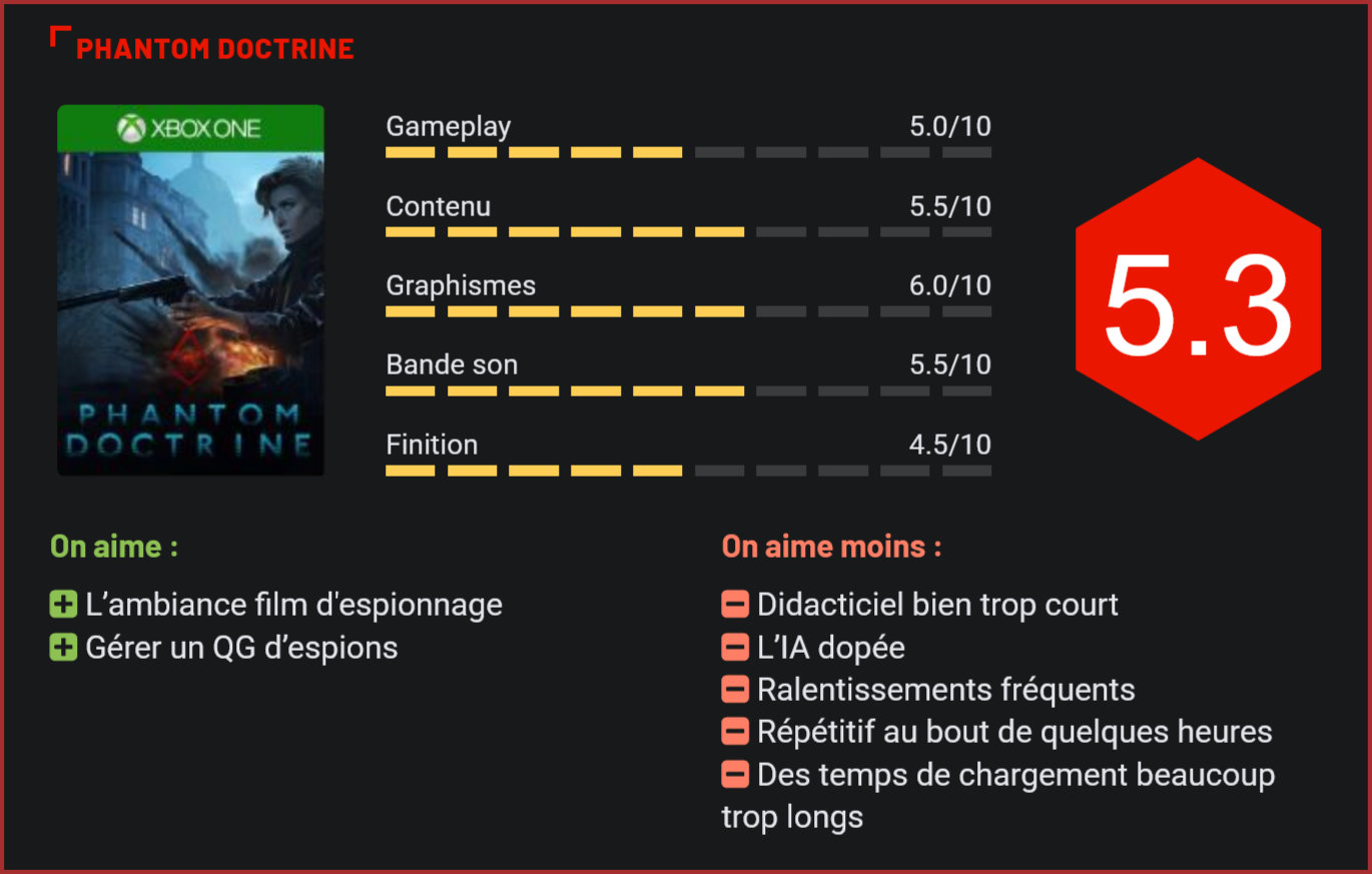 Avec Phantom Doctrine, le studio polonais CreativeForge Games réitère dans le jeu stratégique en mêlant ici aventure, réflexion et stratégie dans le contexte de la guerre froide. Espionnage, épluchage de documents, infiltration et combats au tour par tour au programme. Après l’espace (Ancient Space) et le Far West (Hard West), CreativeForge nous plonge avec Phantom Doctrine dans un thriller paranoïaque prenant place en pleine guerre froide. Nous sommes en 1983 et, à la tête d’une agence secrète nommée La Cabale, on doit déjouer les plans d’une organisation criminelle qui se fait appeler La Conspiration. Pour ce faire, il faut gérer sa base ainsi que son cheptel d’espions et mener à bien des missions allant de l’analyse de documents top secret à l’infiltration sur le terrain. Vous décidez d’entamer la partie soit dans les rangs du KGB, soit au sein de la CIA (le Mossad peut également être débloqué à la fin du jeu). Après une petite personnalisation de votre avatar, un court didacticiel vous apprend les bases de l’infiltration. Une fois la première mission sur le terrain achevée, on découvre alors toute l’étendue du gameplay, qui se déroule en trois grandes phases. Une planque à gérer La gestion de la base permet tout d’abord de recruter ses espions (attention aux agents double !), les assigner à différentes missions ou encore bien sûr gérer leur équipement et leurs capacités. Depuis une carte mondiale, on envoie nos espions en repérage et en mission, on surveille le temps qui s’écoule et on garde surtout un œil sur une jauge de menace indiquant lorsque La Conspiration est sur le point de découvrir la localisation du repère depuis lequel on opère. Lorsque la jauge est pleine, c’est le game over. Il faudra donc redoubler de prudence pour ne pas compromettre l’identité de ses agents (un changement de papiers peut y remédier), saboter les plans adverses et régulièrement déménager son QG (moyennant argent) pour éviter d’être démasqué. Le sentiment d’urgence est bien présent et l’on sent bien qu’un complot tentaculaire est en cours. Des dossiers à lire Depuis la base, il est également possible, et même indispensable, d’analyser les documents obtenus lors des missions. C’est la deuxième grande phase de jeu de Phantom Doctrine, consistant à scruter des dossiers confidentiels épinglés sur un tableau en liège. Concrètement, il faut y trouver des noms de code et divers lieux d’opérations secrètes en les surlignant dans un texte. Une fois ces mots-clés découverts, on peut les relier à ceux des autres documents à l’aide de punaises et de ficelle. In fine, cela permet d’établir une nouvelle cible et de faire avancer l’enquête. L’idée est de prime abord sympathique et nous ramène à ces bons vieux films d’espionnage, mais au bout de quelques heures de jeu on finit par s’en lasser et à les expédier en cliquant un peu partout dans les textes pour faire sortir les codes des lignes de textes. Dommage. Des missions à subir Façon XCOM, on a enfin les missions sur le terrain, comprenant infiltration et combats au tour par tour. On doit y envoyer quelques hommes (et femmes) pour dénicher des documents, kidnapper un ennemi, libérer un informateur ou encore désamorcer des bombes. Si des combats sont possibles, la furtivité est recommandée tant l’IA s’avère redoutablement…mal équilibrée. Faites-vous repérer et celle-ci trouvera le moyen de trouver la brèche la plus minuscule qui soit pour vous tirer dessus entre deux bâtiments. Même bien planqué, les ennemis parviennent trop souvent à vous toucher avec leurs tirs. Franchement rageant. Il est néanmoins tout à fait possible de s’en sortir une fois les renforts appelés car vous disposez de nombreuses actions telles que la neutralisation discrète, les rafales de fusil, les tirs en pleine tête, le lancer de grenades ou encore les exécutions simultanées. Mais pour que tout cela soit un tantinet jouissif, il aurait fallu que le jeu affiche des informations quant aux angles de vue des ennemis et aux lignes de tirs. En l’état, on subit plus ces phases de combats plutôt que de les mener avec excitation, d’autant qu’il faut composer avec un système peu convaincant faisant intervenir des points d’acuité pour effectuer les diverses actions. Ajoutons également de nombreuses incohérences côté infiltration (des gardes qui ne vous voient pas alors que vous passez devant eux, le fait de sauter à travers une vitre sans que cela n’attire l’attention d’un ennemi proche, etc.). Bref, on est loin de Shadow Tactics, l’un des modèles récents du genre. Il faut aussi spécifier que presque toutes les mécaniques de Phantom Doctrine, on les découvre un peu à ses dépends puisque le très court tutoriel présent en début de partie ne montre qu’une partie de l’essentiel. Pour tout ce qui est de la gestion du QG, il faut tâtonner, lire les bulles d’information rébarbatives parfois présentes, voire cliquer un peu partout pour voir ce qu’il va se produire et trouver, par exemple, qu’il est possible d’interroger ses agents pour leur obtenir de nouveaux types d’entraînements. Côté technique, le jeu n’est pas très bien loti non plus avec de nombreux ralentissements lorsque la caméra se déplace, des temps de chargement longuets et des cinématiques qui font la grimace avec des textures et des visages figés. Heureusement, les missions sur le terrain sont plus détaillées avec des personnages et des éléments de décor de bonne facture. C’est dès lors dommage que le level design soit un peu trop redondant d’une map à l’autre. Conclusion Malgré son joli potentiel, Phantom Doctrine finit par lasser au bout de quelques heures. L’enquête patauge alors, et plutôt que de s’enflammer à l’idée de décortiquer des dossiers ultra secrets, on clique à outrance pour en finir le plus