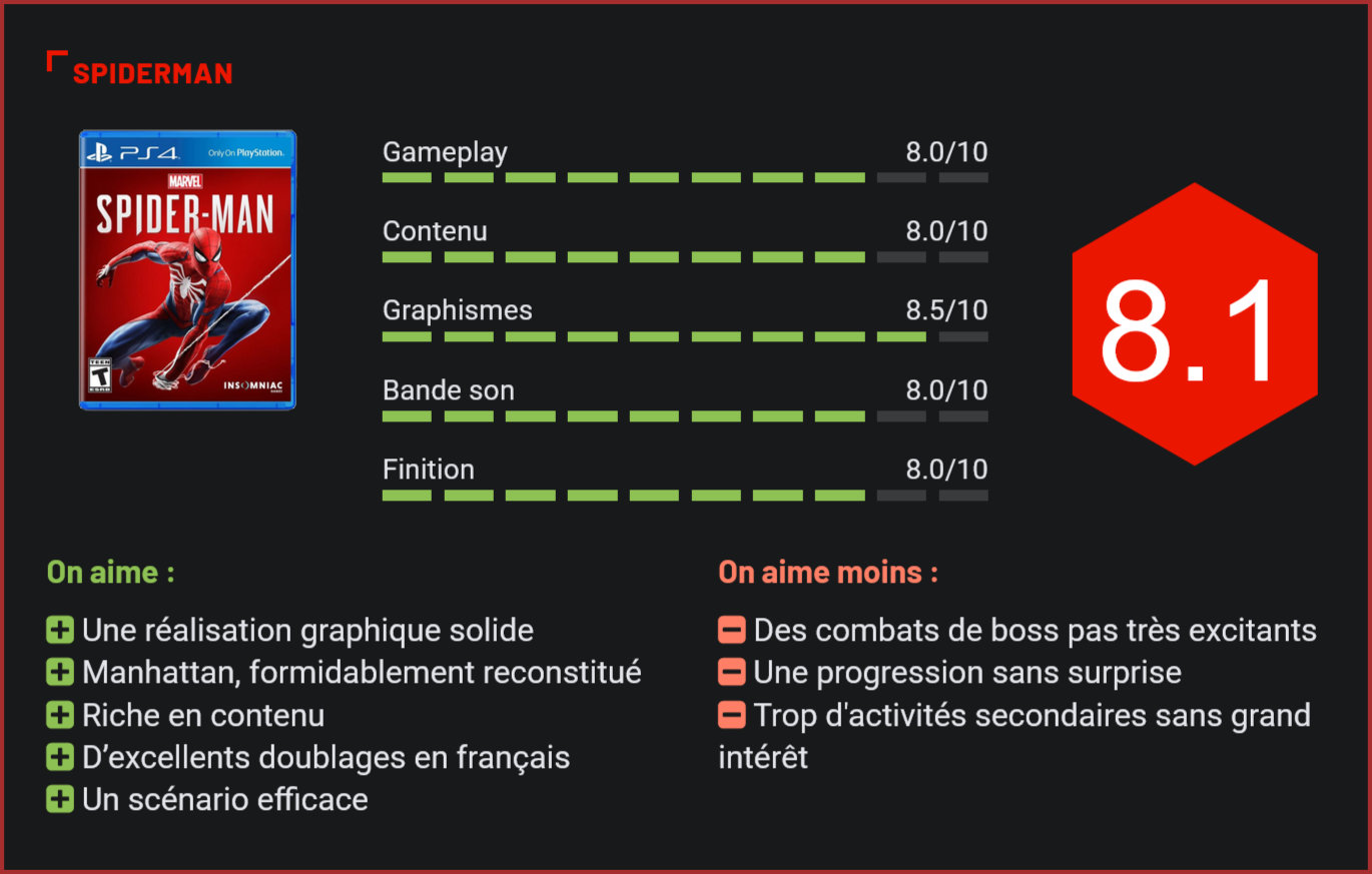 Confiée aux petits gars d’Insomniac (Ratchet & Clank, Sunset Overdrive), la nouvelle adaptation de Spiderman était attendue au tournant par les fans de l’univers Marvel. Il faut dire qu’à l’inverse des DC Comics, les superhéros Marvel n’avaient jamais eu droit à une adaptation digne de ce nom sur le petit écran. Aussi ambitieux que la trilogie Batman de RockSteady, le Spiderman d’Insomniac est – à l’image de la plupart des “AAA” – un titre qui se déroule en monde ouvert. Exit donc la progression en ligne droite puisque le joueur pourra ici choisir les missions qu’il accomplira et pourra très bien choisir de se promener dans les allées d’un Manhattan plus vrai que nature s’il le souhaite. La richesse du titre vient toutefois du fait qu’à l’image du Batman de RockSteady, Spiderman propose un véritable fil conducteur. L’histoire principale – qui n’est pas tirée des films mais vue davantage comme un complément – poussera le joueur à travers une intrigue haletante, tout en le faisant croiser de nombreux personnages connus de l’univers de Spiderman. Spiderman ne fait toutefois guère preuve d’originalité au niveau de sa construction, alternant phases d’exploration, combats de boss, séquences musclées, d’infiltration et mini-jeux à tour de bras, et usant et abusant même un peu trop de ses séquences hyper-scriptées. Le talent d’Insomniac, c’est d’être parvenu à dissimuler un jeu banal derrière de jolis artifices : en l’occurrence, une mise en scène terriblement dynamique. Spiderman n’a rien à envier aux plus grosses production du moment. Et c’est là ce qui fait tout son charme. On a l’impression de prendre littéralement part au Marvel que l’on a l’habitude de voir sur grand écran. Tout ici, respire le cinéma. Des dialogues savoureux aux angles de caméra audacieux, en passant par les QTE – inévitables dans les combats de boss -, Spiderman est un ode aux superproductions hollywoodiennes. Cantonner le talent d’Insomniac à un simple travail de portage serait toutefois une grossière erreur tant Spiderman a également de contenu à offrir sur le plan ludique. Tout d’abord, parce que le jeu parvient à retranscrire brillamment les sensations de survol de Spidey dans Manhattan. Le joueur se sent ici libre comme l’air. Il peut se laisser glisser d’un immeuble à l’autre, grimper le long des façades d’immeubles ou marcher en rue, auquel cas les fans de Spiderman se feront un plaisir d’interagir avec lui en se photographiant à ses côtés ou en lui faisant un joli high 5. Nerveux, les combats pousseront également le joueur à faire preuve d’audace au niveau du gameplay en alternant envolées, esquives, gadgets et coups. On notera d’ailleurs que la panoplie de superhéros de Spidey est plutôt bien fournie et le personnage a droit à son lot de coups. Loin d’être un simple beat them all dans ses phases de combat, Spiderman se transforme en un véritable jeu d’action, proposant des scènes de combats musclées et jouissives. Le constat est un poil moins positif en ce qui concerne les combats de boss. Insomniac a ici fait preuve d’un peu moins d’originalité que RockSteady, s’évertuant à forcer le joueur à éviter les attaques des différents boss pour répliquer pratiquement à chaque fois de la même façon avant de donner le coup final dans une scène QTE. Un peu plus d’originalité n’aurait pas fait de mal. Autre déception : en dépit de sa diversité, Spiderman fait preuve d’une certaine répétitivité dans sa construction et a la fâcheuse tendance à proposer trop de mini-jeux… qui n’ont rien de vraiment exceptionnel. On aurait sans doute préféré qu’Insomniac laisse cet aspect de son jeu au placard. A l’inverse, le gain de nouvelles compétences par le système d’arbre permet au joueur d’adopter son propre style dans les combats en favorisant les combats au corps à corps ou les cabrioles. Autre point fort du jeu : les collectibles et nombreux costumes à collecter, qui permettront au joueur de débloquer à chaque fois un pouvoir propre, associé au costume. Enfin, difficile de ne pas évoquer la réalisation graphique du jeu, somptueuse à tous les niveaux. Visuellement, Spiderman n’a rien à envier aux autres grosses productions du moment. Les animations sont d’un réalisme troublant, les effets visuels superbes et le niveau de détails tout simplement impressionnant. Il suffit de laisser Spidey se promener sur les vitres d’un immeuble pour se rendre compte du soin apporté à la modélisation des intérieurs des buildings. Au niveau de sa durée de vie non plus, le jeu d’Insomniac ne déçoit pas avec son lot de missions secondaires et ses 20 à 30 heures de jeu pour boucler la campagne solo. Pas de doute, vous aurez largement de quoi faire! Une petite note toutefois à l’égard de ceux qui n’ont jamais craqué pour Spidey : aussi réussi soit cet épisode, si l’humour, l’univers et le personnage de Spiderman n’ont jamais été votre tasse de thé, ce n’est pas cet épisode qui y changera quelque chose. Spiderman, sur PS4, s’adresse avant tout aux fans de l’homme araignée. Et c’est d’ailleurs cette fidélité extrême au matériau d’origine qui en fait un titre d’une richesse étonnante. Seul regret pour les fans : les rencontres avec les grands vilains de Spiderman sont peu nombreuses et quelques grands absents sont à noter… Dommage. Conclusion Attendue au tournant, cette nouvelle adaptation de Spiderman en jeu vidéo ne décevra pas les fans de l’homme araignée. Aussi brillant que le Batman de RockSteady, le Spiderman d’Insomniac offre une expérience d’une rare fidélité au matériau d’origine. Riche en contenu, le jeu d’Insomniac est également une jolie claque graphique et une très belle exclusivité pour la console de Sony. En revanche, si l’homme araignée n’a jamais été votre da