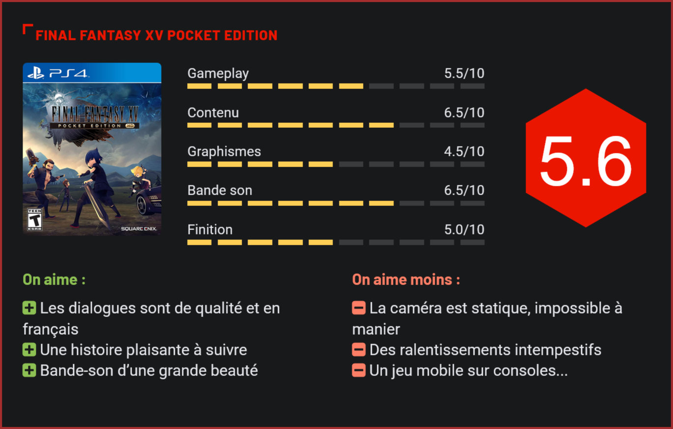 Initialement conçu pour sortir sur smartphones, Final Fantasy XV : Pocket Edition HD a aujourd’hui droit à une sortie sur Xbox One, Switch et PS4. Un portage étonnant pour ce titre déjà adapté d’un jeu console, mais pas forcément nécessaire. On peut se demander ce qu’il s’est passé dans la tête des développeurs pour porter l’adaptation d’un jeu console sur mobiles sur consoles de salon. Le contraire est beaucoup plus fréquent, d’autant que dans ces cas-là, les jeux sont adaptés aux conditions de jouabilité d’un smartphone. On rappellera d’ailleurs que Final Fantasy XV Pocket Edition est déjà l’adaptation mobile de FF XV, sur console. Road Trip et Mousquetaires Pas de gros changements par rapport à la version smartphone, si ce n’est que les 10 chapitres sont rassemblés sans devoir passer par la caisse comme c’était le cas sur mobile. Une partition par épisode qui se chiffrait à une vingtaine d’euros pour le jeu complet. Un prix assez important pour un jeu mobile et son portage ne compte pas être plus accessible. En effet, il faut tout de même compter une trentaine d’euros pour ce titre. Pour ce qui est de l’histoire, la trame narrative reste fidèle à la version Pocket Edition, qui était lui-même fidèle à l’original sur console. Vous suivez ? On incarne le Prince Noctis qui est sur le départ pour épouser la Princesse d’un royaume lointain, une union qui devrait permettre de repousser les attaques de Niflheim. Un long périple attend le Prince, mais il pourra compter sur ses trois camarades Gladio, Prompto et Ignis pour affronter les difficultés du trajet, qui seront nombreuses. Une version moderne des Trois Mousquetaires sous fond de road trip. Combats en temps réels Durant son voyage, les 4 acolytes pourront réaliser diverses missions secondaires et résoudre quelques énigmes. De quoi casser le rythme linéaire de l’histoire principale et augmenter la durabilité du jeu (une douzaine d’heures). L’exploration sera assez mince en comparaison de la première version sortie sur consoles. La prise en main est simple, mais reste agréable. Beaucoup plus limité, le joueur pourra tout de même se promener dans les paysages cartoonesques de cet opus, collecter des objets sur le sol et combattre des monstres sauvages, dans la pure tradition de la saga Final Fantasy. À noter que les ennemis seront visibles sur la carte et qu’on pourra, selon les envies, les éviter ou les combattre. Pour ce qui est des affrontements justement, la chose se fera en temps réel et dans un espace délimité dès le lancement du combat. Tout le monde tape tout le monde en essayant d’esquiver l’une ou l’autre offensive ennemie. Dans Pocket Edition HD, pas question de menus d’attaques, il faudra retenir les techniques de chacun, quitte à appuyer sur n’importe quelle touche durant le combat. En fonction de l’expérience et des points de compétences acquis, on pourra renforcer nos petits compagnons. À noter qu’il sera possible d’esquiver l’une ou l’autre attaque ennemie. Un aspect qui avait certainement sa place sur smartphone et dans sa version tactile, mais sur console, les réflexes sont moins mis à épreuves. Le nombre d’ennemis à l’écran peut parfois poser problème et rendre les combats brouillons. Il est facile de perdre de vue son personnage tant la caméra peine à s’aligner dessus lors des déplacements rapides. Un univers tout mignon Malgré tout le jeu reste agréable à jouer. On notera que les personnages et les dialogues se font en français, avec des intonations de voix et des jeux d’acteurs de qualité. Visuellement, le portage a respecté l’esthétique originelle avec des personnages aux têtes disproportionnées. Les décors sont relativement dépouillés, sans être immondes. Cela peut faire mal aux yeux quand on a joué à Final Fantasy XV sur consoles… Ici, on a l’impression de tester un jeu indépendant à l’identité esthétique particulière. Heureusement, on s’y fait assez rapidement et l’exploration reste plaisante. On notera également la bande-son, signée Yoko Shimomura, absolument magnifique et parfaitement fidèle à ce qui se passe à l’écran. En définitive, difficile de couler le jeu tant le concept reste sympathique. Toutefois, autant Pocket Edition avait son sens sur smartphones – et peut être sur Switch -, autant il est difficile d’être convaincu du portage sur Xbox One et PS4. Seuls les fans purs et durs de la franchise y trouveront un réel intérêt. Conclusion Avec ce portage, Square Enix boucle la boucle des adaptions de Final Fantasy XV. Une aventure agréable, fidèle à l’esprit de la saga, dans une version beaucoup plus mignonne. On se demande tout de même la raison de ce portage puisque Pocket Edition HD n’apporte rien de nouveau par rapport au jeu sorti sur mobile. Une adaptation un peu simpliste, bien que sympathique, qui reste tout de même assez chère puisque le jeu est disponible sur console pour une trentaine d’euros…