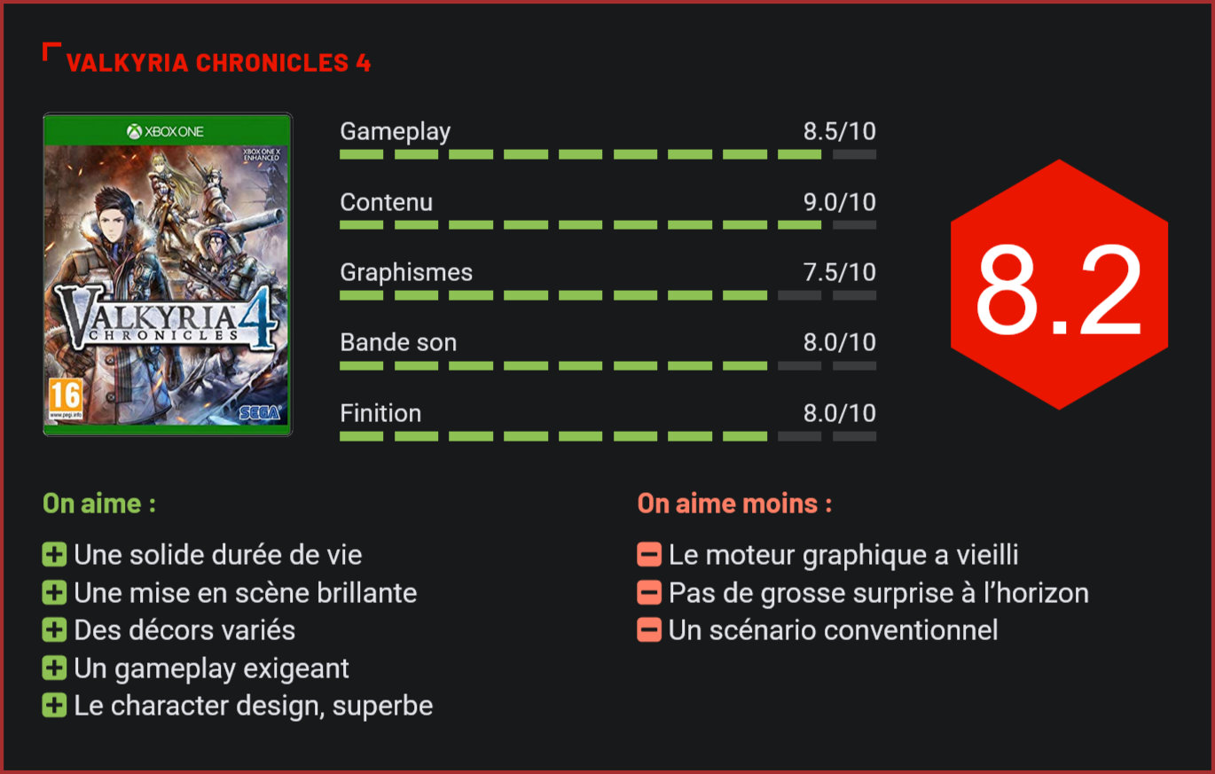 Après le très décevant Valkyria Revolution, Sega tente de redonner un souffle à une franchise que l’on pensait définitivement enterrée. Jamais sorti en Europe, Valkyria Chronicles 3 avait enterré tout espoir de voir un jour la série renaître de ses cendres en Occident. En 2017 pourtant, Sega nous livrait un spin-off de la franchise, disponible sur presque toutes les plates-formes. Malheureusement, le titre était loin d’être aussi bon qu’on l’aurait espéré. Les ventes désastreuses de ce volet conduiront de nombreux fans à tirer des conclusions alarmistes sur la viabilité de la franchise. Mais c’était sans compter sur le succès des rééditions des deux premiers volets sur Steam et PS4, qui poussèrent Sega à annoncer un quatrième volet sur presque toutes les plates-formes, début 2018. Et, bonne nouvelle pour les fans, Valkyria Chronicles 4 tient toutes ses promesses. Le jeu de Sega reprend l’ADN de ses ancêtres, sans jamais trahir ses origines. Les fans seront ici en territoire connu. Les autres découvriront un jeu de stratégie au tour par tour d’une richesse impressionnante. Beaucoup plus stratégique que la plupart des tactical-RPG que l’on trouve dans le commerce, Valkyria Chronicles exige une bonne dose de concentration de la part du joueur, qui devra prendre en compte de nombreux facteurs pour remporter la partie. Avec un nombre d’unités limité, il devra éliminer les forces ennemies présentes sur le terrain de jeu. Comme dans les précédents volets de la série, l’environnement joue ici un rôle central puisque les décors et les conditions météorologiques sont les deux principaux facteurs à prendre en compte dans les affrontements. Contrairement aux autres tactical, Valkyria Chronicles met en scène des unités équipées d’armes à feu – et non pas d’armes blanches. Par conséquence, la plupart des affrontements se font sur de longues distances. Snipers, grenadiers, chars et fantassins devront être déployés de façon intelligente sur le terrain. Les couvertures joueront ici un rôle central dans la résolution des missions. Très stratégiques, les affrontements nécessiteront beaucoup d’attention de la part du joueur, qui devra étudier les déplacements adverses et réagir en fonction de ceux-ci, en contrant ses mouvements avec les bonnes unités et en mettant en place des combinaisons complexes. Valkyria Chronicles 4 est toutefois plus accessible que ses ancêtres. D’une part, parce que déplacer certaines unités est désormais moins « coûteux » que par le passé. Il est ainsi beaucoup plus simple de déplacer son char sur le terrain de jeu. D’autre part, parce que Sega a sensiblement changé les règles de jeu, permettant par exemple à un sniper de riposter à un tir pendant le tour de jeu adverse. Le jeu gagne énormément en fluidité et en dynamisme. Au niveau des unités, Sega introduit deux nouveautés dans ce quatrième volet : le cuirassé, qui offrira un support efficace à vos troupes sur le terrain en pilonnant les positions adverses, et l’artilleur, un fantassin qui est capable de tirer des mortiers sur les positions adverses, qui vient ajouter une dose de complexité au jeu. Cette unité permet en effet de toucher des adversaires planqués, qui étaient jusqu’ici impossibles à déloger. Pour le reste, pas de grosse surprise à l’horizon. Le scénario du jeu s’inscrit dans la continuité des précédents volets, en proposant toujours de s’immerger dans le conflit qui oppose l’Alliance Impériale et la Fédération Atlantique – il ne faudra pas chercher bien loin pour trouver l’inspiration… -, un système d’évolution des personnages basé sur l’expérience acquise sur le terrain, des combats de boss haletants, une mise en scène d’un dynamisme racoleur et des cartes particulièrement bien imaginées qui forceront le joueur à se creuser la tête pour tirer parti de leur verticalité et de leur profondeur. Si le scénario du jeu reste très banal, Valkyria Chronicles peut se targuer de proposer une expérience de jeu très riche avec son gameplay complexe et son système de perma-death. Une unité abattue qui n’a pas été soignée dans les quatre tours suivant sa mise au tapis quittera définitivement l’aventure… Exigeant, Valkyria Chronicles séduit par sa complexité. N’espérez d’ailleurs pas le plier en quelques heures. Le jeu de Sega fait partie de ces titres qui exigent de s’y plonger durant des dizaines d’heures pour voir le bout de l’aventure. On appréciera au passage les nombreux collectibles à récupérer, la présence d’un Season Pass, qui promet une durée de vie à rallonge, et le très gros travail de Sega sur les compositions musicales et bruitages. Visuellement, Valkyria Chronicles 4 s’en sort également très bien sans forcément briller. Difficile d’un côté de ne pas être séduit par le moteur graphique du jeu, ses décors en cell-shading et ses personnages attachants. D’un autre côté, le moteur du jeu a très mal vieilli et Valkyria Chronicles 4 tient difficilement tête aux grosses productions les plus récentes. Certes, son esthétique conserve un charme certain, mais on est très loin des résultats que l’on est en droit d’attendre sur Xbox One ou PS4. Au final, s’il n’est probablement pas aussi rafraîchissant que le premier volet, ce quatrième épisode de la série tient toutes ses promesses et s’impose comme une suite très aboutie, dans la continuité directe du troisième volet. Pas de grosse surprise à l’horizon pour les fans, mais un épisode qui délivre exactement ce qu’on attendait de lui et qui redonne ses lettres de noblesse à une franchise que l’on pensait enterrée avec la sortie de Valkyria Revolution… Conclusion S’il ne surprend pas, ce quatrième volet de la série redonne ses lettres de noblesse à une franchise que l’on pensait définitivement enterrée depuis la sortie de Val