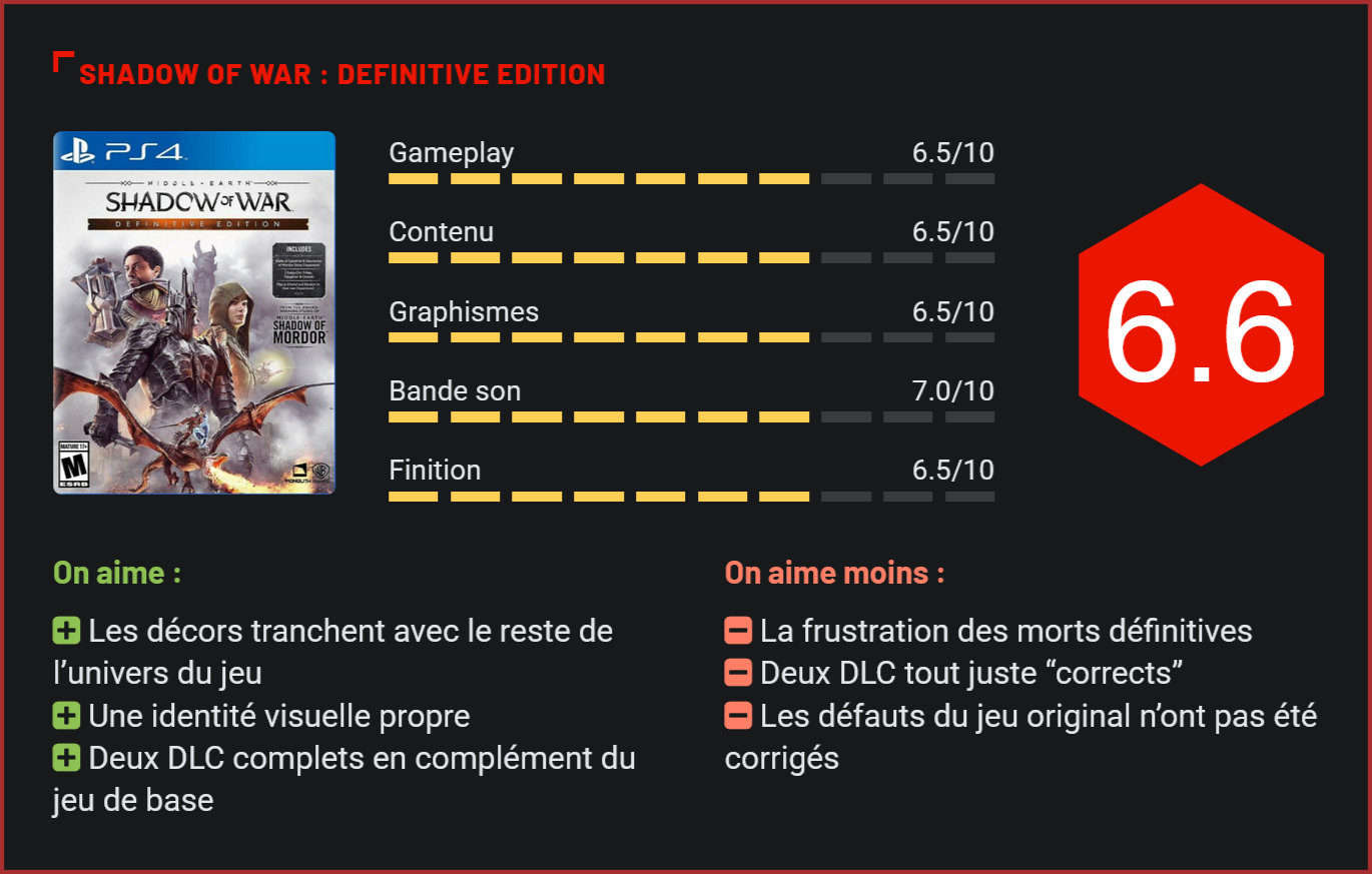 Le studio Monolith revient avec une nouvelle édition de L’Ombre de la Guerre. L’occasion pour le studio de rassembler l’ensemble des DLC et améliorations apportées à son titre un an après la sortie de l’original. Mais au-delà de ça, cette Definitive Edition offre-t-elle vraiment quelque chose de nouveau ? Avec cette nouvelle édition, les retardataires et autres fans de la saga pourront revivre les aventures de Talions, héros hanté par l’esprit d’un elfe puissant, Celebrimbor. Une édition qui se veut complète, intégrant les mises à jour ajoutées à la version de base, mais qui a tout de même du mal à proposer du neuf. Pour rappel, L’Ombre de la Guerre est la suite directe de L’Ombre du Modor, sorti en 2014. Reprenant l’univers médiéval fantastique du Seigneur des Anneaux, le jeu propose de se plonger dans l’univers créé par Tolkien. À la sortie du deuxième volet, les retours ont été mitigés, malgré un univers intéressant, l’expérience n’était pas forcément une réussite. Vous pouvez d’ailleurs lire notre test ici. Le plus intéressant reste tout de même les deux extensions jouables qui proposent chacune d’incarner un personnage à part entière, à travers une aventure propre. La Lame de Galadriel La première extension se concentre sur le personnage d’Eltariel, personnage déjà aperçu dans la trame principale, aux côtés de Talion. Bien qu’elle se montre forte et courageuse, cette version elfique du personnage principal n’en reste pas moins une pâle copie. Arborant l’anneau de Celembrinbor, Eltariel se voit confier une mission par la Reine Galadriel elle-même : combattre les Nazguls. Moins compétente que Talion, l’elfe dispose tout de même d’une arme redoutable pour vaincre ses ennemis, la Lumière de Galadriel. Un pouvoir qui lui permet d’étourdir ses ennemis et de les immobiliser, lui laissant le temps de les faire disparaitre en un seul coup, dans un nuage de lumière. Une attaque spectaculaire, d’autant que celle-ci peut contaminer tout un groupe à proximité. Une attaque qui a le mérite de trancher lumineusement avec son environnement terne et lugubre. Malheureusement, le recours à la Lame de Galadriel se montre rapidement répétitif, malgré l’utilisation de quelques variantes : projection de rayons lumineux, flèches de lumière et pièges de lumière. Autre aspect négatif, l’absence du système Nemesis complet, l’essence même de ce qui a fait le succès de la saga. Pas de domination des ennemis, pas de gestion d’armée, ni d’envoi de mission ou de siège. On se retrouve face à un jeu d’action banal comparé à la trame narrative principale. C’est dommage. L’aventure d’Eltariel continuant, les acolytes rencontrés seront nombreux, malheureusement les alliances seront de courtes durées. Ceux-ci viendront renforcer les défenses lors du siège d’une forteresse ou gonfler son armée lors d’une attaque, avant de disparaitre. Au final, Eltariel se retrouve plus souvent seule que Talion, sans pouvoir dominer de nouvelles proies, ni de nouveaux haut capitaine. Heureusement, celle-ci peut se soigner seule, à condition de ne pas se faire attaquer durant ces quelques secondes nécessaires. Des combats épiques On retrouve tout de même plusieurs combats épiques contre des boss, notamment les Nazguls. Des affrontements qui n’ont rien à envier à la trame principale, de par leur difficulté similaire, mais aussi leur force narrative. D’ailleurs, chaque combat réussi lancera une cinématique sur les origines des Nazguls. De quoi apporter une vraie identité et un vrai intérêt à ce DLC. Au final, La Lame de Galadriel apporte un vrai plus scénaristique à l’Ombre de la Guerre. D’une durée approximative de 6 heures, elle offrira au joueur la possibilité d’affronter près d’une douzaine d’Uruks légendaires qui lui permettront de mettre la main sur différentes pièces d’une amure tout aussi légendaire. Malheureusement, pour ce qui est des combats, ce chapitre se montre beaucoup moins intéressant tant il se répète. L’excitation des combats se limite justement aux attaques lumineuses qui, parfois, se montrent insuffisantes contre les ennemis, forçant le joueur à faire appel au bon vieux coup d’épée. La Désolation du Mordor Direction la forteresse de Minas Ithil pour incarner le capitaine de la garde Baranor, un véritable humain cette fois. Un point qui influence forcément les compétences et possibilités de jeu. Dans ce DLC, l’objectif principal sera également de mener ses troupes à travers le désert de Lithlad jusqu’aux lignes ennemies. L’aventure prend donc place dans un désert, un lieu de choix qui vient contraster l’univers dans lequel le joueur avait l’habitude de progresser avec Talion et L’Ombre de la Guerre. Mais ce lieu est tout aussi inamical avec les « Mange-terres », des énormes vers de sable absolument horribles qui n’auront qu’une envie : goûter à la chaire de notre Baranor. Pas d’anneau ni de pouvoirs spéciaux, la mort est donc définitive. Un élément très intéressant au niveau du gameplay, mais qui amènera également un peu de frustration. En effet, chaque mort obligera le joueur à recommencer tout ce qu’il avait entrepris. Enfin, presque. Les quêtes/histoires terminées le resteront et les équipements seront conservés, fort heureusement. En revanche, les compétences acquises, les mercenaires engagées et les avant-postes maitrisés seront tous réinitialisés. Pas question de foncer tête baissée dans les hordes d’ennemis donc. La progression se fera en fonction des terres récupérées, grâce aux avant-postes conquis jusqu’à arriver à la forteresse. La vitesse à laquelle le joueur progressera sera un élément important quant à l’attribution des points. Plus on va vite, plus on a de points. Côté compétences, notre cher capitaine humain se rapprochera plus d’un Ezio Audito