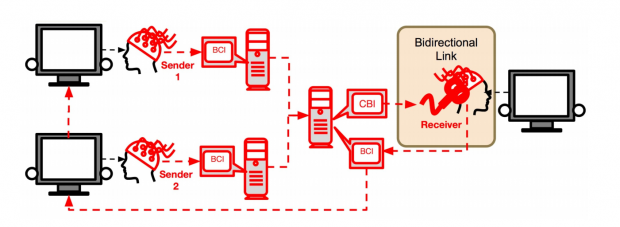 Non, ce n’est pas de la science-fiction, des chercheurs sont bel et bien parvenus à mettre en réseau trois cerveaux humains. La connexion permettait à ces personnes de s’échanger certaines pensées. La communication entre l’homme et la machine, la connexion cérébrale, tout cela fait désormais partie du présent. Une équipe de chercheurs de l’Université de Washington menée par Andrea Stocco ont mis au point le réseau BRAINnet. Celui-ci permet à trois personnes de se connecter les unes aux autres et de partager ensemble certaines idées basiques. Le dispositif fonctionne à l’aide d’un électroencéphalographe qui enregistre l’activité électrique du cerveau émetteur. Le signal est transmis via des électrodes disposés sur le crâne et est ensuite transmis au cerveau récepteur après avoir été décodé par un casque de stimulation magnétique. Un tel réseau avait déjà été utilisé par la même équipe cinq ans plus tôt, mais c’est la première fois que les cerveaux de plus de deux personnes sont raccordés. 3 cerveaux pour une partie de Tetris Le réseau cérébral a été testé sur Tetris. Trois volontaires étaient installées dans des pièces séparées sans la moindre informations sur ce que chacun faisait, seul un écran leur permettait de suivre le jeu. Deux d’entre eux étaient chargés de transmettre au troisième les commandes à effectuer. L’expérience a été reconduite avec cinq groupes différents et s’est avéré une réussite dans 81% des cas. Les chercheurs voient déjà beaucoup plus loin et espèrent à l’avenir pouvoir y connecter plus de monde et permettre un échange d’idées plus complexes. Les scientifiques estiment qu’il sera tout à fait possible de relier des cerveaux depuis une simple connexion internet via une “interface de cerveau à cerveau hébergée sur un serveur cloud” en guise de système central.