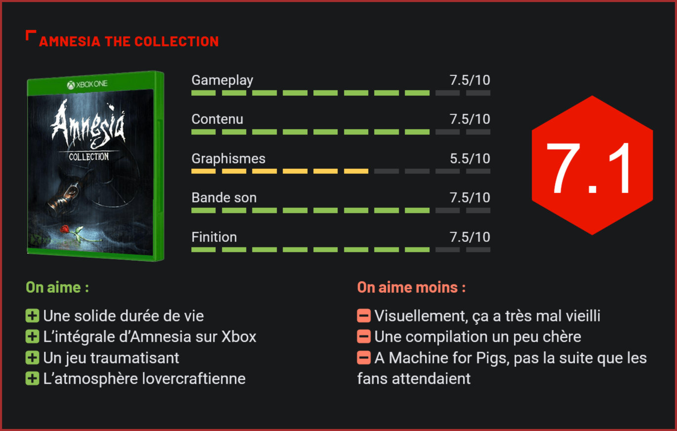 Bien connue des propriétaires de PC, la franchise Amnesia débarque aujourd’hui sur Xbox One dans une compilation qui rassemble l’intégralité des trois jeux sortis sur PC. Mieux vaut tard que jamais. Mais l’attente aura décidément été très longue pour découvrir Amnesia sur Xbox One. La compilation en question rassemble le premier volet, son extension et sa suite directe. Visuellement, les trois jeux ont mal vieilli. Il faut dire qu’ils ont désormais plus de 10 ans déjà. Malgré un petit coup de pinceau, difficile d’être encore impressionné par une réalisation graphique plus du tout à jour. Toutefois, passer à côté d’Amnesia : The Collection serait une très grosse erreur tant le titre de Frictional Games se distingue des autres jeux du genre, notamment et surtout par son atmosphère typiquement lovercraftienne. Difficile de ne pas être séduit par l’atmosphère pesante de l’univers d’Amnesia. Dès les premières minutes de jeu, le joueur éprouve un malaise. Kidnappé malgré lui, il se réveille dans un château abandonné qui regorge de mystères… Plongé dans les ténèbres, il se rendra très vite compte qu’il n’est pas seul dans cette galère… Très vite, la peur se fait sentir. Daniel, le personnage principal, commence à perdre la raison. Son seul espoir consiste à rejoindre la lumière. Le joueur met la main sur quelques bougies, qui lui permettront d’y voir plus clair. Mais le danger est partout et la lumière attire d’étranges créatures. Atypique, Amnesia joue avec la peur la plus profonde des joueurs et mélange brillamment les genres. Ici, pas question de foncer tête baissée sur d’atroces créatures qui ne feront qu’une bouchée de vous. Le jeu encourage le joueur à rester tapi dans l’ombre. Toutefois, rester trop longtemps dans l’ombre ne fait qu’accentuer la démence et les visions horrifiques de Daniel… Un élément de gameplay unique qui encourage le joueur à prendre des risques… Rarement un jeu sera parvenu à causer une telle tension. Un simple bruit suffit à causer un réflexe de fuite chez le joueur. On notera au passage l’incroyable travail réalisé par les sound designers, tant au niveau des bruitages que de la musique, qui immerge parfaitement le joueur dans ce cauchemar. Efficace en dépit de sa laideur, le jeu parviendra à garder le joueur scotché à son pad. Bien sûr, cette compilation se destine avant tout à ceux qui étaient passés à côté du titre originel. L’avantage, c’est que les nouveaux venus auront également droit à deux autres jeux. Le premier, baptisé « Justine », n’est en réalité qu’une expansion – très courte de surcroit – du premier volet – pas franchement extraordinaire mais qui aura le mérite d’en révéler davantage sur le scénario du jeu et de proposer une expérience de jeu sensiblement différente. « Machine for pigs », à l’inverse, ose une approche très différente, en proposant de se plonger dans un univers cyberpunk terrifiant. S’il n’égalera jamais le suspens rencontré dans The Dark Descent, A Machine for Pigs s’impose comme un jeu relativement efficace, certes moins effrayant et décomplexé que son ancêtre, mais qui a le mérite d’offrir quelque chose de différent, tout en conservant les bases fondamentales de la série. Assurément pas la suite que les fans attendaient, mais incontestablement un jeu très agréable à parcourir. On notera par ailleurs que Frictional Games a profité de cette version Xbox One pour livrer un mode difficile qui s’adresse avant tout aux joueurs ayant déjà parcouru l’aventure. Un bien maigre cadeau, qui justifiera difficilement l’énorme différence de prix avec la version Steam du jeu… Conclusion Destinée avant tout à ceux qui étaient passés à côté d’Amnesia à l’époque, cette « collection » propose aux joueurs une expérience intégrale puisqu’elle regroupe les 3 épisodes sortis sur PC. Certes, seul Amnesia : The Dark Descent mérite réellement le détour. Et le jeu a très mal vieilli. Mais l’ambiance de jeu unique et ses mécanismes en font un véritable incontournable pour tous les amateurs de survival-horror. Terrifiant et nerveux, Amnesia demeure un grand classique, qui aurait sans doute mérité un remake en bonne et due forme…