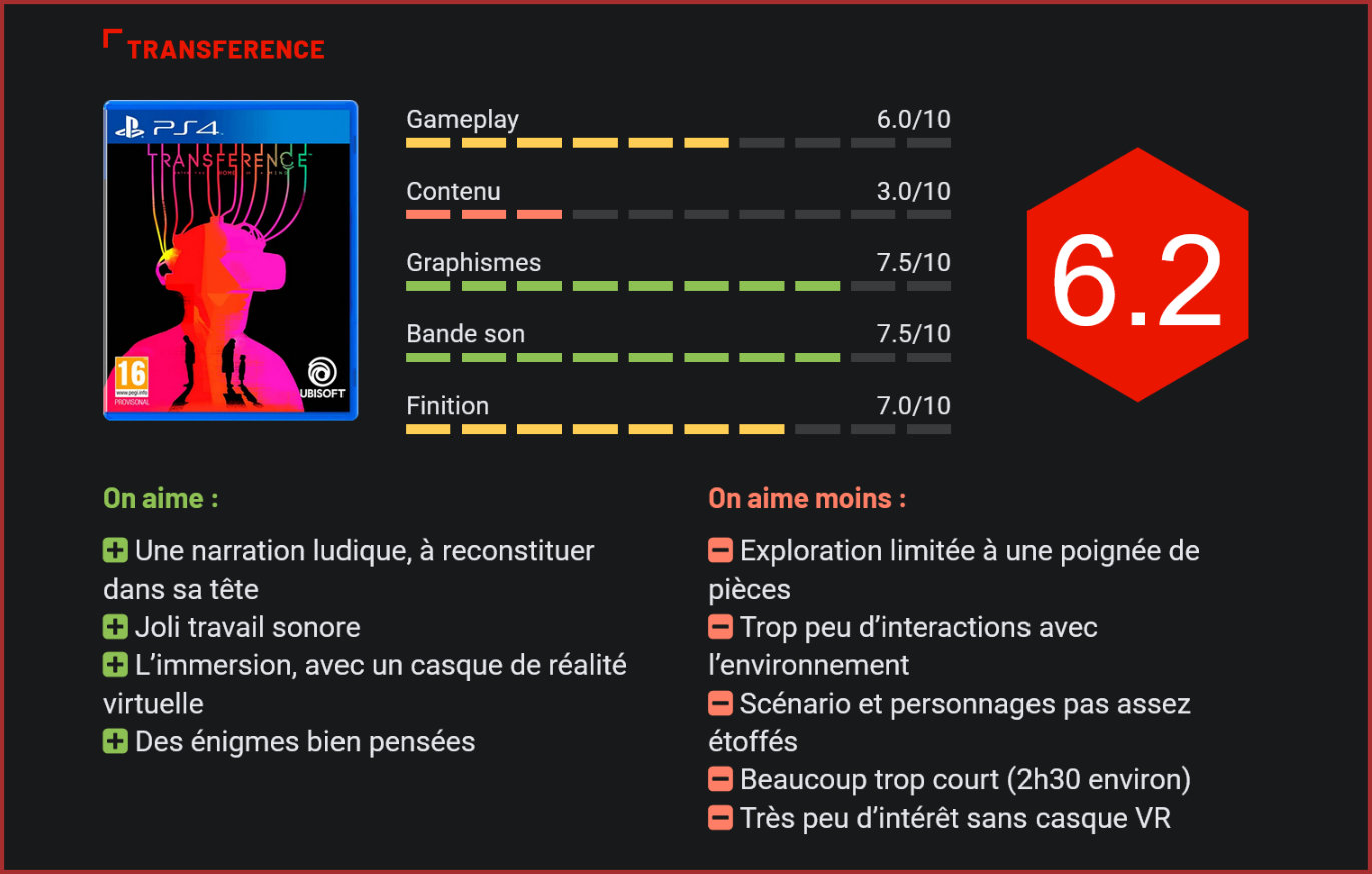 En provenance d’Ubisoft et de SpectreVision, Transference est un thriller psychologique mixant cinéma et jeu vidéo au sein d’une expérience immersive avant tout pensée pour la réalité virtuelle. Transference est le fruit d’une collaboration entre Ubisoft Montréal et SpectreVision, société de production américaine cofondée par l’acteur Elijah Wood qui est dédiée au cinéma (Cooties, Mandy) et au jeu vidéo. Cette plongée dans les souvenirs numériques du scientifique Raymond Hayes et de sa famille est digne d’un thriller psychologique mettant en exergue la transcendance, et se veut énigmatique de bout en bout, proposant une aventure immersive entièrement vécue à la première personne. Hayes, qui est incarné par l’acteur Macon Blair (vu dans les films Blue Ruin et Green Room de Jeremy Saulnier), invite dès l’entame le joueur à plonger dans une version simulée et corrompue de son esprit afin de découvrir les mystères de sa famille. On débute l’expérience aux abords d’un immeuble en récupérant une clé qui va nous permettre de pénétrer dans le bâtiment. Aucune explication de gameplay (qui s’apparente à du point’n’click) n’est donnée, le joueur devant tâtonner et se débrouiller en faisant appel à son observation et à son instinct. L’expérience est avant tout pensée pour être vécue avec un casque de réalité virtuelle vissé sur la tête, faisant la part belle à une atmosphère digne d’un survival horror avec une progression pas à pas dans un environnement très sombre et inquiétant où surgissent quelques bons vieux jumpscares. Cette fonctionnalité n’est bien sûr disponible que sur PS4, avec le PSVR. Pour cette raison, on pourra parler d’une expérience plus pauvre sur Xbox One, console dépourvue de casque de réalité virtuelle… Manette en mains, l’expérience perd en immersion et en efficacité, puisque l’on se voit essentiellement progresser en appuyant sur le bouton d’interaction afin d’activer les différents scripts prévus dans la narration, afin de faire avancer le Schmilblick. Pourtant, Transference mise bien sur l’observation, forcément beaucoup plus posée avec un casque, et l’interaction. Il demande quasi exclusivement de résoudre une série d’énigmes pour progresser dans son récit qui se déroule à 99% dans un appartement comprenant 5-6 pièces. Le petit plus est que les objets et pièces changent et se débloquent en fonction des actions effectuées et de la réalité dans laquelle on se trouve. A l’aide des interrupteurs éparpillés dans les corridors (qui peuvent eux aussi changer de place) on alterne ainsi d’une réalité à l’autre, d’une vision sombre à une vision « réaliste ». On croise alors les trois membres de la famille Hayes à différentes étapes de leur vie, on scrute les pièces dans lesquelles ils vivent dans les moindres détails (le jeu est visuellement soigné), on ramasse différents objets leur appartenant (la plupart sont des documents uniquement présents pour développer leur background) et on essaie de trouver les indices pour résoudre les différentes énigmes, souvent bien dissimulées. Pour cela, une bonne observation est requise, mais également une oreille attentive car le jeu distille également de nombreux indices sonores dans sa bande-son par ailleurs très anxiogène. Le sentiment d’angoisse et d’oppression est prégnant, même si Transference n’affiche pas une ambiance poisseuse, des fantômes ou autres créatures monstrueuses (le jeu ne comporte d’ailleurs aucun combat ni de game over), et qu’il mise sur une forme d’horreur plus originale et sophistiquée qu’à l’accoutumée. Il est ici question en filigranes de thématiques telles que l’abandon, les actes manqués et le temps qui passe au sein d’un récit finalement très intime. On regrette toutefois que SpectreVision n’ait pas développé davantage l’aspect cinématographique de son jeu en offrant davantage de présence à l’écran à ses personnages via par exemple des cut scenes avec ses acteurs en chair et en os. Tout se passe un peu trop à distance et entre les lignes, à force de non-dits, et cela empêche de fait toute empathie. Au terme de l’aventure, très courte (moins de 3h), beaucoup de pièces manquent toujours au puzzle et c’est au spectateur d’essayer de restituer l’ensemble. On apprécie ce parti-pris finalement très ludique, mais cela manque un peu trop de matière pour prendre totalement. Il est indéniable que pour qu’elle soit parfaitement immersive, l’expérience Transference est à vivre avec un casque de réalité virtuelle, au choix celui de la Playstation 4, un HTC Vive ou un Oculus Rift. Sans un tel dispositif, l’impact est bien moindre, voire carrément nul. Conclusion Joué de manière classique sans casque de réalité virtuelle vissé sur la tête, Transference n’a pas beaucoup d’intérêt. Son gameplay réduit à sa plus simple expression, sa durée de vie en-dessous des 3h et son manque de variété en font un survival horror vite expédié vite oublié. Mais la présence d’une forme d’horreur plus psychologique qu’à l’accoutumée est à souligner, et celle-ci, tout comme l’appréhension des énigmes, mérite certainement d’être expérimentée avec un dispositif VR. Si vous disposez d’un casque de réalité virtuelle, l’expérience pourrait donc s’avérer beaucoup plus intéressante, à condition bien sûr de ne pas s’attendre non plus au jeu de l’année, car en dépit de sa réalisation soignée et de son marketing intelligent, Transference reste un jeu à tout petit budget qui n’exploite pas parfaitement son concept.
