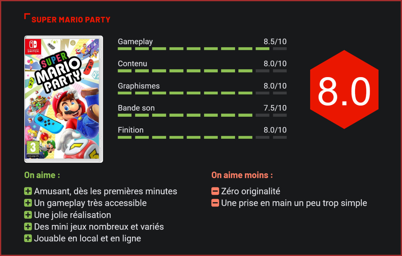 Après la déception du dernier volet, sorti sur 3DS, nombreux étaient les joueurs qui craignaient un nouveau raté de Nintendo pour ce premier volet prévu sur Switch. La console hybride de Nintendo prouve toutefois une fois de plus qu’elle est la machine idéale pour s’amuser entre amis. Débutée il y a 20 ans, la série des Mario Party a connu ses hauts et ses bas. Le dernier opus, sorti sur 3DS, avait assurément laissé un goût amer dans la bouche des joueurs qui attendaient avec impatience de redécouvrir les meilleurs mini-jeux de la franchise. Il faut dire que la plate-forme se prêtait plutôt mal au multijoueur. Que les fans se rassurent, Nintendo n’a pas manqué son coup pour le retour de sa franchise sur Switch. Le nouveau volet, fraichement sorti sur la petite console hybride de Nintendo, est un véritable délice à parcourir en multijoueur, avec ses 80 mini-jeux totalement barrés qui se jouent exclusivement au joy-con. La bonne nouvelle, c’est que Nintendo ne s’est pas contenté de reprendre les épreuves déjà croisées dans les précédents volets, introduisant de nombreux mini-jeux inédits. Contrairement à de nombreux jeux sortis sur Switch, Super Mario Party n’est pas un portage ni un remaster mais bien une nouvelle production. Et on pourra le dire d’entrée de jeu, Nintendo n’aurait pas pu trouver meilleure plate-forme que la Switch pour porter sa série. Les plus grincheux regretteront qu’il ne soit pas possible de jouer avec les controllers connectés à l’écran de la console, en mode nomade. Toutefois, rappelons qu’il s’agit ici d’un titre multijoueur. Y jouer seul ne présente pratiquement aucun intérêt. Tout l’intérêt de Super Mario Party réside dans ses parties en multi complètement barrées. En dépit de sa simplicité (la plupart des jeux ne nécessitent pas plus d’utiliser deux ou trois touches), Super Mario Party reste un titre d’une efficacité redoutable. Chaque joueur contrôlera ici son personnage avec un seul joy-con. En début de partie, un petit tutoriel vidéo montrera au joueur la tâche à accomplir. Dans le principal mode de jeu, le joueur devra affronter 3 de ses amis à travers une succession d’épreuves – 80 au total. On y retrouve un peu de tout, et beaucoup de n’importe quoi. Des épreuves de tricycle qui vous obligeront à « pédaler » avec vos mains à la cuisine de steaks en passant par le parcours d’obstacle, il y en a pour tous les goûts. Chaque session de jeu n’excède pas une à deux minutes. A l’issue de la session, le joueur se voit attribuer une place dans le classement et remettre des étoiles, qu’il pourra ensuite dépenser sur le plateau de jeu. Tout l’intérêt du jeu repose sur ce plateau de jeu – inspiré d’un jeu de société – sur lequel les joueurs doivent évoluer en utilisant bonus et malus à leur avantage. Les règles sont toujours simples et le jeu se veut accessible. Notons toutefois que l’expérience n’y fera rien ici puisque la diversité des jeux permettra naturellement à chaque joueur d’y trouver son compte. Ceux qui ont de bons réflexes engrangeront ainsi plus de points que leurs adversaires lors des séquences de jeu de ce type, tandis que ceux qui excellent dans les épreuves d’adresse feront le plein d’étoiles dans les séquences de ce type. La grande richesse de Super Mario Party est de parvenir à mélanger brillamment les différents types d’épreuves et à faire tourner les équipes qui s’affrontent sur les plateaux pour ne pas favoriser l’un ou l’autre joueur. Son second atout, c’est de permettre de réunir n’importe quel joueur autour de la console. Petits et grands prendront un pied formidable à s’affronter à travers les séries de différentes épreuves qui leur sont proposées. Pas besoin d’avoir un gros bagage vidéoludique, ni d’être particulièrement doué pour un style de jeu. Super Mario Party est typiquement le genre de jeu qui se laisse approcher par tous les publics, en ce compris les joueurs les plus exigeants. Visuellement très joli, le titre tire parfaitement parti des capacités de la console. La bande sonore s’en sort également avec les honneurs. Au final, difficile donc de trouver un véritable gros défaut à ce volet, qui est exactement le jeu que les fans de la série attendaient. Tout au plus lui reprochera-t-on son classicisme. Nintendo n’a pris aucun risque ici, et cela se ressent. Les défis ne vous surprendront jamais vraiment si vous avez déjà joué à la série, et les ajouts par rapport aux précédents volets restent très légers. En définitive, un grand cru, auquel il ne manque finalement qu’un peu de profondeur et d’originalité. Conclusion Difficile d’être déçu par ce nouveau volet de la série de Nintendo, qui nous livre un jeu qui tire parfaitement parti des capacités de sa petite console nomade et s’impose comme l’un des meilleurs volets de la franchise. Les plus critiques lui reprocheront sans doute son manque d’originalité. Il est vrai que Nintendo nous livre des épreuves extrêmement classiques, qui jouent un peu dans le déjà-vu. Mais ne boudons pas notre plaisir car ce Super Mario Party est incontestablement une franche réussite. Ses 80 mini-jeux animeront brillamment vos soirées entre amis et son gameplay accessible en font un titre qui séduira tant les passionnés de jeu vidéo que ceux qui ne prennent jamais un pad en main.