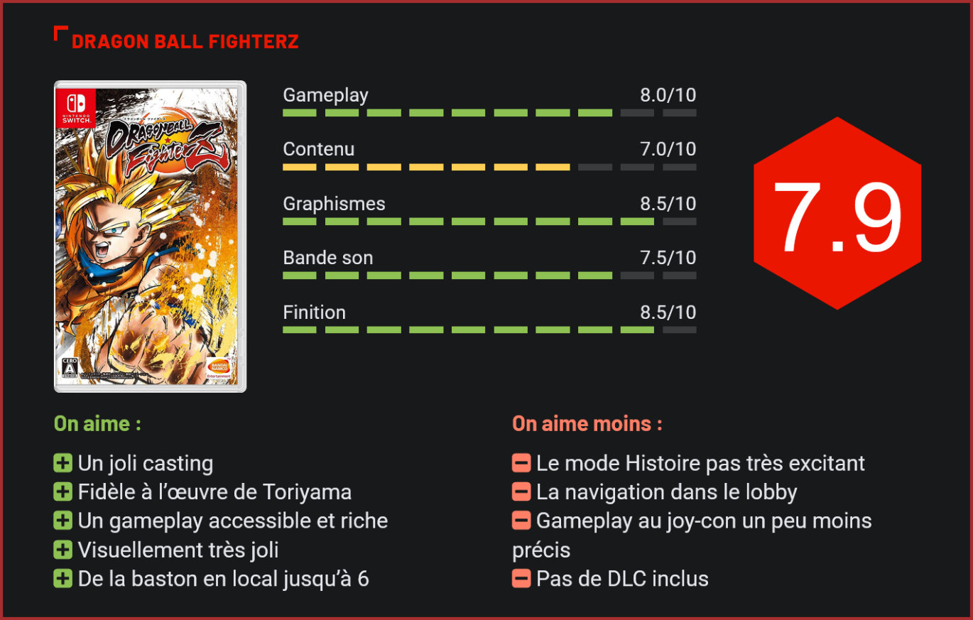 Presque un an après sa sortie sur PS4 et Xbox One (voir notre test), Dragon Ball FighterZ ne déçoit pas non plus sur Switch, d’autant qu’il permet des combats toujours très spectaculaires qui peuvent être disputés jusqu’à six, n’importe où. La dernière adaptation vidéoludique de la série animée créée par le célèbre auteur Akira Toriyama, une fois de plus chapeautée par Namco-Bandai, se devait de sortir sur Switch. C’est désormais chose faite, avec ce Dragon Ball FighterZ au design old-school inspiré des jeux de baston en 2D des années 90, qui peut désormais être jouable partout grâce aux fonctionnalités nomades de la console de Nintendo. L’affichage reprend le style 2.5D, avec des personnages modélisés en 3D, dans des décors animés en 2 dimensions. Le rendu de cette version Switch est toujours époustouflant, et l’on se croirait tout bonnement dans un épisode de la série. On notera d’ailleurs que les transitions entre les dialogues, cinématiques et séquences de combat font honneur au moteur du jeu. Malgré de petites chutes de framerate (on reste globalement aux alentours des 60 fps) et des textures un peu moins lisses que sur PS4 ou Xbox One (avec quelques effets de flou), le jeu reste hyper fluide et aussi agréable à jouer qu’à regarder. D’autant que nombre de personnages sont présents et que tous se valent, n’en déplaisent aux puristes. On regrettera que cette arrivée un poil tardive sur Switch ne soit pas agrémentée de quelques personnages depuis sortis via les différents DLC. Il faudra donc payer pour compléter le casting. Côté affrontements, ceux-ci s’avèrent très accessibles avec la présence de commandes simples (notamment pensées pour pouvoir jouer avec un seul Joy-Con) qui ne demandent pas d’exécuter de quart de cercle ou de retenir des enchaînements de touches pour sortir des combos complexes. Dragon Ball FighterZ laisse de côté le réalisme pour se concentrer sur le dynamisme de ses affrontements, mais n’en reste pas moins technique et exigeant. Il faudra de nombreuses heures de jeu pour maîtriser tous les personnages, les combos, enchainements et super-attaques. Si maîtriser les coups ne demandera en soi pas un trop grand travail d’apprentissage, mémoriser les combinaisons gagnantes dans les enchainements aériens et maîtriser le timing se révéleront indispensables pour briller dans les classements en ligne. De quoi séduire les combattants débutants comme les habitués des jeux de baston. On notera d’ailleurs que le jeu se caractérise aussi par son approche unique en misant avant tout sur du tag-battle avec des affrontements à trois contre trois qui rendent les combats beaucoup plus stratégiques qu’il n’y paraît. Changer de personnage au bon moment permettra souvent de prendre un sérieux avantage sur son adversaire. Au niveau de son contenu, Dragon Ball FighterZ reprend tous les modes précédemment disponibles. Outre son très bon casting de base, le jeu dispose de nombreux modes de jeu allant du classique mode Arcade au mode Histoire – malheureusement pas très excitant malgré sa nature inédite, la faute à un scénario qui tarde à prendre son envol. Sans oublier bien sûr le multijoueur qui représente l’épine dorsale du jeu, comme dans tout jeu de baston qui se respecte. Les affrontements en ligne restent ici dans l’ensemble fluides même si on constate parfois quelques ralentissements. Rien de bien grave, cependant. En mode local, cette version Switch frappe par contre encore plus fort, avec la possibilité d’effectuer des joutes jusqu’à six. Il est en effet possible avec un seul exemplaire du jeu de jouer n’importe où avec six amis. Dans cette configuration, chacun joue à l’aide d’un unique joy-con. La maniabilité est certes un peu délicate au début (heureusement, il y a les commandes simplifiées), mais vu que tout le monde est logé à la même enseigne, il n’y a pas vraiment d’excuse. Les parties endiablées s’enchaînent et c’est un vrai régal de partager ces combats spectaculaires grâce aux fonctionnalités portables de la Switch. Sur le plan technique, malgré une finition un peu moins détaillée que sur les plus performantes PS4 et Xbox One, Dragon Ball FighterZ brille véritablement sur Switch avec son moteur graphique impressionnant, ses animations dessinées à la main, ses effets visuels dignes d’une superproduction hollywoodienne et sa bande sonore originale. Beau, fluide et d’une fidélité extrême à l’œuvre d’Akira Toriyama, Dragon Ball FighterZ est la perle que les fans de la série animée attendaient depuis si longtemps – et devient un indispensable pour les amateurs de baston en possession d’une Switch. Conclusion Proposant un contenu identique aux versions PS4 et Xbox One, Dragon Ball FighterZ sur Switch s’impose sans mal comme l’un des meilleurs, voire le meilleur jeu de baston en présence sur la console de Nintendo. Fidèle à l’œuvre d’Akira Toriyama, accessible, fluide et nanti d’un gameplay riche et profond, il est aussi beau à regarder que fun à parcourir, que ce soit en solo ou en multijoueur (avec un mode local jusqu’à six avec une seule cartouche!). On regrettera juste un mode Histoire pas très excitant, et, pour ce portage Switch, un gameplay au joy-con un brin revêche. On recommandera donc l’utilisation du Pad Pro pour les plus exigeants.