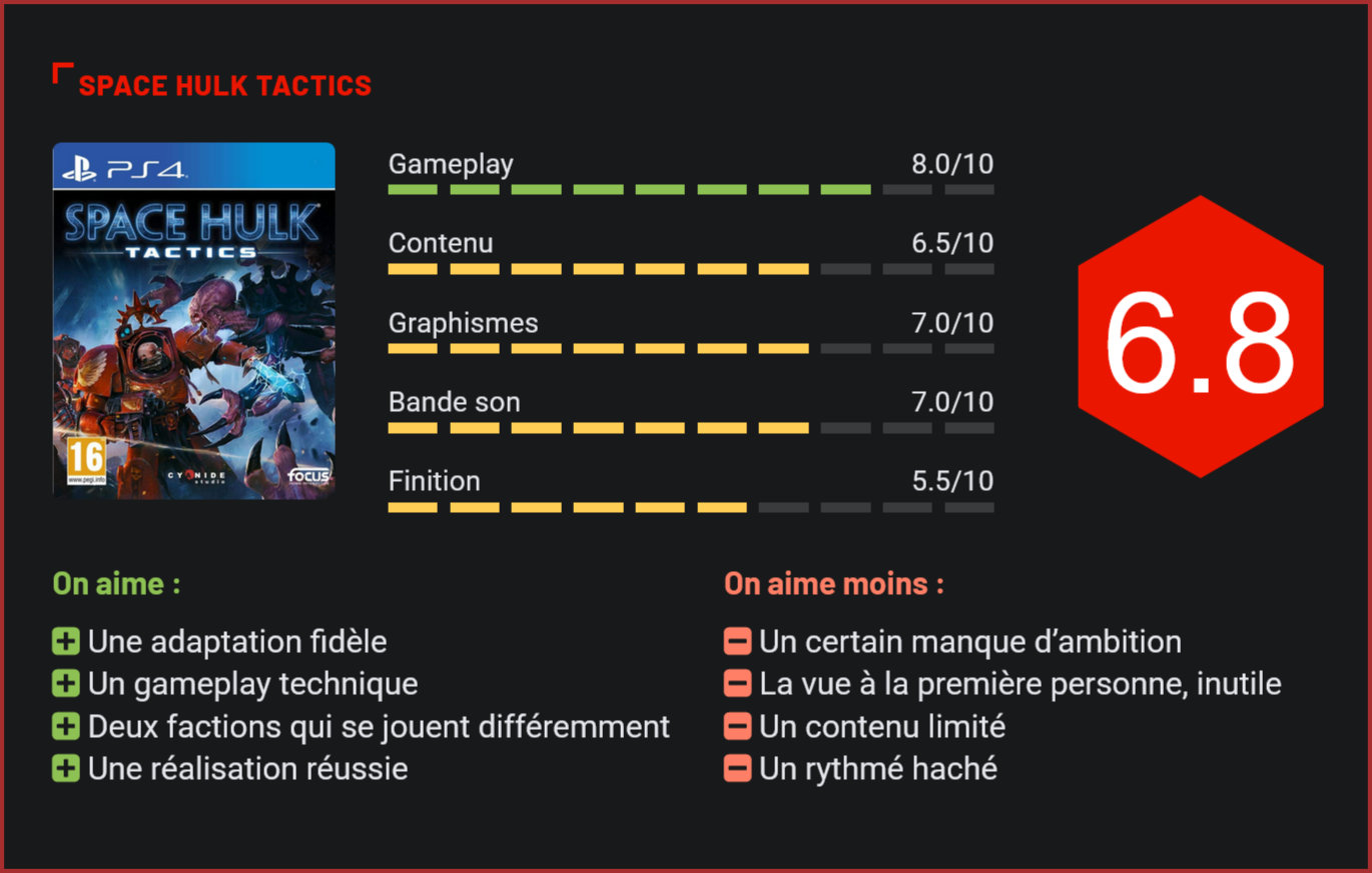 Les adaptations de Warhammer 40,000 se multiplient mais ne se ressemblent pas. Le studio français Cyanide tente à son tour sa chance avec Space Hulk: Tactics, un jeu de stratégie au tour par tour qui reprend tout ce qui a fait le succès du jeu de plateau. Vous l’aurez sans doute remarqué au cours des derniers mois, Warhammer 40,000 a la cote. Après Deahtwing, Dawn of War 3 et Relics of War, la franchise a droit à une nouvelle adaptation avec l’épisode Space Hulk Tactics, cette fois développé par des spécialistes du RPG. Et cette fois, les fans de Warhammer 40,000 auront droit à une adaptation plutôt fidèle de l’univers du jeu de Games Workshop, Cyanide ayant fait de la fidélité au matériau d’origine l’une de ses priorités absolues. Pas question donc de se lancer à corps et à cris dans une aventure poussive dans un vaisseau infecté de monstruosités galactiques. Space Hulk est un titre beaucoup moins nerveux – et ô combien plus réjouissant pour les fans puisque les développeurs nous proposent cette fois un jeu de stratégie au tour par tour. S’inspirant ouvertement de X-Com, le jey de Cyanide lorgne généreusement du côté des shooters tactiques. Ici, le joueur commandera l’une des deux factions en présence. Il devra déterminer les points d’entrée de ses unités sur la carte pour ensuite définir leur stratégie en cours de partie. Assez mou par nature, le rythme de jeu pousse le joueur à se creuser la tête pour trouver les meilleures solutions sur le terrain. La grande richesse du jeu, c’est de parvenir à proposer une expérience de jeu qui sera radicalement différente, selon la faction choisie. D’un côté, on retrouve les fameux Space Marines, aux armes puissante, qui feront des éclats à distance mais se feront massacrer dès que leur défense est percée. Bien organisés, ceux-ci seront déployés sur le terrain par différentes portes d’entrée. Leur adversaire pourra donc adapter sa stratégie sur base de ces données. De l’autre, on retrouve les Genestealers, d’horribles créatures de l’espace qui sont déployées sur le terrain sous forme d’essaims. Leur atout? Leur nombre, et le fait que le joueur qui contrôle les Space Marines soit incapable de connaître le nombre d’unités que chaque pod (ou “blip”) déversera… Ces créatures ne sont toutefois pas très résistantes face aux tirs des Marines. Vous l’aurez compris, pour remporter la partie, le joueur devra utiliser les capacités de sa faction et tirer parti des faiblesses de l’ennemi. Pour permettre au perdant de renverser le jeu, Cyanide a également imaginé un système de cartes de commandement qui permettent d’utiliser des capacités spéciales sur le terrain ou d’accorder différents bonus. Rien de révolutionnaire en soi, mais une fonctionnalité qui ajoute toutefois de jolis bonus en cours de partie… Plus technique qu’il n’y paraît, Space Hulk Tactics se révèle finalement plutôt fidèle au matériau d’origine et devrait procurer aux fans de la franchise une expérience de jeu très solide. Toutefois, tout est loin d’être parfait dans ce petit jeu qui manque finalement d’ambition. L’aventure solo manque cruellement de rythme, le scénario du jeu reste très simple et le titre manque cruellement de diversité, tant au niveau des environnements traversés que des mécanismes de jeu. Et puis, bien sûr, il y a les petits à-côtés qui ne fonctionnent pas, comme la vue à la première personne qui ne sert à rien. Pour autant, difficile de couler un jeu qui n’en reste pas moins efficace, plutôt joli et fidèle à la franchise de Games Workshop. Certes, on aurait apprécié plus de contenu, et un rythme des parties moins haché, mais pour un petit projet, Space Hulk Tactics s’en sort plutôt bien et s’impose même comme une bonne surprise… Conclusion S’il ne parvient pas totalement à convaincre, la faute à un gameplay par nature répétitif et un certain manque d’ambition de ses créateurs – lié au petit budget du projet -, Space Hulk Tactics n’en reste pas moins un jeu extrêmement fidèle à la licence Warhammer 40,000, qui devrait réjouir les fans avec son approche stratégique et son gameplay extrêmement technique. Un jeu séduisant, que l’on réservera toutefois aux fans purs et durs de la franchise.