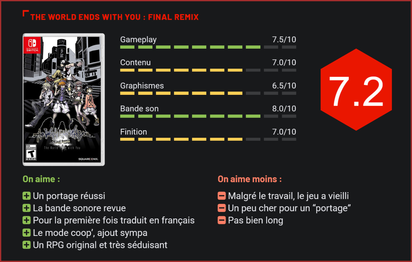 Annoncé il y a quelques mois seulement, le portage de l’excellent The World Ends With You débarque déjà sur Switch, dans une édition “intégrale”, traduite pour la première fois en français. Un rendez-vous incontournable pour les rôlistes de tous poils. Sorti initialement sur DS, il y a maintenant plus de 10 ans, The World Ends With You fait partie, aux yeux de certains joueurs, de ces jeux de rôle cultes que tous les rôlistes se doivent de faire au moins une fois dans leur vie. Porté à toutes les sauces depuis sa sortie originelle, le RPG n’avait toutefois jamais eu droit à une sortie sur une console de salon. Une erreur maintenant corrigé par Square-Enix, qui nous livre un ultime portage sur Switch. Ultime? Vraiment? C’est en tout ce que les développeurs assurent. Ressortir le jeu sur Switch était un véritable défi pour les créateurs de The World Ends With You, et surtout le début d’une nouvelle aventure puisqu’une fois le jeu bouclé, les développeurs voulaient se lancer dans le développement d’une suite… Pensé pour être joué sur une console nomade, The World Ends With You n’était pas forcément le portage le plus facile à faire atterrir sur Switch. D’autant plus que le jeu a soufflé son dixième anniversaire il y a de cela quelques mois. Un sérieux lifting s’imposait donc… Dans la pratique toutefois, pas de miracles, The World Ends With You n’a pas l’apparence d’un titre à gros budget, et a à bien des égards vieilli. Pour autant, cracher dans la soupe serait une belle erreur tant ce Final Remix s’en sort avec les honneurs. Premièrement, parce que les développeurs ont pris la peine de revoir intégralement la bande sonore du jeu. Ensuite, parce que le jeu est traduit pour la première fois en français. Enfin, parce que les développeurs nous livrent un portage très propre, et très complet également. Pour ceux qui n’auraient jamais touché à The World Ends With You, le jeu de Square-Enix lorgne allègrement du côté de l’action-RPG. Le jeu place le joueur dans la peau d’un jeune garçon amnésique, qui devra arpenter les rues de Tokyo avec son équipe d’aventuriers et réaliser une série de défis qui lui sont donnés par les organisateurs d’un jeu particulièrement vicieux… Niveau gameplay, pas de grosse originalité. Le titre séduit en revanche au niveau de sa réalisation avec un character-design exceptionnel et un univers particulièrement original… Difficile de ne pas être séduit par son système de badges à collectionner, qui débloquent des pouvoirs psychiques, son univers décalé et ses combats déstabilisants. Avec son univers aux antipodes de ce qu’on a l’habitude de voir dans les RPG nippons, The World Ends With You propose une expérience de jeu “différente” de ce qu’on a l’habitude de voir. Certes, tout n’est pas parfait dans ce tableau, notamment les dialogues souvent longuets, et la durée de vie du titre, relativement courte pour ce type de jeu (moins de 20h), mais l’expérience unique à laquelle les joueurs auront droit justifie largement l’investissement. L’une des richesses de cette version finale, sur Switch, c’est de proposer deux approches différentes du jeu, en proposant soit des contrôles tactiles – pas forcément très sexy, mais fidèles au jeu d’origine – soit des contrôles au joy-con, beaucoup plus précis et qui tirent brillamment parti des capacités de la console. On notera au passage qu’en choisissant cette configuration, le joueur pourra également coopérer avec un ami, qui le rejoindra dans l’aventure. L’occasion donc pour Square-Enix d’introduire un mode coop’ totalement inédit… Visuellement, les créateurs du jeu ont également fait de petits miracles en portant brillamment leur jeu sur Switch. Le jeu est propre et net, malgré l’étirement de certaines textures. Certes, les développeurs auraient pu aller beaucoup plus loin en revoyant complètement l’esthétique du jeu. D’autant plus que le jeu est facturé au prix plein… Cette approche a toutefois le mérite de ne pas dénaturer le matériau d’origine. Conclusion Un peu trop cher sans doute, ce portage de l’excellent The World Ends With You sur Switch n’en reste pas moins généreux en contenus inédits, avec une bande sonore retravaillée, une traduction française intégrale, l’ajout d’un mode coop’ et des graphismes retravaillés. Malgré son prix excessif, le jeu de Square-Enix mérite le détour ne serait-ce que pour son univers original et très riche, son gameplay qui sort des sentiers battus et son character design d’exception. A conseiller toutefois avant tout à ceux qui étaient passés à côté de cette merveille il y a 10 ans…