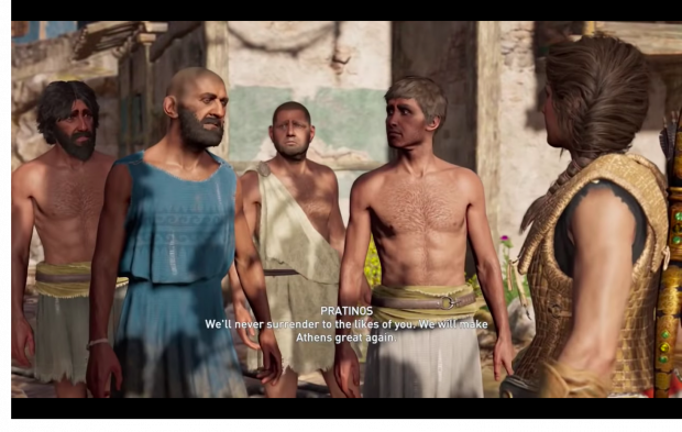 Le monde d’Assassin’s Creed : Odyssey est immense et regorge de petits cadeaux laissés par les développeurs. En explorant la Grèce antique, des joueurs ont mis la main sur une référence à Donald Trump, son fameux slogan “Make America great again”. Chez Ubisoft, les développeurs ne manquent pas d’humour ni d’opinions politiques. Le dernier titre d’Assassin’s Creed ne manque pas d’Easter eggs : les joueurs pourront par exemple tomber sur une graine de Korok issue de Zelda : Breath of the wild, les lunettes de vision nocturne de Sam Fisher ou encore un combat sous une cascade qui n’est pas sans rappeler une scène de Black Panther. C’est au cours d’une quête nommée “A Venomous Encounter” (que l’on pourrait traduire par “Une rencontre empoisonnée”) que les joueurs sont amenés à empêcher une tentative d’assassinat sur un politicien athénien. Une fois le personnage de Metiochos sauvé d’une fosse aux serpents, la mission consiste à traquer les auteurs de l’attaque avant de les soumettre à la justice. Au terme de cette quête, deux choix s’offrent à Alexios ou Kassandra : libérer le groupe d’assassins ou tuer sauvagement leur chef. Un joueur raisonnable saura épargner ces bandits mais celui qui ne fait pas de quartiers pourra y découvrir une simple ligne de texte en référence au président américain : “We will make Athena great again”. Cette phrase, c’est la même que celle qui a servi de slogan à Donald Trump au cours de sa campagne présidentielle, sauf qu’il s’agissait de l’Amérique et non d’Athènes bien entendu. La ressemblance ne peut pas être un hasard, les développeurs d’Ubisoft ont intentionnellement placé cette petite référence en guise de commentaire sur le climat politique actuel. Le monde d’Assassin’s Creed : Odyssey n’a pas encore livré tous ses secrets, de nouveaux Easter eggs y sont découverts chaque jour.