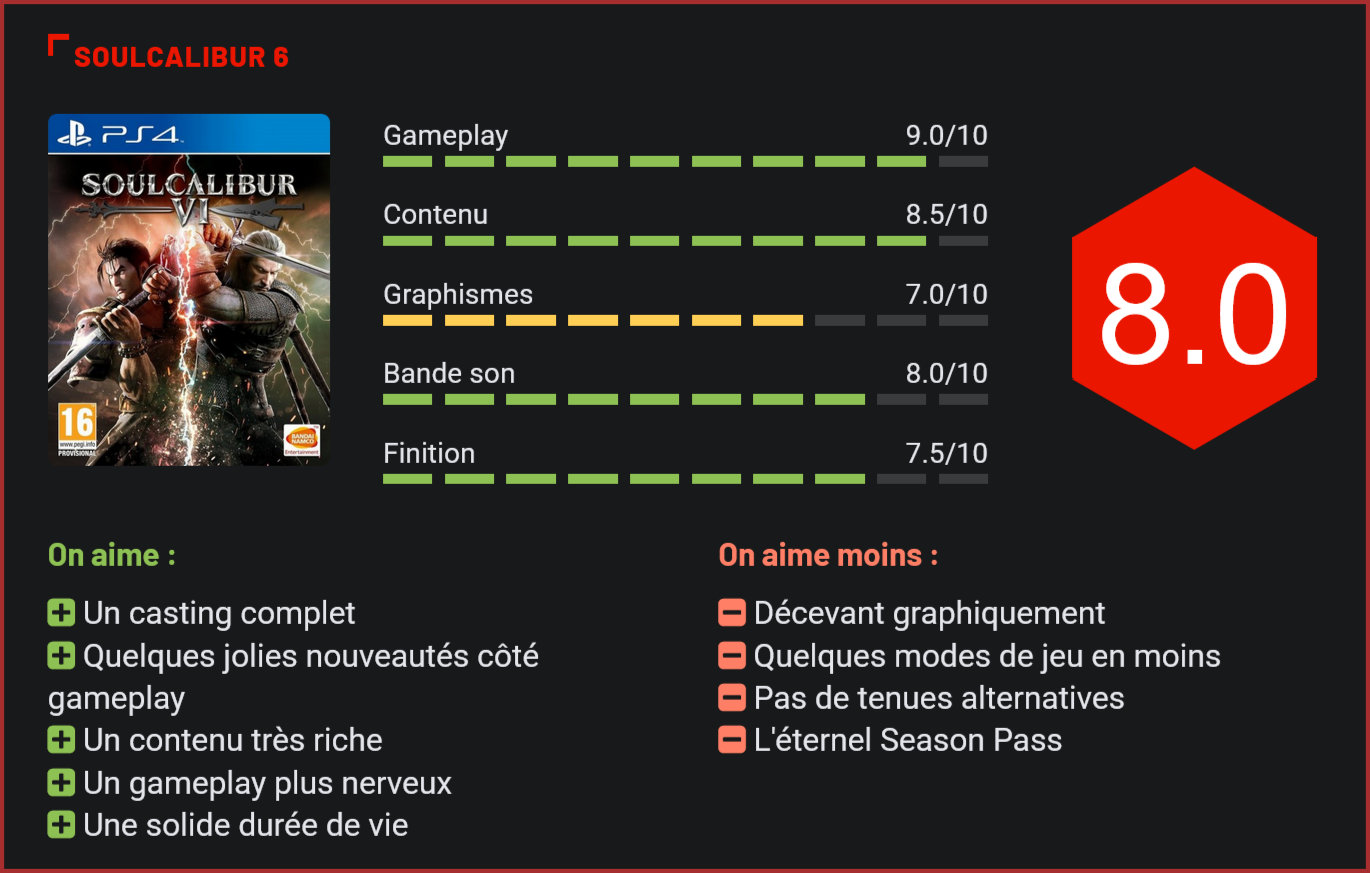 Six ans après le cinquième volet, Namco-Bandai livre enfin un nouvel épisode de l’une des séries les plus appréciées des amateurs de jeux de baston. Un retour en fanfare qui pourrait toutefois sonner le glas d’une franchise qui n’a jamais su séduire le grand public, malgré ses nombreux atouts. Selon ses créateurs, SoulCalibur 6 pourrait bien être le dernier volet de la franchise, si les ventes du jeu ne sont pas à la hauteur des ambitions de Namco-Bandai. Convaincre l’éditeur de se risquer à nouveau sur ce terrain n’a pas été une tâche facile pour les développeurs. D’autant plus que Namco-Bandai a dans son catalogue une autre franchise de jeux de baston très populaire, l’incontournable Tekken. Acclamée par les critiques, la série de Namco-Bandai n’a malheureusement jamais vraiment séduit le grand public, la faute sans doute à une direction artistique trop élitiste et un gameplay aux antipodes des Tekken et autres Street Fighter. Dès le premier volet de la série, le bien nommé Soul Blade, sorti sur PS One, Namco-Bandai a fait le pari totalement fou de livrer un jeu de baston dans lequel les combattants s’affrontent non pas avec leurs poings mais avec des armes blanches. Un concept original qui a donné à la franchise son ADN propre. Malheureusement, la série a perdu au fil des années ses lettres de noblesse. Depuis SoulCalibur 3, la qualité des épisodes a été decrescendo et de nombreuses voix se sont élevées au sein de la communauté pour critiquer ce sabordage. Rangée au placard par Namco Bandai il y a déjà six ans, la série fait aujourd’hui son grand retour avec – déjà – le sixième volet de la franchise. Et le moins que l’on puisse dire, c’est que les attentes étaient élevées pour ce nouvel opus. Et inutile de tourner autour du pot, si SoulCalibur 6 est un titre plaisant – et s’impose même comme l’un des épisodes les plus aboutis de la franchise -, il est malheureusement loin d’être aussi bon que les trois premiers volets de la série… Tout d’abord parce que visuellement, le jeu est loin de tenir la comparaison avec les standards actuels. Les animations des personnages sont fluides et les effets visuels plutôt jolis, mais les arènes manquent cruellement de détails et les animations faciales semblent être tirées d’un jeu d’il y a cinq ans. SoulCalibur 6 est très loin d’être une claque graphique. Il ne s’agit pour autant pas d’un jeu « très laid ». Vu l’ADN de la série, cet élément risque toutefois de créer la grogne des fans, qui étaient habitués à une belle claque graphique à chaque nouveau volet… La bonne nouvelle, c’est que si l’esthétique déçoit, le jeu, lui, est un véritable délice. Tout d’abord, parce que le jeu est plus vif que ses ancêtres. Les déplacements des personnages sont plus rapides, et cela se ressent sur le ring, avec des affrontements beaucoup plus nerveux. Sans toucher aux bases de la franchise, Namco Bandai apporte quelques petites retouches qui ne font que rendre la recette plus savoureuse. On notera ainsi l’introduction des coups fatals, des attaques spéciales qui se déclenchent sous certaines conditions et permettent d’amplifier les dégâts sur l’adversaire. Un ajout qui rend les affrontements plus brutaux et force les deux parties à être beaucoup plus agressives. Du tout bon pour les fanas d’e-sport. Namco-Bandai ajoute également une nouvelle technique de contre baptisée le Reversal Edge, qui permet de ralentir le temps pour offrir une seconde chance à un joueur placé dans l’embarras. Le système de Reversal Edge est toutefois entièrement basé sur la chance puisque les deux joueurs pourront lancer une combinaison pour tenter de remporter le bras de fer et casser la défense de leur adversaire. Plus complexe, le gameplay de SoulCalibur 6 devrait logiquement séduire les fans de la surprise, qui devraient être joliment agréablement surpris par la générosité de Namco-Bandai. On notera au passage que l’éditeur n’a pas hésité à prendre de très gros risques en supprimant certains coups et en en ajoutant de nouveaux. Si les nouveautés sont plutôt séduisantes coté gameplay, les déceptions sont nombreuses niveau contenu. Tout d’abord parce que les personnages du jeu n’ont désormais plus de tenues alternatives. On imagine que celles-ci s’ajouteront progressivement au fil des DLC… Une technique un peu fourbe qui obligera les joueurs à mettre la main au porte feuille… Ensuite, parce qu’au niveau des modes de jeu, Namco-Bandai a fait le ménage, n’hésitant pas à supprimer l’incontournable Time Attack, le Tag Team et la Survie. Enfin, parce que le nouveau mode solo scénarisé est un véritable supplice à parcourir, avec ses dialogues trop nombreux, son scénario poussif et ses challenges répétitifs. Fort heureusement, Namco Bandai connaît ses classiques et livre un éditeur de personnage très complet, en sus d’un nouveau mode de jeu, dans lequel le joueur pourra suivre sa propre aventure – d’une richesse surprenante. Le casting du jeu est également très solide, avec la présence des habitués de la série mais aussi de quelques invités de marque et de nouveaux venus, dont l’incontournable Geralt de The Witcher, qui s’intègre parfaitement dans l’univers de SoulCalibur. Niveau arènes, on retrouve ici de nombreux niveaux totalement inédit. Malheureusement, Namco-Bandai semble avoir préféré la quantité à la qualité. Résultat? La plupart des niveaux parcourus laissent une impression de trop peu… Dommage, d’autant plus que tous les ingrédients étaient là pour nous proposer un grand jeu. Au final, difficile d’être déçu par cet opus qui remplit parfaitement sa feuille de route sans pour autant surprendre. SoulCalibur 6 renouvelle intelligemment le gameplay de la série et délivre exactement ce que les fans attendaient de lui. L’éditeur aurait sans d