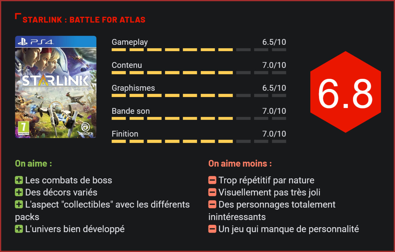 Avec Starlink : Battles for Atlas, Ubisoft tente de remettre au goût du jour la formule des Skylanders, avec un jeu accompagné de multiples figurines à collectionner. Au menu du jour : exploration de planètes inconnues et combats intersidéraux. À la recherche d’Atlas Dans cette aventure spatiale, nous suivrons les péripéties d’un pilote accompagné de ses coéquipiers. Le point central de l’histoire nous plonge à la recherche de l’un des membres de l’équipage de Starlink, Atlas, qui s’est fait kidnapper par un groupe de pirates de l’espace. Une quête qui nous poussera à l’exploration à travers 7 différentes planètes, chacune disposant de ses propres caractéristiques. Mêlant combats, exploration et collecte de ressources, le jeu mélange brillamment différents styles mais manque cruellement d’originalité avec son style graphique qui s’inspire – en grande partie – de Starfox. Jouets physiques ou jeu numérique Au-delà de son univers, la véritable particularité de Starlink : Battle for Atlas vient du fait que le jeu se positionne en tant que jeu vidéo avec lequel il est possible d’interagir grâce à une panoplie complète de jouets. S’il n’est pas nécessaire d’acquérir les différents packs de jouet pour parcourir le jeu, ceux-ci rendent l’expérience plus riche. Par défaut, les collectionneurs devront donc faire l’acquisition d’un pack renfermant un vaisseau, un personnage et deux armes. Il pourra ensuite faire l’acquisition de différents packs pour se composer une armada complète. Ces jouets ne sont toutefois pas juste bon à prendre les poussières sur une étagère. Ubisoft a en effet entièrement pensé le jeu de sorte à ce que les accessoires permettent de personnaliser l’expérience. Grâce à un kit, le joueur pourra connecter son vaisseau à sa manette et alterner différentes combinaisons d’armes. Le vaisseau, son pilote et les armes se matérialiseront ensuite dans le jeu… Pour les allergiques aux gadgets, le jeu reste parfaitement jouable sans eux, dans une version totalement numérique. Une solution qui offre davantage d’éléments de base, mais qui – forcément – enlève l’aspect “collectibles”. L’ennui, c’est que dans la pratique, le fait que l’expérience soit pratiquement identique avec et sans jouets retire pratiquement tout l’intérêt de ces packs… On notera au passage que la Switch a droit à un pack exclusif avec la présence de Fox (Starfox) au casting. Une jolie exclusivité qui poussera sans doute les fans à opter pour cette version. Une prise en main facile Starlink : Battle for Atlas repose essentiellement sur la maitrise des commandes des différents vaisseaux. En quelques instants, on apprend à maîtriser son vaisseau, sur le sol comme dans l’espace. Les déplacements, attaques, esquives se font sans difficulté. Quelques mini-jeux viennent apporter un petit plus, extraction d’objets via un curseur, récolte d’objets et matériaux divers. À cela, on peut rajouter l’hypervitesse qui apporte un peu de dynamisme à l’exploration. Les objectifs restent cependant rapidement redondants. L’aventure peut facilement être résumée par une succession de missions d’élimination d’ennemis, collectes d’objets en tous genres pour ses propres besoins ou pour créer de nouvelles alliances. Ces objectifs de collectes varient légèrement tout au long de la trame principale, mais rien de transcendant. Côté affrontements – point essentiel du jeu -, les combats contre les boss se révèlent un peu plus variés que le reste des ennemis rencontrés sur les différentes planètes. Il faudra parfois enchainer les attaques ciblées, esquiver les sbires qui nous attaquent, attendre le bon moment pour frapper. De quoi apporter une vraie dynamique. L’ennui c’est qu’on n’atteint jamais le niveau d’un véritable space-opera et que le jeu reste globalement beaucoup trop sage. Une direction artistique inspirée Malgré le côté très inspiré de grands noms de science-fiction, la direction artistique réussit à dépeindre une esthétique particulière et propre à chacune des planètes explorées. Les différents environnements répondent parfaitement à un univers SF. On regrette tout de même le manque de profondeur des personnages, qui se révèlent totalement inintéressants. Le jeu reste globalement plutôt joli – surtout sur Switch -, même si on lui reprochera globalement son manque de détails. Côté sonore , rien de bien notable à relever sauf, peut-être, la présence du Youtubeur Norman Thavaud (Norman fait des vidéos) pour la voix française d’un des personnages, Levi McCray. Sympathique, même si dans la pratique, cela ne changera pas grand chose pour les fans de space-opera. Conclusion Malgré quelques idées intéressantes, Starlink : Battle for Atlas ne parvient pas totalement à convaincre, la faute à des mécanismes de jeu par nature répétitifs, une réalisation graphique mi-figue mi-raisin et des packs de jouets pas forcément indispensables, même pour les collectionneurs. Lorgnant copieusement du côté de Starfox, le jeu d’Ubisoft peine à développer sa propre identité. Il n’en reste pas moins agréable à parcourir, notamment pour son univers graphique soigné et ses combats de boss inspirés.