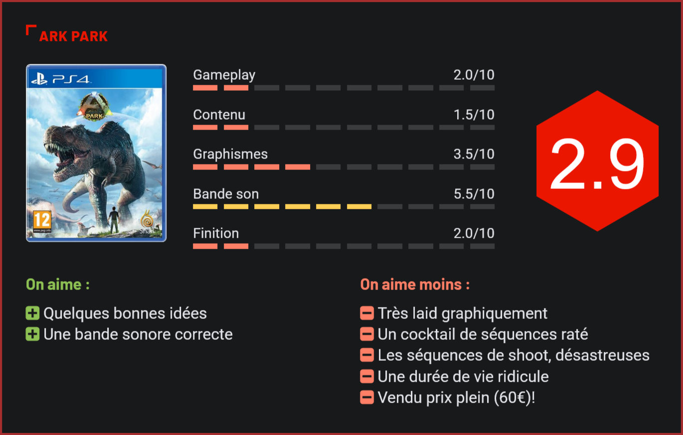 Premier spin-off d’Ark : Survival Evolved, Ark Park propose de s’immerger dans le monde fantastique des dinosaures grâce à un casque de réalité virtuelle. Enorme succès commercial, Ark: Survival Evolved a poussé les créateurs du jeu à se lancer dans plusieurs “side projects”, dont un titre en réalité virtuelle qui propose aux joueurs d’explorer l’univers d’Ark un casque de réalité virtuelle sur la tête. Ambitieux, le projet avait attiré l’attention des gamers avec une bande-annonce alléchante. Malheureusement, le résultat est loin d’être à la hauteur. D’une part, parce que la réalisation technique est plusieurs crans en-dessous de ce qui nous avait été montré à l’époque. D’autre part, parce que le jeu propose une expérience de jeu désastreuse, au pad comme au PS Move. Explications. Oubliez les jolis visuels du jeu diffusés au moment de son annonce. Ark Park n’est malheureusement pas le jeu qu’on nous avait montré à travers trailers et illustrations. Visuellement, le jeu final a visiblement été victime d’une baisse importante de budget – qui lui donne l’allure d’une petite production indé. On aurait sans doute aisément pu fermer les yeux sur cet impair, si seulement le studio de développement avait tenu ses promesses au niveau du contenu du jeu. Vendu comme un jeu d’exploration dans lequel le joueur pourrait approcher de gigantesques spécimens de dinosaures dans leur milieu naturel, Ark Park s’est transformé en un shooter VR bête et méchant, sans aucun intérêt ludique. Tout commence pourtant plutôt bien avec une courte séquence d’introduction dans laquelle le joueur monte dans un train qui se déplace à vive allure au-dessus des flots en direction de l’île d’Ark. Immersive, cette séquence de jeu laisse entrevoir un Jurassic Park-like ambitieux. Sauf qu’il n’en est rien. Passé l’introduction, on se retrouve à explorer une salle de musée dans laquelle on glanera quelques informations sur les dinosaures que nous pourrons découvrir plus tard dans le jeu. On se rend très vite compte qu’Ark Park n’est en réalité qu’un embryon de ce à quoi le jeu définitif aurait dû ressembler. Toutes les séquences de jeu qui nous sont ici proposées sont présentées dans un ordre qui n’a ni queue ni tête. N’espérez donc pas suivre de fil conducteur car il n’y en a pas. En réalité, vous choisirez les séquences de jeu à travers un menu très simple d’accès, qui vous permettra principalement de choisir entre deux modes de jeu. Le premier, qui devait représenter le cœur du jeu, est une sorte de bac à sable dans lequel le joueur devra récupérer différents matériaux qui lui permettront de construire des armes. Concrètement, il faudra collecter du bois, des minerais et des plantes pour fabriquer des armes qui pourront être utilisées dans le second mode de jeu. Vous pourrez également à loisir observer les quelques dinosaures qui passeront par là, et en profiter pour les scanner pour récupérer quelques ressources supplémentaires. Au final on est donc très loin du jeu éducatif qu’on nous avait promis. Le mode principal d’Ark Park n’est en effet qu’un prétexte pour vous forcer à réaliser de petites missions sans grand intérêt, du scan de dinosaure à la collecte de matériaux en passant par la balade sur le dos de dinosaure. Tout au plus lui reconnaître-t-on le mérite de nous laisser approcher de gigantesques spécimens de dinosaures. Les interactions étant peu nombreuses, et les graphismes pas du tout à la hauteur, ce mode de jeu n’a malheureusement pas beaucoup d’intérêt… L’ennui, c’est que le second mode de jeu n’est pas plus réussi… Alors qu’on s’attendait à un titre paisible, on se retrouve ici face à un shooter en VR dans la plus pure tradition du genre, dans lequel il faudra défendre un complexe des attaques de dinosaures. Seulement deux cartes sont au programme, et si le bestiaire est plutôt varié, l’expérience de jeu est extrêmement répétitive puisqu’il faudra massacrer à la chaine les pauvres dinosaures. N’espérez pas une once de technique ici puisqu’il suffit de pointer ses armes sur les monstres pour faire feu. Pas de stratégie de construction donc, ni même de tower-defense, Ark Park n’est en réalité qu’un shooter bête et vilain, qui ne procure strictement aucune sensation de jeu et se révèle d’une banalité aberrante. Très intéressant sur le papier, le jeu semble s’être perdu en route, en abandonnant complètement le concept à base d’exploration. Si quelques idées restent sympathiques – le craft, la possibilité de “cocooner” des œufs de dinos, de personnaliser son avatar, de scanner des dinosaures et de fabriquer ses propres armes – le jeu est malheureusement très loin d’être un modèle à suivre dans la VR. D’une part, parce que visuellement, le rendu est tout simplement honteux par rapport aux premières vidéos diffusées. D’autre part, parce que le jeu ne sait pas sur quel pied danser, et propose une multitude d’activités interconnectées auxquelles partager, qui ne présentent dans l’ensemble pratiquement aucun intérêt. On aurait largement préférer explorer librement un vaste ZOO à affronter des hordes de dinosaures à la mitrailleuse lourde. D’autant plus que, dans la pratique, les séquences de shoot sont de loin les moins réussies du jeu… Conclusion Ambitieux, le projet de parc à thème virtuel des créateurs d’Ark : Survival Evolved s’est finalement transformé en un ramassis de mauvaises idées. Tout d’abord, parce que visuellement le jeu n’est pas du tout à la hauteur de ce qu’on attendait après la diffusion des premières bandes-annonces. Ensuite, parce qu’au niveau de son contenu également, Ark Park déçoit. Censé proposer une immersion complète sur la terre des dinosaures, le jeu ne propose en réalité que des fragments 