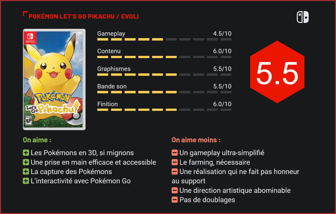 Attendu au tournant, le “remake” de Pokémon Jaune prend quelques libertés vis-à-vis du matériau d’origine, que les fans de la franchise risquent de ne guère apprécier. Explications. Second jeu Pokémon à voir le jour sur Switch, “Let’s go” était annoncé comme un épisode transitif, avant la sortie, courant 2019, d’un projet ambitieux de jeu Pokémon sur la console de Nintendo. Produit en l’espace de quelques mois seulement, le jeu de The Pokémon Company n’avait jamais l’ambition de devenir un titre à gros budget. Pour Nintendo, il s’agissait avant tout de rebondir sur le succès de Pokémon Go, le plus rapidement possible – et si possible, en créant un pont entre les deux jeux. The Pokémon Company a eu dès lors l’excellente idée de penser ce nouveau jeu comme un reboot pour la franchise, qui lui permettrait de réintroduire les joueurs qui ont découvert l’univers de Pokémon avec Pokémon Go à l’univers du jeu. Dès lors, pourquoi ne pas proposer un remake du tout premier Pokémon, sorti à l’époque sur Gameboy? Ou tout du moins, de sa refonte, baptisée Pokémon Jaune. L’idée a rapidement fait des émules, et pour cause puisque la sortie d’un remake du premier jeu Pokémon aurait forcément attiré la curiosité de ceux qui y avaient joué à l’époque. Jouant avec la fièvre nostalgique des joueurs, Nintendo ne s’est toutefois pas contenté de remettre au goût du jour le jeu original. Pokémon Let’s Go n’est à ce titre pas un véritable remake puisque la plupart des mécanismes de jeu ont été revus et quelques nouveautés majeures introduites. La sauce aurait pu très bien prendre… Si Nintendo avait pris la peine d’écouter les gamers. Car, et c’est bien là le plus gros défaut de Pokémon Let’s Go, le jeu prend de beaucoup trop grandes libertés par rapport à ses origines. Dans le fond pourtant, le concept n’a pas changé d’un iota. Le titre vous propose d’incarner un jeune dresseur de Pokémon qui tentera de capturer toutes les espèces de Pokémon et de collecter 8 badges en affrontant d’autres dresseurs de la ligue Pokémon. L’aventure débute, comme dans l’épisode originel, dans la maison du jeune dresseur, qui devra partir à la rencontre du professeur pour recevoir un Pokédex et attraper son premier pokémon – Pikachu ou Evoli, selon la version du jeu choisie. Les premières minutes permettent de se familiariser avec l’univers de Pokémon. Comme son ancêtre, Pokémon Let’s Go lorgne du côté du JRPG, avec ses séquences d’exploration entrecoupées d’affrontements et de captures de Pokémon. Les mécanismes du jeu ont toutefois changé. Dans Pokémon Let’s Go, le joueur ne devra pas affronter les Pokémons pour les capturer mais simplement leur lancer une pokéball. Le gameplay de ces séquences de jeu est calqué sur celui de Pokémon Go. Le joueur devra ainsi faire preuve de dextérité en envoyant sa Pokéball au bon moment, et en usant et abusant de baies pour attirer la créature. Une idée qui n’est en soi pas mauvaise, même si elle induit une certaine répétitivité de l’action… Dès le seuil des cent Pokémons franchis, on aura forcément tendance à être plus sélectif dans les Pokémons à capturer… Les affrontements sont toutefois toujours bien au programme, même si désormais limités aux nombreux dresseurs Pokémon qui peuplent l’île. Si, dans l’esprit, le principe n’a pas changé, avec des combats au tour par tour entrecoupés par de jolies animations, la difficulté a été rabaissée de plusieurs niveaux et il sera très difficile de perdre un combat… Notamment de par la disparition des objets à attacher au Pokémon et des compétences passives de nos créatures, également aux abonnés absents. Parcourir Pokémon Let’s Go est une véritable promenade de santé, tant le niveau de difficulté est faible. Il faudra pourtant se coltiner tous ces combats sans intérêt avant d’aller affronter la ligue Pokémon… L’introduction d’un mode coop, qui permet à un second joueur de rejoindre un combat à tout moment, était en soi une bonne idée. Malheureusement, l’ajout d’un joueur fera largement pencher la balance en votre faveur, l’I.A. ne suivant absolument pas le mouvement. Si le jeu est toujours aussi agréable à parcourir qu’à l’époque, on regrette au final que Nintendo l’ait entièrement repensé pour un public plus jeune. N’ayons pas peur de le dire, Pokémon Let’s Go n’a plus grand chose d’un RPG. Il s’agit davantage d’une application compagnon pour les joueurs de Pokémon Go ou d’une introduction à l’univers Pokémon pour les plus jeunes. Au niveau des interactions avec Pokémon Go, notons que l’interactivité entre les deux jeux demeure assez limitée, puisqu’il sera uniquement possible de récupérer ses Pokémons de la version mobile en faisant un transfert au Go Park, avant d’aller recapturer ses créatures dans le jeu. Pratique, pour se constituer rapidement une bonne équipe de Pokémons. L’ennui, et on y revient toujours, c’est que la difficulté du jeu est tellement basse qu’il ne faut pas forcément faire preuve d’une grande dextérité ni mettre en place de stratégie pour terrasser les équipes adverses. Le farming occupe toujours une part importante du gameplay, et là où le principe fonctionnait parfaitement il y a 20 ans, les standards actuels du jeu vidéo donnent à ce Pokémon Let’s go un gros coup de vieux… En définitive, difficile de conseiller un jeu qui propose certes de revivre l’aventure de Pokémon Jaune sur Switch, avec des graphismes remis au goût du jour, et des éléments de gameplay empruntés à Pokémon Go, aux joueurs qui avaient parcouru le titre à l’époque. Pokémon Let’s Go a en effet été pensé avant tout pour les plus jeunes. Et c’est là tout le problème. Car si le Pokémon est aujourd’hui beaucoup plus accessible pour les p