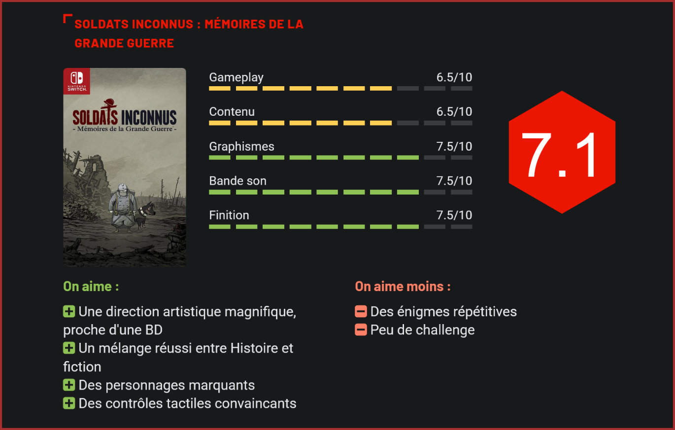 Depuis 2014, Soldats inconnus a traversé les environnements PC, Playstation (3 et 4), Xbox (360 et One) et même Android et iOS pour les besoins d’une version mobile. C’est aujourd’hui au tour de la Nintendo Switch de vibrer au son des canons de la Première Guerre mondiale, pile au moment des commémorations de l’armistice de 1918. Pour ceux qui étaient passé à côté, Soldats inconnus : Mémoires de la Grande Guerre est un jeu mêlant plateforme et réflexion issu du studio Ubisoft Montpellier qui se base sur le moteur graphique UbiArt Framework (utilisé sur le merveilleux Child of Light, notamment). Récompensé pour sa narration et son innovation lors des Game Awards 2014, le titre met en scène une poignée de personnages dont les destins vont s’entrecroiser sur le champ de bataille. On y trouve d’abord Karl, un soldat allemand marié à une française qui est enrôlé de force. Il y a ensuite Emile, un français appelé sur le front qui sera fait prisonnier et contraint de travailler en tant que cuisinier pour les Allemands. On fait ensuite la connaissance de Freddie, un américain qui a rejoint la Légion étrangère pour venger la mort de sa compagne et enfin d’Anna, une infirmière en provenance de Belgique qui veut retrouver son père. Sans oublier le fidèle Walt, un chien secouriste qui s’avèrera très utile aux différents protagonistes. Autant de personnages aux origines et capacités diverses que le joueur pourra contrôler au cours de l’aventure, qui s’étire d’août 1914 à la fin des combats en novembre 1918. Sous forme de plateformer 2D, Soldats inconnus rend hommage aux victimes de la Grande Guerre et en relate les principaux évènements à l’aide de nombreux documents. Il mêle ainsi les faits historiques par le biais de fiches et od’bjets à collecter au cours de la progression avec la pure fiction créée de toutes pièces et romancée comme il faut. On appréciera au passage que celle-ci ne fait aucunement preuve de patriotisme, évitant habilement tout manichéisme. L’intrigue, tout comme les décors traversés, évoquent de nombreux aspects du conflit comme la vie dans les camps de prisonniers, l’horreur des tranchées ou l’ambiance d’un coin de campagne reculé. Le tout sur un ton doux-amer, parfois amusant (les personnages qui s’expriment en marmonnant), souvent âpre. Difficile à caser, le jeu digère beaucoup de styles différents pour proposer un gameplay autant influencé par le point and click, la plateforme, le run and gun (les séquences avec les chars évoquent quelque peu Metal Slug, en moins nerveux) ou la bande-dessinée interactive. Le style graphique en 2D, qui est l’un des points forts du jeu, n’est d’ailleurs pas sans rappeler celui de Manu Larcenet, qui a lui aussi mis en images la Première Guerre mondiale (dans La Ligne de front, notamment). La direction artistique conserve tout son charme sur Switch, on l’on est rapidement happé par l’atmosphère du titre, qui arbore des animations très réussies, des effets de lumière travaillés et des décors détaillés. La bande-son fait aussi de son côté parfaitement le travail avec des mélodies à la fois douces et aventureuses et des bruitages très immersifs. Sans oublier une voix off en guise de narrateur qui est doublée par Marc Cassot, qui n’est autre que la voix française de Dumbledore dans Harry Potter ! La progression se fait la plupart du temps en résolvant des énigmes, dont les mécanismes sont un brin répétitifs (fournir un objet pour en obtenir un autre, activer des leviers et manivelles) et qui manquent de challenge. Néanmoins, on alterne entre séquences d’action (parfois contextuelles) et puzzle avec suffisamment de variété. A noter que cette version Switch ajoute des commandes tactiles qui s’activent dès que l’on touche l’écran (pas besoin de se rendre dans les options pour les activer) et qui s’avèrent très instinctives. Deux bonus sont aussi proposés ici avec une bande dessinée animée qui sert de préquelle et quelques artworks. Au grand dam des fans, le chapitre supplémentaire consacré à George, aviateur anglais que l’on croise brièvement dans l’aventure mais qui n’est pas jouable, n’est donc pas de la partie et restera probablement à jamais enseveli sous les notes de production. On en restera donc avec une durée globale relativement ramassée (6 à 8h max.), ce qui s’avère au final satisfaisant pour ce petit titre proposé autour d’une vingtaine d’euros. Conclusion Soldats inconnus parvient avec brio à mêler les faits historiques avec une intrigue romancée. Sa narration dépourvue de manichéisme, sa direction artistique et son ambiance sonore favorisent l’immersion tandis que le gameplay pioche dans différents styles avec efficacité. On regrettera juste des mécanismes un peu trop répétitifs au sein des énigmes ainsi qu’une difficulté trop peu élevée. Ce qui n’empêche en rien le titre de rester un bel hommage aux victimes de la Grande Guerre et ce, malgré une durée de vie relativement courte.