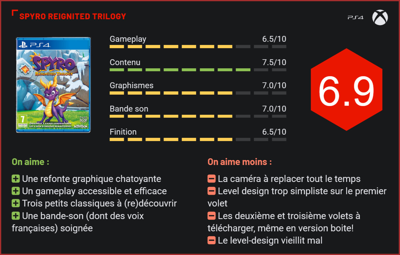 Après Crash Bandicoot, c’est au tour d’une autre icône de la fin des années 90 sur Playstation d’avoir droit à une refonte intégrale de sa trilogie fondatrice : Spyro, le dragon. Mais cette seconde jeune offerte au dragounet d’Insomniac Games est-elle toujours en mesure de séduire les joueurs nostalgiques ? Tout comme sur Crash Bandicoot N. Sane Trology, ce sont les trois premiers jeux de la série qui sont ici proposé par Activision sur les plateformes PS4 et Xbox One. Ainsi, Spyro le dragon, Spyro 2 : Gateway to Glimmer et Spyro : Year of the Dragon, sortis respectivement en 98, 99 et 2000 sur PS One, reviennent avec des graphismes flambants neufs et quelques autres petites améliorations. Sommets de la plateforme à la fin des années 90, ces titres mettent en scène un petit dragon à la peau violacée capable de planer, de cracher du feu et de charger ses ennemis. Celui-ci traverse plusieurs mondes sous forme de hub, qui sont divisés en niveaux accessibles via des portails magiques. Divers objectifs sont demandés au dragon d’une aventure à l’autre (sauver ses confrères dragons qui ont été pétrifiés dans le premier jeu, trouver des talismans dans le second et récupérer des œufs volés dans le troisième), et il a également la possibilité de collecter des joyaux. Les jeux favorisent la quête du 100% en demandant de collecter un nombre précis de joyaux, d’œufs et de dragons par niveau. So rétro. Même si terminer les jeux dans leur intégralité compose un beau petit challenge, les titres sont avant tout destinés aux plus jeunes, disposant d’une grande accessibilité et d’un univers drôle et coloré. L’entièreté des jeux a ici été refaite, cinématiques et bande-son comprises, pour un résultat véritablement chatoyant et très fluide. Le gameplay demeure incroyablement efficace et l’on retrouve ses marques immédiatement. On saute, on plane, on crache du feu, on fonce sur ses ennemis (chacun ayant ses points faibles)…et c’est à peu près tout. Cela pourra paraître un brin répétitif, surtout sur le premier volet, mais ça a au moins le mérite d’être efficace. Le dragon profite d’autres actions dans les deux suites, comme bénéficier de certains super pouvoirs. Le troisième opus comporte même des séquences en skate, probablement due à l’influence des jeux Tony Hawk sortis à la même époque. Outre de nouveaux graphismes et une bande-son recomposée, les jeux demeurent identiques à l’époque quant à leur contenu. Pas de surprise donc de ce côté, si ce n’est que l’aspect cartoon ressort ici de manière bien plus probante avec des animations ainsi que des décors plus détaillés (surtout à partir du second volet, le premier présentant des environnements un peu trop vides au vu des standards actuels). La musique se révèle un peu plus ample qu’à l’époque et les voix françaises utilisées pour les doublages sont de très bonne qualité, renforçant le ton léger et humoristique de l’ensemble. Mais retrouver Spyro n’est pas que pur plaisir. On déchantera quelque peu devant le level design limité, voire très simpliste sur le premier volet (passé l’effet nostalgique, on s’y ennuie tout de même un peu), mais celui-ci gagne heureusement un peu en profondeur au fil des épisodes, avec notamment l’ajout de passages secrets ou la possibilité d’incarner d’autres personnages dans le troisième jeu. La gestion de la caméra, qu’il faut régulièrement replacer pour bien viser ses ennemis et ne pas se vautrer lors de sauts, est quant à elle véritablement pénible puisqu’elle vient souvent se coller au personnage ou reste bloquée dans des coins où la visibilité peut s’avérer problématique. Deux aspects déjà présents dans les jeux d’origine, mais que l’on aurait aimé voir corrigé pour les besoins de ce remaster. Dernier détail qui a son importance : la version boite ne propose pas Spyro 2 et Year of the Dragon directement sur le disque. Seul le premier volet est gravé et il faut télécharger (gratuitement, bien sûr) les autres volets via la boutique en ligne. Une console connectée à Internet est donc indispensable pour profiter des trois titres ! Conclusion Plus facile et moins profonde que les trois Crash Bandicoot, la trilogie Spyro conviendra parfaitement aux joueurs nostalgiques aujourd’hui devenus parents, qui pourront ainsi retrouver leur sensation d’antan avec quelques étoiles dans les yeux et, surtout, la partager avec leurs enfants. Le remake est soigné, chatoyant et promet quelques belles heures de plateforme à l’ancienne. Seuls les placements de caméras approximatifs et un level design un peu trop simpliste font véritablement de l’ombre au plaisir retrouvé, mais ces défauts étaient déjà présents dans le passé.