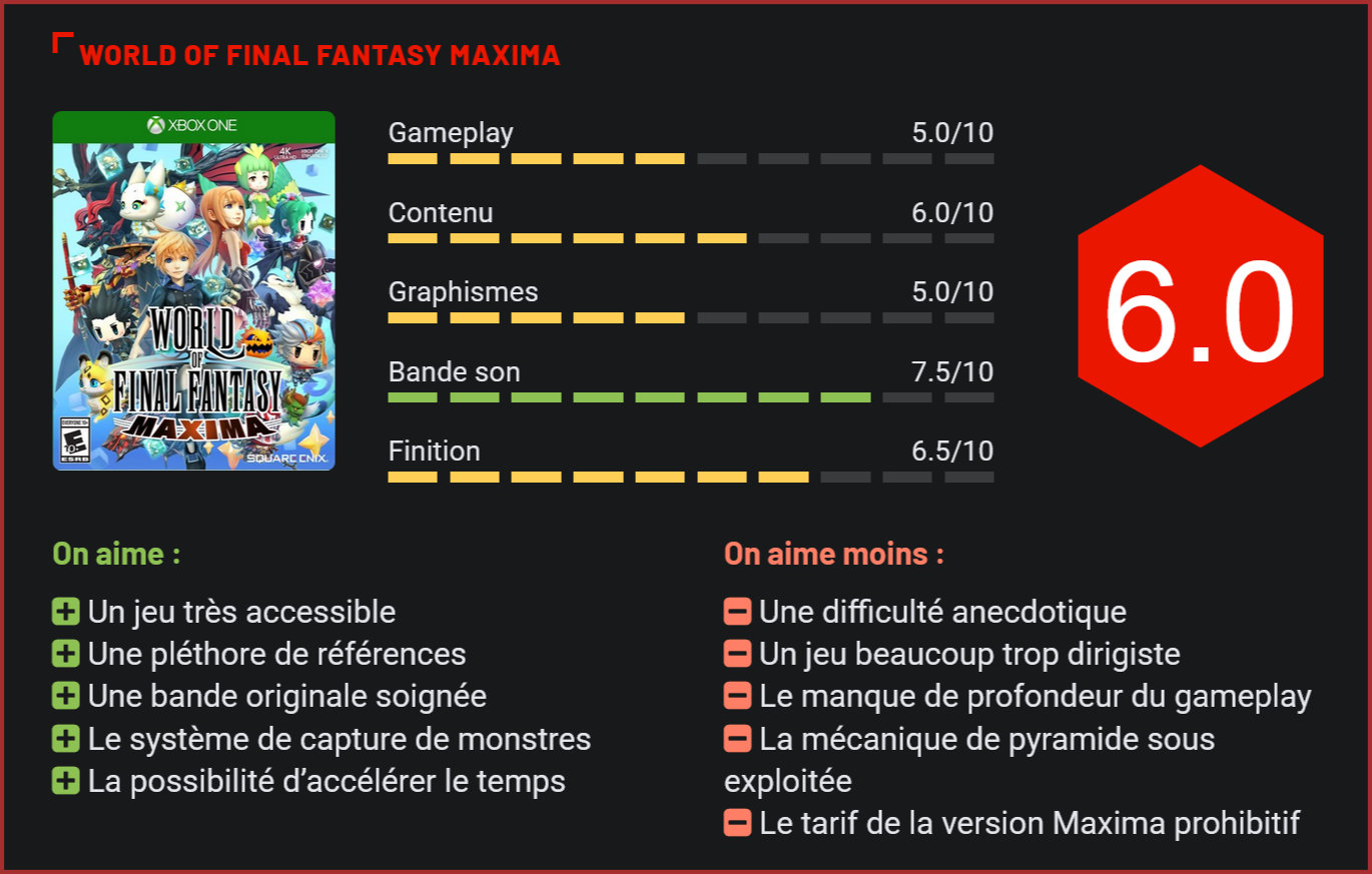 Avant tout conçu comme un véritable hommage à la saga phare de Square Enix, World of Final Fantasy Maxima débarque sur Xbox One et Switch avec cette nouvelle version enrichie du titre. Final Fantasy est une licence qui parlera sans doute à une grande majorité de joueurs et Square Enix a décidé de produire un titre à l’occasion du 30e anniversaire de la série. Développé en partenariat avec la société Tose, un studio habitué à travailler sur cette licence, le titre est bourré de références aux autres volets de la franchise, et reprend notamment une partie du casting des précédents volets. Il sera possible de les retrouver dans le monde magique du Grymoire, qui s’avère être une dimension alternative à l’univers de Final Fantasy. Le synopsis – bien que très simple – tient debout tout en introduisant au passage quelques rares nouveaux personnages. Il est notamment question de suivre les péripéties de Lann et de Reynn, un duo de jumeaux devant explorer le monde magique du Grymoire, où ils ont un rôle prépondérant en étant d’ailleurs au cœur du système de capture de créatures. Introduit pour la première fois, ce système emprunte beaucoup à la franchise Pokémon sans toutefois être un plagiat pur et simple, avec une appropriation de bonne facture. Ces mécanismes en prennent les avantages tout en étant adapté au système plus old school des premiers Final Fantasy, puisque l’on retrouve la jauge ATB (Active Time Battle) dont le tour d’action est déterminé par la vitesse du personnage. Exit le système de gestion poké-ball, puisque l’on retrouve un système simplifié et plus pratique dans World of Final Fantasy. D’ailleurs, nos protagonistes sont accompagnés de 10 créatures qui pourront aussi bénéficier du gain d’expérience lors de chaque combat. Lors de chaque passage au niveau supérieur, il sera possible de récupérer un point, qu’il faudra placer dans une forme allégée du Sphérier, système d’amélioration que l’on a pu découvrir dans Final Fantasy X. L’équipe que l’on contrôle est composée de nos deux personnages principaux, à laquelle vient s’ajouter un fonctionnement pyramidal, pour chacun de nos personnages. Cette pyramide est découpée en trois étages et il est donc possible de les compléter en fonction des monstres capturés. Ces créatures, appelées Myrages, peuvent être capturées au gré des combats, tout au long de l’aventure. Les conditions pour y arriver diffèrent d’un Myrage à l’autre, mais il n’est pas très compliqué de les découvrir lors de chaque nouvelle rencontre. Il existe deux sortes de pyramides, ceci dépend de la forme du personnage que l’on prend, puisqu’il est possible d’alterner entre une forme de personnage classique, ou une forme toute minimaliste dans un style que l’on qualifierait de Chibi, en japonais. C’est d’ailleurs l’allure qu’arborent tous les personnages humains rencontrés dans l’univers du Grymoire. Il est donc possible d’alterner à sa guise selon l’une ou l’autre forme, visible lors de nos déplacements sur la carte du jeu, et ayant donc une incidence sur l’emplacement du personnage possible. L’intérêt d’un système de « pyramide » réside dans le fait qu’empiler les personnages de la sorte permet de cumuler toutes les caractéristiques de chaque individu, comprenant également les sorts, mais aussi les faiblesses. Il faudra donc faire attention à de nombreux éléments lors de la composition de chacune d’entre elles, comprenant également une notion d’équilibre puisque cela sera impacté lors de chaque attaque physique adverse. Si jamais cet équilibre est rompu, la pyramide en question se retrouvera éclatée et chaque élément qui la compose redevient donc un simple individu, blessé au passage et sonné le temps d’un instant. Un travail plus approfondi sur ce système de pyramide aurait quand même été appréciable puisqu’il s’avère être rapidement limité, et l’on en fait le tour assez aisément. World of Final Fantasy a volontairement été conçu de manière à être très accessible, que ce soit visuellement qu’au niveau de son gameplay. Le jeu est donc simplifié et n’importe qui pourra donc profiter de l’expérience que propose Square Enix. On sent d’ailleurs que la direction artistique a été choisie pour plaire au plus grand nombre, puisque le style graphique du jeu est vraiment simple et léché, avec un côté très “kawaii”. Néanmoins le travail fourni est propre et s’intègre très bien avec les décors qui n’ont pas forcément bénéficié du même soin, mais aucun décalage ne se ressent entre les différents styles. Il est seulement regrettable que les phases d’exploration soient quant à elles excessivement simplistes et dirigistes. Bien que l’expérience soit simplifiée, il est possible pour les fans de la première heure, souvent expérimentés, d’y retrouver leur compte en modifiant quelques options afin de pouvoir retrouver leurs marques sans inconvénient. Seulement, ces choix d’ouverture et d’accessibilité ne rendent pas l’aventure et les combats très compliqués. Il faut toutefois noter que cette édition possède un mode New Game + qui proposera donc une aventure un peu plus corsée. D’ailleurs cette édition Maxima, qui est l’édition directement disponible sur certaines plateformes, est tout de même accessible à ceux qui posséderaient déjà le jeu de base, en étant proposée sous la forme d’un DLC, relativement onéreux pour le coup. Car au-delà du mode Nightmare accessible une fois l’aventure terminée, de quelques fonctionnalités et boss, les ajouts restent assez mineurs, ce qui peine à justifier l’achat de cette grosse mise à jour et qui reste au final une maigre compensation pour les quasi 20€ demandés dans ce cas. D’ailleurs, les joueurs de PlayStation Vita devront quant à eux faire l’impasse sur 