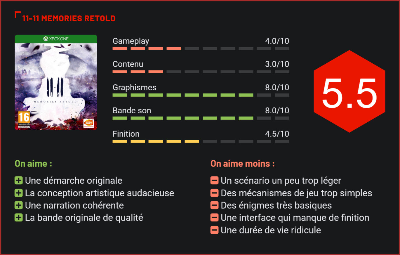 11:11 Memories Retold est le fruit d’un partenariat entre le studio français DigixArt et le studio britannique Aardman, à l’occasion de la célébration du centenaire de l’armistice de 1918. Ce nouveau titre nous conte l’histoire de deux protagonistes, de camps opposés, lors de la Première Guerre mondiale. On retrouve entre autres Yoan Fanise, qui a déjà mené le jeu Soldats Inconnus : Mémoire de la Grande Guerre, à la tête de Digixart qui œuvre sur le côté technique. Sur le plan artistique, c’est le studio Aardman qui est à l’œuvre, studio auteur de nombreux films d’animation comme Wallace et Gromit, Chicken Run ou Shaun le mouton. Le fruit du travail des deux studios consiste en un jeu vidéo narratif suivant l’histoire de deux personnages que tout oppose : l’un est un jeune photographe canadien tandis que l’autre est un ingénieur allemand. Étant tous deux envoyés au front, nous suivons donc leurs péripéties de manière alternative, et ce, jusqu’aux dernières secondes de la signature de l’armistice. La première chose qui frappe est le travail artistique produit par le les deux studios, car l’expérience visuelle produite pour 11:11 Memories Retold vaut vraiment le coup d’œil et donne l’impression de jouer à une véritable œuvre d’art interactive. L’idée provient du studio Aardman, qui a toujours voulu travailler sur un jeu vidéo, ce que Digixart a su rendre possible techniquement en produisant une aventure sublime de ce côté-là. Le résultat à l’écran donne l’impression de jouer à un tableau animé, sans cesse redessiné en fonction de nos faits et gestes. Le seul petit bémol est que les traits restent parfois un peu grossiers, ce qui peut parfois donner un résultat un peu gênant. Ceci se ressentira notamment pour réussir à facilement trouver les objets à collecter, ou sur les visages, donnant au passage un léger sentiment d’inhumanité. Si, artistiquement, le jeu est très réussi, on ne pourra s’empêcher de tiquer un peu sur la direction artistique, qui retire un certain humanisme au jeu. Passé le côté visuel, 11:11 Memories Retold nous plonge dans un jeu narratif se déroulant dans les deux dernières années de la Grande Guerre. On incarne alternativement Harry, un photographe canadien, et Kurt, un ingénieur allemand, tous deux se retrouvent propulsés au front pour des raisons qui leur sont propres. L’histoire suivie est exempte de toute violence et d’acte traumatisant, ce qui dans le fond n’est pas forcément une mauvaise idée, mais malheureusement très éloigné de la réalité. Force est de constater qu’en outre le scénario reste très plat, alors que l’on pouvait s’attendre à une histoire poignante, on se retrouve face à des scènes qui ne suscitent que peu d’émotions compte tenu du contexte. Les différentes fins ne changeront pas grand-chose à ce sentiment en dehors de pouvoir nourrir un souci de curiosité ou de complétion. Côté gameplay, les phases de jeu restent assez simples et on se retrouvera dans la plupart du temps à suivre les rails qui nous sont imposés, avec quelques moments de liberté. Ces moments sont l’occasion de pouvoir mettre en avant les particularités de chaque personnage, tout en baignant dans l’ambiance de l’époque. Chacun ayant son propre talent, il sera alors possible de prendre quelques photographies, ou alors d’effectuer d’autres tâches du côté de notre ingénieur. Cependant, le tout reste assez sommaire et ce n’est pas les quelques rares quêtes annexes ou les objets à collecter qui rendront l’expérience inoubliable. Car il faut bien le reconnaître, de façon générale, on s’ennuie ferme dans ce jeu. Alors certes, certains vous rétorqueront que le jeu n’est vendu qu’une vingtaine d’euros. Ce qui est vrai. Mais sa durée de vie ne dépasse pas les 4 heures en ligne droite, et l’expérience est loin d’être satisfaisante, malgré les très bonnes idées du studio. Une autre portion artistique à ne pas oublier, qui ne démérite pas de par la qualité de son travail, concerne l’aspect audio du titre et en particulier sa bande originale. Son compositeur, Olivier Derivière, a su composer une musique qui colle très bien avec l’ambiance du titre. On notera d’ailleurs la participation d’Elijah Wood (Le Seigneur des Anneaux) et d’Emmanuel Koch (Homeland), qui donnent voix respectivement à Harry et Kurt, et participent à rendre l’expérience narrative plus authentique, sans toutefois pouvoir donner plus de corps à un scénario qui manque de profondeur. Conclusion Ambitieux, le jeu produit par Digixart et Aardman est une expérience d’un nouveau genre, qui flirte avec les codes de l’art sans toutefois jamais vraiment parvenir à transporter le joueur. La réalisation graphique flatte la rétine, avec des tableaux riches et une approche innovante. Malheureusement, 11-11 n’en reste pas moins une coquille vide. La narration manque de profondeur, les personnages d’humanisme, le gameplay est beaucoup trop simple et on s’ennuie finalement vite dans cet univers qui a pourtant tant de charme.