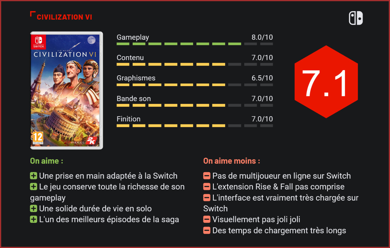 Gros succès sur PC, le dernier volet de la franchise Civilization s’invite sur Switch, pour le plus grand bonheur des amateurs de jeux de gestion et de stratégie. Comme Age of Empires, Civilization figure au panthéon des franchises de jeux de stratégie les plus populaires sur PC. La franchise, déjà déclinée sur consoles avec l’épisode “Revolution”, tente une nouvelle incursion, sur Switch uniquement, avec un portage en bonne et due forme du dernier volet de la saga. Et étonnamment, la formule fonctionne plutôt bien. Riche en contenu et en menus, le jeu de Firaxis n’était pas le plus facile à porter sur une console de jeu. Le studio de développement s’en est pourtant très bien sorti grâce à des raccourcis associés aux gâchettes des joy-con et un usage intelligent des contrôles tactiles. Que ce soit en dock ou en mode nomade, Civilization VI reste parfaitement jouable sur Switch. Certes, il restera plus confortable d’y jouer sur son PC, mais à défaut d’une machine suffisamment puissante, ce portage sur Switch fera parfaitement l’affaire! Si le gameplay du jeu s’adapte parfaitement à la machine, le contenu de cette édition reste malheureusement très maigre. L’extension Rise & Fall n’est pas proposée et le mode multijoueur en ligne est aux abonnés absents. Bien qu’il propose un mode multijoueur sur un seul écran, Civilization VI se positionne principalement comme un titre solo sur la console de Nintendo. Dommage, dans la mesure où le jeu est vendu prix plein par Nintendo. En dehors de cela, difficile de trouver quoi que ce soit à redire sur un portage qui reste très séduisant. Les commandes fonctionnent parfaitement sur Switch, le contenu du jeu reste très généreux, la bande sonore est efficace et à défaut d’être une claque graphique, le titre se révèle plutôt joli avec ses personnages cartoonesques et son univers très coloré. Seul bémol : les temps de chargement peuvent être très longs. Civilization VI sur Switch hérite donc des mêmes qualités et défauts que la version du jeu sortie sur PC. Les nouveaux venus auront sans doute du mal à maîtriser les mécanismes du jeu, la faute à l’absence de vrai didacticiel et à des mécanismes de jeu très particuliers pour un jeu de gestion & stratégie. Les habitués nageront eux en territoire connu. Globalement, Civilization VI est sans aucun doute l’un des meilleurs volets de la série. Le jeu de Firaxis séduit par son gameplay très riche et son déroulement au tour par tour. Très différent d’un Age of Empires, qui se joue en temps réel et se concentre davantage sur la gestion des troupes, Civilization propose au joueur de gérer tous les aspects de la construction de son empire, de la création de troupes aux combats, en passant par le développement de nouvelles technologies, la gestion de la diplomatie et la gestion des ressources. La prise en main du jeu reste toutefois très particulière, puisque le joueur ne peut ici réaliser qu’un certain nombre d’actions durant son tour – déplacer un groupe d’unités d’un ou deux hexagones, lancer la construction d’un bâtiment ou un recrutement -. Très complet, le jeu de Firaxis n’en reste pas moins très lent à jouer et s’adresse par conséquent à un public de passionnés. Pour faire prospérer sa cité, le joueur devra prendre en compte une multitude d’aspects. Rester alerte durant la partie est donc indispensable. Car pour remporter la partie, le joueur devra faire prospérer son empire à travers le temps, passant d’une vulgaire tribu de sauvages à un empire futuriste en l’espace de quelques heures de jeu. Si de nombreux aspects du jeu sont survolés – les combats paraîtront simplistes aux yeux des habitués de RTS, la diplomatie se limite souvent à quelques choix de réponses dans des bulles de dialogues -, Civilization 6 séduit avant tout par la richesse de son gameplay. Finalement très proche d’un jeu de société, le titre de Firaxis a le mérite d’offrir une expérience de jeu solide, divertissante et surtout très riche, et n’aura sans doute aucun mal à tenir les joueurs passionnés de gestion scotchés à leur manette durant plusieurs dizaines d’heures de jeu… Conclusion Fidèle à l’original, sorti sur PC, ce portage du jeu sur Switch est toutefois amputé du mode multijoueur en ligne du titre et de l’extension Rise & Fall, qu’on aurait pourtant apprécié voir livrée en bundle avec le jeu, le titre étant facturé au prix plein sur Switch. S’il déçoit un peu au niveau de son contenu, ce portage n’en reste pas moins une très belle réussite, avec son gameplay très riche – brillamment adapté aux contrôles de la Switch -, ses cartes gigantesques et son univers coloré. Sans aucun doute, Civilization VI est le meilleur jeu de gestion que vous retrouverez sur Switch. Mieux vaut toutefois s’y essayer avant de craquer, la prise en main très particulière de la série réservant le titre à un public de passionnés.