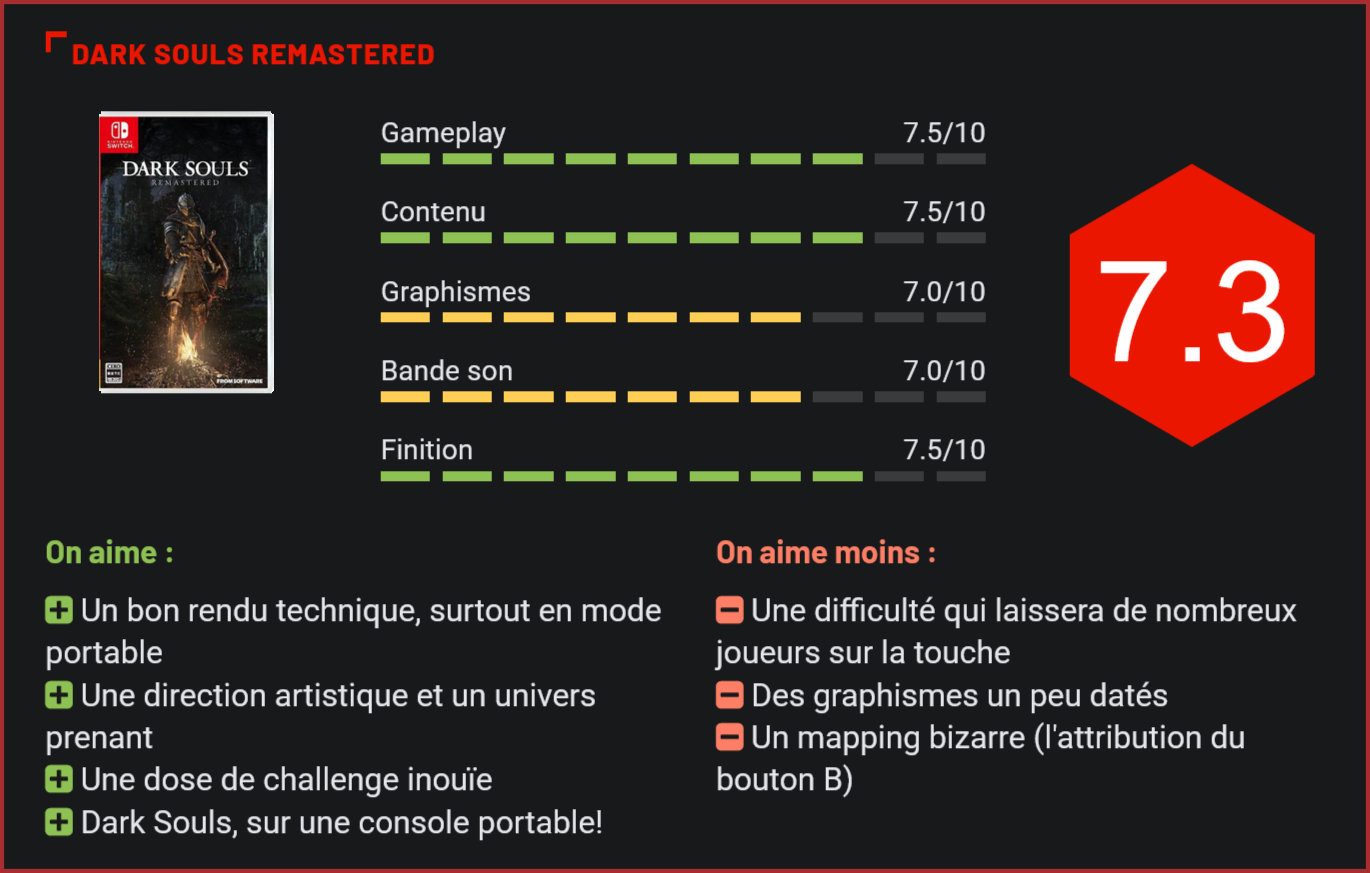 C’est le 19 octobre 2018 que débarquait Dark Souls Remastered sur la Nintendo Switch, entouré de toute son aura culte et de sa légendaire difficulté. Une réputation aucunement écornée pour ce portage à la hauteur du monument de From Software. Sortie au mois de mai sur PC, PS4 et Xbox One, la version remastérisée du premier Dark Souls aura pris son temps avant d’arriver sur la console hybride de Nintendo. Repoussé par deux fois, le célèbre action-RPG est enfin là dans sa version Switch, et donc portable. C’est bien sûr l’un des atouts majeurs de cette version. Dans son salon, dans le train ou au bord d’un feu de camp, Dark Souls peut désormais se savourer n’importe où. D’autant que techniquement, la bête tient sacrément la route. Elle n’atteint bien évidemment pas les 60 fps des versions PS4, Xbox One et PC, tablant sur un affichage 30 fps tout de même un cran au-dessus des version PS3 et Xbox 360 de l’époque (2011 déjà !). Le jeu apparaît ainsi un peu plus fluide, même s’il y a encore quelques légères chutes de framerate. Il ne faut en revanche pas s’attendre à des graphismes renversants : les textures manquent de détails et les modélisations des créatures sont anguleuses, mais l’atmosphère fonctionne, avec notamment des effets de lumière convaincants. On conseillera d’ailleurs aux plus pointilleux d’y jouer principalement en mode nomade plutôt que sur la télé, où les défauts sautent plus aux yeux. Côté gameplay, on notera le choix assez curieux d’avoir associé par défaut le bouton B pour la validation des actions. Un véritable contre-emploi pour la touche du Joy-con, habituellement destinée à l’annulation des actions. Pour éviter les fausses manipulations aussi bien dans les menus que dans les séquences d’action, on recommandera donc d’aller vite changer cela dans les options. D’autant que Dark Souls est un jeu exigeant en diable. Il faut pouvoir en maitriser chaque mouvement pour espérer en arriver à bout. Véritable die and retry, il demande une approche prudente, à base de roulades et d’esquives et de coups placés au bon moment. Il s’agit ni plus ni moins que de l’un des jeux les plus difficiles de ces dernières années, voire de l’histoire du jeu vidéo. La mort est partout, jusque dans la nature même du personnage que le joueur incarne puisqu’il s’agit d’un mort-vivant qui part en pèlerinage afin de sauver son âme. Et le bougre va vivre un véritable chemin de croix, parsemé d’ennemis et de boss (toujours surdimensionnés) capables de vous tuer en un ou deux coups, et jonché de pernicieux pièges qui vous feront enrager. Mourir n’est pas un échec mais une forme d’apprentissage dans Dark Souls, et il faut pouvoir prendre plaisir à l’échec. Inutile donc de préciser qu’il est à destiner aux hardcore gamers en quête de véritable challenge. Et celui-ci est à la hauteur ! Les joueurs les plus casuals qui voudraient s’y risquer peuvent s’attendre à un insurmontable calvaire qui les fera dépiter. Il convient donc d’être patient, très patient, et d’aimer la mort, de l’adorer même. Ajoutez à cela que les feux de camp, qui servent de point de sauvegarde, ne sont pas très nombreux et que leur utilisation ressuscite les morts précédemment éliminés dans la zone. Pervers à souhait. Pour survivre à cette galère, on pourra heureusement compter sur la collecte d’âmes permettant d’améliorer ses diverses compétences ou d’acheter du matériel. Comme sur PS4, Xbox One et PC, cette version Switch comprend le DLC Artorias of the Abyss ainsi que le mode online, moyennant l’abonnement au service en ligne de la Nintendo Switch, bien sûr. Ce mode, qui permet de s’entraider et de partager son expérience avec les autres joueurs (en laissant par exemple des notes pour prévenir d’un piège), fonctionne dans l’ensemble plutôt bien. Pour le reste, on notera que l’écran tactile a été délaissé et que l’amiibo Solaire est relégué au rang de gadget puisqu’il ne donne accès qu’à un émote (une simple pose de l’avatar) et non à des âmes supplémentaires, comme on aurait pu l’espérer. Conclusion Dark Souls Remastered sur Switch conserve toute sa saveur mortuaire. Véritable chemin de croix, ce jeu de rôle hyper-technique est à réserver aux joueurs les plus aguerris qui sont en quête de challenge. Son atmosphère unique et son gameplay exigeant les raviront. D’autant que l’expérience reste agréablement fluide en mode docké comme en nomade, ce dernier ayant le gros avantage de permettre d’emporter cette singulière saveur de mort absolument partout avec soi.