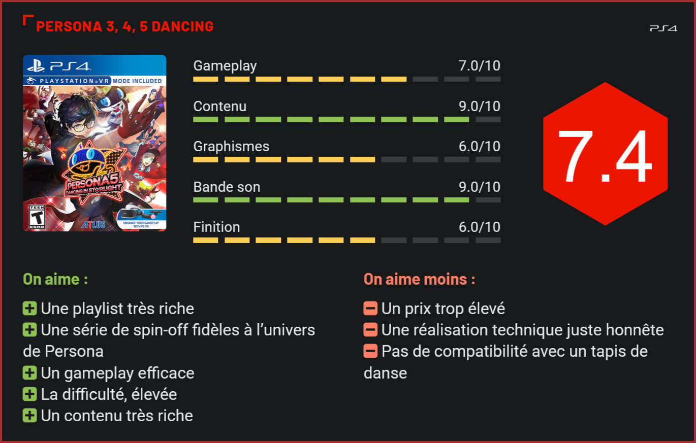 Après l’excellent Persona 5, Atlus nous livre une compilation des trois spin-off de la franchise sur PlayStation 4. L’occasion de (re)découvrir l’un des jeux les plus atypiques de ces dernières années sur la console de Sony… Les fans de Persona le savent sans doute : Atlus n’hésite pas à décliner sa franchise en toute une série de spin-off, du jeu de baston old-school au jeu de rythme. L’éditeur nous livre aujourd’hui une compilation des trois jeux de rythme sortis précédemment sur PS4 et PS Vita. Une agréable surprise pour les fans de la franchise, contraints jusqu’à aujourd’hui de se tourner vers l’import pour jouer à ces trois (excellents) jeux. Dans la veine des Dance Dance Revolution et autres part-game endiablés, Persona 5 : Dancing Star Night et ses deux prédécesseurs, Persona 3 : Dancing in Moonlight et Persona 4 : Dancing All Night, ne proposent toutefois pas de s’éclater sur un tapis de danse. Les trois jeux se jouent en effet intégralement au pad. Une approche qui pourrait rebuter les habitués du genre. Toutefois, force est de constater que le concept fonctionne également à merveille pad en main. Véritable OVNI vidéoludique, le jeu d’Atlus se destine avant tout aux fans de la franchise, qui ont récemment bouclé le cinquième volet de la série. Car ces spin-off sont avant tout l’opportunité de redécouvrir l’incroyable playlist des jeux de rôle d’Atlus. Au total, ce sont près de 100 morceaux qui vous attendent, dont une vingtaine de titres tirés du dernier volet de la série. Certes, tous ne se valent pas, mais il y en a quand même pour tous les goûts, et surtout l’éditeur reste très généreux à l’égard des fans. Bien sûr, le principal intérêt de jouer aux spin-off, c’est de redécouvrir les morceaux du jeu. Toutefois, n’en déplaisent à ses détracteurs, la compilation d’Atlus parvient également à séduire en proposant un challenge de taille et un gameplay très efficace, même au pad. Dans la pratique, le joueur devra donc réaliser des chorégraphies en appuyant en rythme sur six boutons et en faisant tournoyer ses sticks aux bons moments. Des notes apparaissent ici au milieu de l’écran et se dirigent progressivement vers les bords. Le joueur devra se contenter de presser sur les touches au bon moment. Mais attention car le niveau est plutôt corsé. Les notes ont tendance à sortir très rapidement et Atlus s’est permis quelques subtilités côté gameplay, avec des doubles-notes et des cercles à composer avec ses pads. Vu le niveau de difficulté – corsé -, les joueurs seront ravis d’apprendre qu’il sera possible d’utiliser de multiples power-ups pour faire grimper leur score ou ralentir les notes. Les musiques entraînantes, couplées à la prise en main simple mais très nerveuse du jeu, en font un jeu particulièrement addictif. Malgré son concept très simple, la compilation Persona Dancing parvient donc à séduire par sa prise en main efficace, sa bande sonore et son contenu très riche. Tout au plus regrettera-t-on l’absence de quelques modes de jeu dans certains des trois volets proposés. Le cinquième épisode ne propose ainsi pas de véritable mode solo scénarisé. Il compense toutefois ce petit défaut par la présence d’un nombre impressionnant de costumes à débloquer. Du fan-service en bonne et due forme, qui contentera même le plus exigeant des fans de la série… Sur le plan technique, les trois volets rendent brillamment hommage à la série de jeux de rôle, avec outre la bande sonore complète, des graphismes très proches des jeux de rôle. Sans être à couper le souffle, la réalisation des trois titres a le mérite d’être efficace, et surtout fidèle à l’univers de Persona. Certes, Atlus aurait pu améliorer certains éléments graphiques pour cette compilation, mais vu le budget de ces spin-off, on imagine que la priorité n’était pas vraiment là… Conclusion Après l’excellent Persona 5, Atlus nous livre une compilation de trois spin-off atypique, qui tente une approche totalement décomplexée du jeu de danse avec son gameplay nerveux et ses playlists endiablées. Pas de tapis de danse ici, mais une prise en main au pad qui n’en reste pas moins efficace. Destinée avant tout aux fans de la franchise, cette compilation parviendra sans doute à séduire les amoureux de la franchise avec son contenu généreux, une bonne dose de fan-service et usa bande sonore tout bonnement formidable.