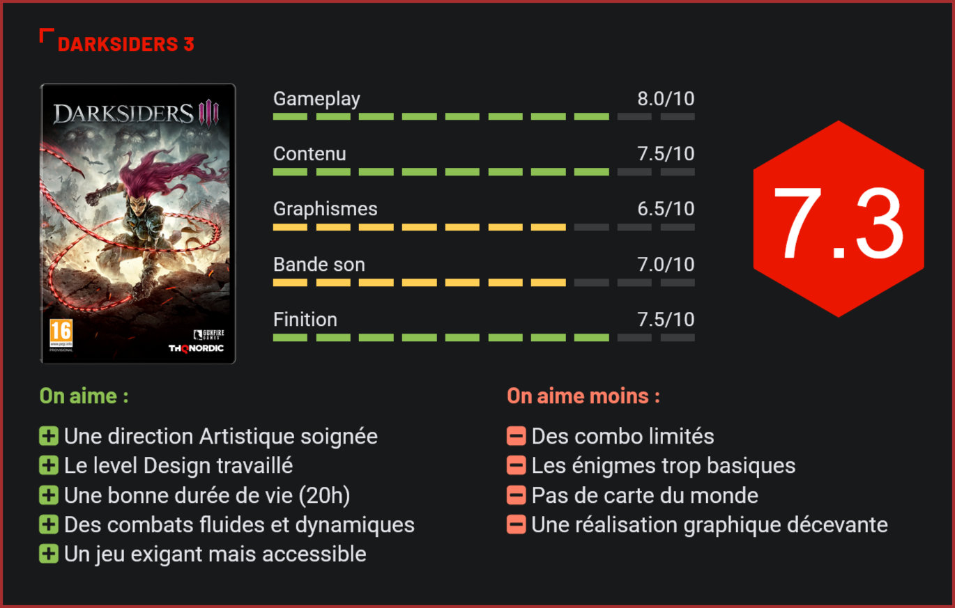 Darksiders fait son grand retour avec un nouvel épisode ayant pour héroïne un autre personnage inspiré des Cavaliers de l’Apocalypse. Après War et Death, place donc à Fury, pour un troisième volet qui se rapproche du tout premier. Très grosse surprise à l’époque, le premier DarkSiders était parvenu à séduire les gamers avec son univers atypique et ses mécanismes de jeu particuliers. Le jeu proposait d’incarner War, l’un des cinq cavaliers de l’apocalypse, propulsé sur une planète Terre ravagée par un conflit entre anges et démons. Accusé d’avoir déclenché l’Apocalypse de manière prématurée, notre personnage tente de prouver son innocence. Mélange habile de genres, le jeu lorgne ouvertement du côté du Zelda-like, tout en osant une approche beaucoup plus mature. Moins linéaire, le second épisode, qui se déroule en parallèle du premier, était parvenu à séduire les gamers grâce à ses mondes beaucoup plus vastes et ses décors plus “dark”. Le jeu proposait d’incarner Death (Mort), un autre cavalier de l’apocalypse, qui, ne pouvant rester dans l’attente du jugement de son frère, ne reste pas les bras croisés et part de son côté afin de trouver un moyen de l’innocenter. Initiée par le studio Vigil Games, la licence s’est retrouvée dans un véritable statu quo après la banqueroute de son éditeur, THQ. Personne ne s’était manifesté à l’époque pour reprendre le studio, ceci l’obligeant donc à fermer ses portes en 2013. Alors que la licence Darksiders a suscité bien des convoitises de la part de certains studios prestigieux comme PlatinumGames (Vanquish, Bayonnetta), c’est au final l’éditeur Nordic Games qui a récupéré la franchise, avant de devenir THQ Nordic. Au-delà de s’approprier le nom et les couleurs de l’ancien éditeur américain, THQ Nordic se préoccupe de continuer le développement de certaines licences laissées de côté, dont Darksiders. Alors que certains de ses géniteurs comme Joe Madureira, à l’origine de la Direction artistique si particulière de la saga, ont depuis fondé leur propre studio, d’autres se sont regroupés pour fonder Gunfire Games. D’ailleurs, le studio a déjà pu retravailler sur la série en produisant la Deathinitive édition du second épisode. Après de nombreuses péripéties, la licence n’est pas tombée dans les limbes et nous permet de suivre les aventures de la seule protagoniste féminine au sein du groupe des Cavaliers de l’Apocalypse, Fury. L’histoire de cet épisode n’a aucun rapport direct avec les deux premiers, en dehors du contexte apocalyptique terrestre. Fury est envoyée sur Terre par le Conseil Ardent afin de débusquer et de capturer les 7 Péchés capitaux. Dès les premières minutes de jeux, il est possible de retrouver ses marques dans une version plus moderne que ses prédécesseurs. On a donc affaire a un jeu nettement plus simplifié, mais se déroulant dans un monde plutôt ouvert. Il faut comprendre par là qu’il est possible de chasser les Péchés capitaux dans l’ordre de son choix, même si une suite logique s’instaure rapidement afin de pouvoir récupérer certaines armes spécifiques permettant de débloquer certains accès, parfois secrets. Cette simplification est d’ailleurs présente depuis l’interface jusqu’au cœur du gameplay, que ce soit pour les phases de combat ou l’aspect jeu de rôle. On démarre le jeu avec un fouet tranchant et il sera possible d’en récupérer 5 autres, dont certains sont liés à des éléments comme le feu ou la foudre. Chacune d’entre elles a ses propres combinaisons d’attaques qui sont cependant très limitées et qui s’avèreront rapidement répétitives, fort heureusement les quelques améliorations d’armes forceront à en changer à la volée. Les mécaniques propres aux RPG, que l’on retrouvait déjà dans les jeux précédents, sont ici largement plus limitées. Exit l’arbre de compétence puisqu’il faudra se contenter d’améliorer ses armes avec les objets récupérés çà et là, ainsi que seulement 3 caractéristiques avec les âmes récupérées, ces âmes bleues étant la monnaie du jeu. Cependant, cette simplicité ne bride en rien l’évolution et ne limite pas l’expérience de jeu. Les combats seront la partie la plus épineuse du titre et il faudra se familiariser avec la technique d’esquive. Il est en effet possible lors d’un appui au bon moment, provoquant au passage un ralenti, de porter un coup procurant des dégâts plus importants. Il faudra donc se familiariser avec les mouvements de ses adversaires avec cette unique mécanique de défense. Ceci rappelle pour beaucoup la série des Dark Souls, avec toutefois un gameplay largement plus nerveux. Ce n’est d’ailleurs pas le seul élément emprunté à la série de FromSoftware, puisqu’il sera possible de récupérer de la vie grâce à des potions de soin rechargeables, ainsi que de devoir récupérer ses âmes perdues lors d’une défaite. Bien heureusement, Darksiders 3 se veut être largement plus accessible et permissif même lors de morts répétées. Il faudra d’ailleurs rester particulièrement sur ses gardes lors de la présence de plusieurs ennemis à l’écran, surtout que le mode de ciblage reste un peu archaïque et que le titre manque de visibilité, en particulier lors de l’utilisation de certaines techniques. La mécanique de changement de pouvoirs, d’armes ou d’objets n’est là aussi pas toujours très pratique, en particulier lors de moments assez stressants et il faudra apprendre à faire avec. Cette simplification à outrance de ces différentes mécaniques, par rapport à ce qu’il avait été possible de voir par le passé, ne donne cependant pas une impression de manque. Il n’aurait toutefois pas été un mal d’avoir une palette de coups plus importante, même s’il est possible de pouvoir s’en sortir, et ce, tout au long de l