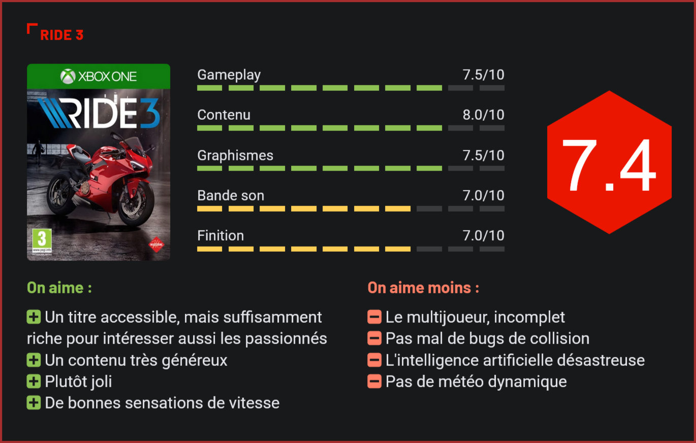 Trois ans après ses débuts, Ride connaît déjà une troisième itération. La série de Milestone, qui avait débuté avec de petites ambitions, voit aujourd’hui très grand. Mais Ride a-t-il vraiment le potentiel de s’imposer auprès des passionnés des deux roues? Spécialiste des jeux de course, Milestone s’est concentré ces trois dernières années sur le développement de sa propre licence de jeux de moto, baptisée Ride. Les deux premiers volets, plutôt réussis, étaient parvenus à séduire les passionnés de sport automobile. Ils disposaient toutefois de trop gros défauts pour imposer la série comme un incontournable auprès des gamers. Trois ans après ses débuts, la série prend finalement son envol avec un Ride 3 qui semble avoir enfin trouvé la recette du succès… Pour cette cuvée 2018, les développeurs sont repartis d’une feuille blanche. Ride 3 inaugure en effet l’usage d’un nouveau moteur graphique – en l’occurrence l’Unreal Engine 4, qui remplace le moteur maison du studio milanais. Le résultat est à la hauteur de nos attentes, même si Ride 3 n’est pas vraiment ce qu’on pourrait appeler une claque graphique. Le jeu de Milestone se classe sans difficulté dans le haut du panier. Les motos ont été modélisées avec un niveau de détail tout simplement impressionnant. Les décors sont superbes. Et par dessus le marché une attention toute particulière a été accordée aux effets visuels comme la pluie, au rendu photo-réaliste, ou les effets de lumière. L’autre bonne nouvelle concerne le contenu du jeu. Cette cuvée 2018 est particulièrement généreuse, avec un line-up de 230 bécanes, 27 circuits – dont certains très originaux -, et l’ajout de conditions météorologiques qui impactent réellement la conduite (mais qui ne sont toutefois pas dynamiques). Le mode solo a en outre été retravaillé pour proposer une expérience de jeu très riche, avec bon nombre de challenges, compétitions et défis auxquels il faudra participer pour débloquer toutes les bécanes du jeu. Outre les défis habituels, on retrouve quelques séquences nostalgie qui permettront aux joueurs de (re)découvrir l’histoire des modèles les plus emblématiques. Un mode solo classique, mais d’une efficacité redoutable. Cerise sur le gâteau, Ride conserve les nombreux éléments de personnalisation de ses ancêtres, qui permettent au joueur de personnaliser sa moto dans les moindres détails et de customiser au maximum l’expérience de jeu. Là où les choses dégénèrent, c’est au niveau de l’intelligence artificielle, tout bonnement désastreuse. Celle-ci ne prend jamais en compte le comportement du joueur. Résultat? Les autres motards n’hésiteront pas à vous foncer dedans si vous vous placez sur leur chemin. Plus inquiétant : ils ne seront jamais déstabilisés lors des chocs… C’est bien simple, on a ici affaire à des bots qui suivent le tracé idéal sans jamais se préoccuper du joueur. Pour ajouter à notre malheur, on remarque la présence de quelques bugs d’affichage mais également de physique, pas franchement folichons. La conduite a toutefois un peu évolué par rapport à Ride 2. Plus réaliste que son ancêtre, le jeu prend désormais en compte les déformations du terrain, les conditions météorologiques changeantes et les différences surfaces. L’immersion n’est que meilleure. Très accessible par nature, le jeu propose une expérience plus réaliste une fois les aides désactivées. Il réunira ainsi passionnés de sport automobile et débutants, à la recherche de sensations fortes. Car cela reste incontestablement l’un des plus gros atouts de Ride : le jeu reste très généreux en sensations fortes, avec des sensations de vitesse poussives et de bonnes sensations de conduite. On apprécie également les quelques améliorations apportées à la bande sonore du jeu, avec des bruitages beaucoup plus réalistes et des sonorités plus nerveuses. Comme les précédents volets de la série, Ride 3 souffre malheureusement d’un mode multijoueur ultra-classique qui ne brillera ni par l’absence de salon, ni par celle d’un mode local, pourtant indispensable pour les amateurs de jeux automobiles. Dommage, car à quelques gros défauts près, Ride 3 frôlait la perfection. Conclusion Après deux épisodes très séduisants, mais qui manquaient de ce petit quelque chose qui aurait fait de Ride un incontournable, Milestone semble avoir enfin trouvé la recette et nous livre un troisième volet qui devrait logiquement séduire les passionnés de deux roues. Généreux en contenu, le jeu de Milestone se révèle également très agréable à parcourir et a droit de surcroît à une réalisation graphique digne de ce nom. C’est au niveau de la finition que le bas blesse, avec un mode multijoueur encore imparfait, quelques bugs et une intelligence artificielle malheureusement loin d’être au top. Malgré tout, le résultat reste très convaincant et très prometteur pour l’avenir de la franchise…