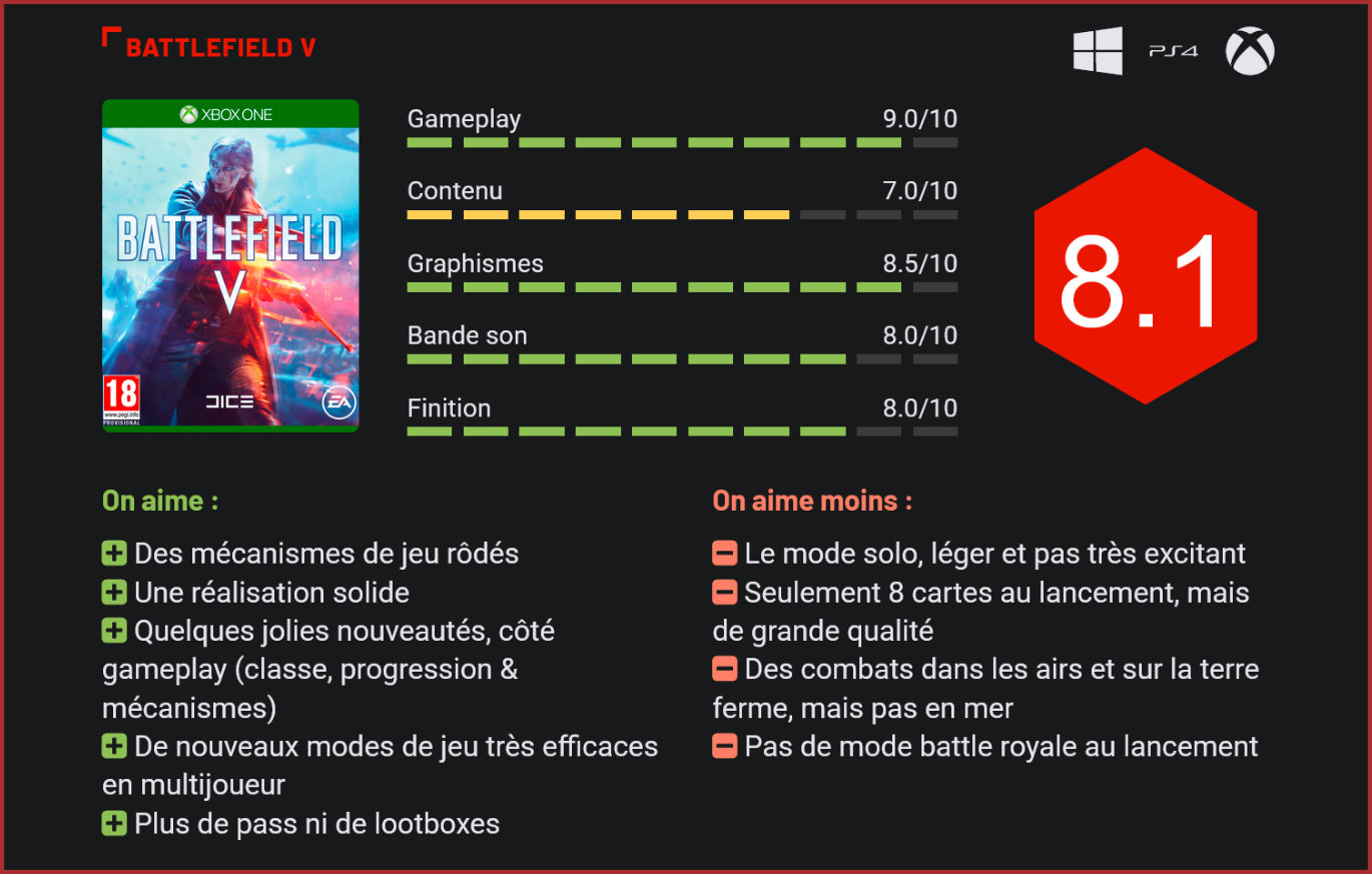 Arrivé tardivement, face à un Call of Duty qui lorgne de plus en plus vers le titre purement multijoueur, le nouveau Battlefield reprend les mécanismes du précédent volet tout en changeant de chronologie. Exit la Première Guerre mondiale et place cette fois à la Seconde Guerre mondiale, pour un titre qui lorgne lui aussi de plus en plus du côté du Battle royale. Nombreux étaient les joueurs qui avaient fait part de leur crainte de voir le studio suédois Dice se reposer sur ses lauriers après Battlefield 1. Les premières bandes annonces de Battlefield 5 avaient donné des sueurs froides à plus d’un joueur. Fidèle à ses promesses, Dice livre toutefois l’un des meilleurs FPS de 2018, et incontestablement l’un des meilleurs jeux multijoueurs du moment. C’est un fait, Fortnite a bousculé le marché du jeu vidéo. Depuis près d’un an maintenant, les clones du jeu d’Epic Games se multiplient. Même les plus grosses franchises cèdent aux sirènes du battle royale. Il y a quelques semaines, Activision nous livrait ainsi son premier Call of Duty 100% multijoueur, qui introduisait pour la toute première fois un mode Battle Royale. Plus timides, Electronic Arts et Dice nous livrent un jeu qui conserve une campagne solo scénarisée, mais qui introduit lui aussi un mode Battle royale. Il faudra toutefois se montrer patient avant de pouvoir y goûter, puisque celui-ci ne devrait prendre son envol qu’en 2019. Contrairement à Activision, Electronic Arts a fait le pari un peu fou de lancer son jeu sans mode Battle Royale au lancement. Une grosse partie du solo et du multijoueur ne sera d’ailleurs déployée qu’à travers de futures mises à jour. Dans sa forme actuelle, Battlefield 5 est donc très proche de son ancêtre, Battlefield 1, puisqu’il reprend une grosse partie des mécanismes de son ainé, son moteur graphique ainsi que les fameuses War Stories, qui permettent de découvrir plusieurs pans du conflit, de plusieurs angles différents. L’éditeur américain semble toutefois avoir appris de ses erreurs – et a très logiquement décidé de retirer de son jeu lootbox et microtransactions. Exit également le fameux modèle de Season Pass si contraignant (et coûteux) pour les joueurs. Avec Battlefield 5, Electronic Arts revoit entièrement sa stratégie et propose un titre sans DLC payants qui devrait – à l’image de Red Dead Redemption 2 – continuer à évoluer à travers les mois. Objectif : éviter une grande braderie et proposer aux joueurs un jeu sous la forme de service. Au cours des prochains mois, les joueurs pourront donc découvrir de nouvelles missions en solo, de nouveaux modes de jeux mais aussi de nouvelles cartes multijoueurs. Une belle promesse qui devrait permettre à EA de fédérer une belle communauté autour de son jeu. L’inconvénient de ce modèle, c’est qu’au lancement, le contenu du jeu reste relativement limité, puisqu’on retrouvera seulement 8 cartes à explorer en multijoueur et seulement 3 War Stories – pour à peu près 4h de jeu en solitaire, ce qui reste assez maigre. D’autant plus que les War Stories en question sont moins captivantes que dans Battlefield 1. N’espérez pas redécouvrir les plages de Normandie ni vous lancer dans la Bataille des Ardennes ici, puisque Dice a choisi de se concentrer sur des campagnes méconnues de la Seconde Guerre mondiale, avec des séquences de jeu à ski totalement inédites en Norvège, des affrontements en Provence, et une guerre fratricide en Afrique du Nord. Si la narration est une réussite – malgré quelques partis-pris qui dérangeront sans doute les historiens -, la campagne solo de Battlefield 5 ne parvient pas vraiment à briller, la faute sans doute à ses scripts trop visibles, des séquences souvent trop peu spectaculaires et un niveau de difficulté beaucoup trop bas. Certes, il a le mérite d’exister, mais le résultat n’est malheureusement pas vraiment à la hauteur. On espère dès lors que les futures War Stories corrigeront un peu le tir, même si cela semble à priori fort peu probable. Sans surprise, l’accent a été mis sur le mode multijoueur du jeu. Dice reprend la recette de Battlefield 1, tout en l’affinant. Il ne faut donc pas s’attendre à un simple copié-collé de la cuvée 2016. Battlefield 5 hérite ainsi du système d’escouades de Battlefield 1. Pour espérer remporter la partie, le joueur devra apprendre à coopérer avec les autres joueurs de son escouade, qui progresseront ensemble sur le champ de bataille, faisant avancer la « ligne de front ». Un mécanisme de jeu intelligent, et qui avait déjà fait ses preuves dans Battlefield 1. La bonne nouvelle, c’est que Dice a peaufiné sa recette en introduisant quelques petites nouveautés qui rendent plus indispensable encore la coopération entre joueurs. Ainsi, il est désormais possible de réanimer l’un de ses compagnons d’arme à tout moment. Le chef d’escouade pourra lui désormais demander des « supply drops », qui fourniront un avantage tactique certain sur le champ de bataille. La fonction est toutefois limitée par le nombre de points acquis par l’équipe au cours de la partie. Plus l’escouade a de points, plus elle sera en mesure de faire appel à d’importants renforts. Autre changement de taille : les joueurs n’auront que deux chargeurs de réserve et un kit de soin en début de partie. Pour récupérer des munitions, ils pourront soit abattre des ennemis, soit faire appel à leurs coéquipiers. Bref, à moins d’être totalement suicidaire, mieux vaut apprendre à jouer en équipe. Pour le reste, on ne change pas une recette qui marche : Battlefield 5 reste un titre multijoueur explosif, qui propose des affrontements sur des cartes de taille impressionnantes, presqu’entièrement destructibles, et qui proposent généralement leur lot de véhicules à piloter. Exit toutefois le combat naval dans ce volet, qui fait la part belle aux ballet