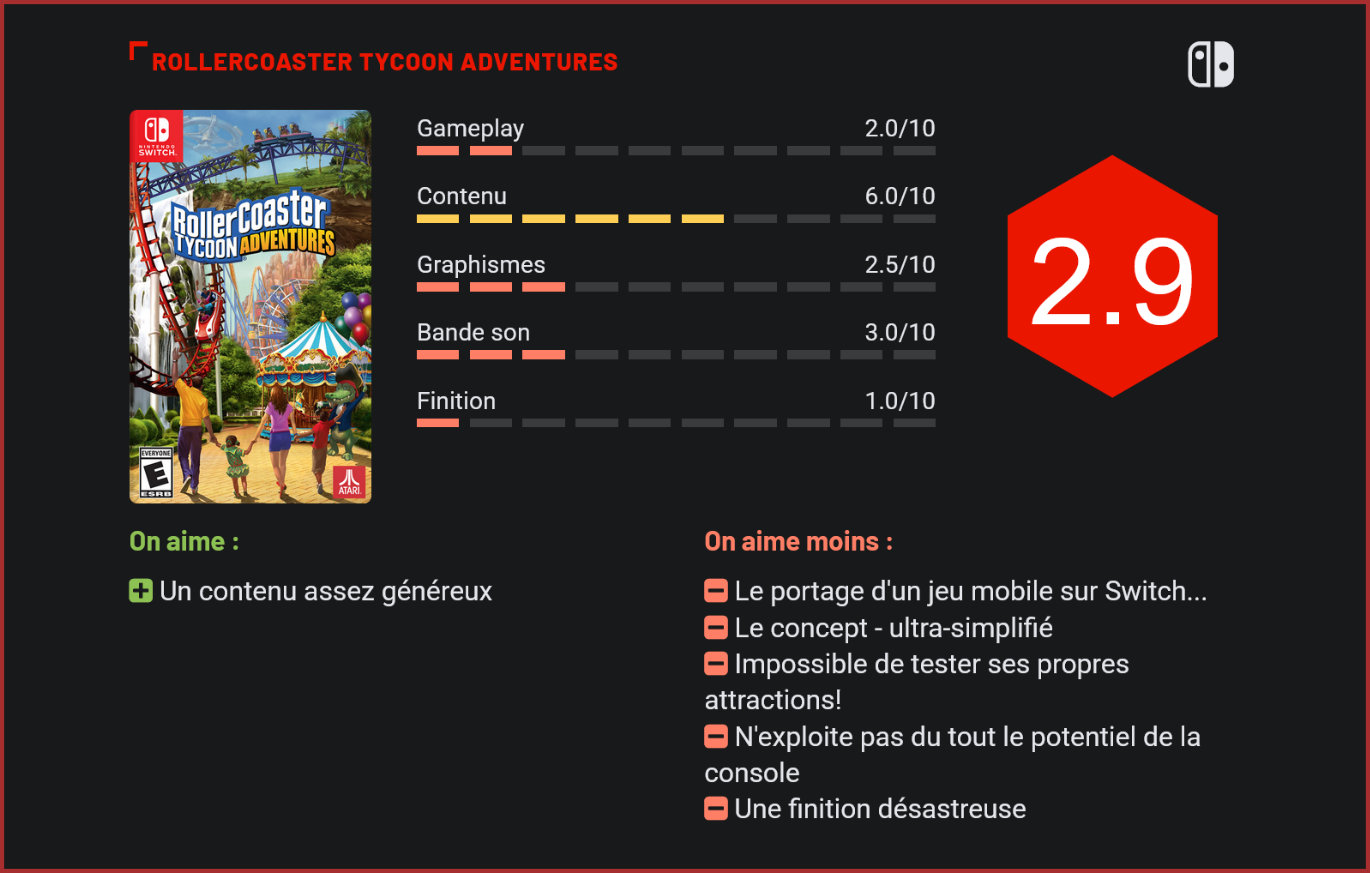 Bien connue des amateurs de parcs d’attractions, la série des RollerCoaster Tycoon tente aujourd’hui une incursion sur Switch avec un spin-off qui n’entrera pas dans l’histoire du jeu vidéo… Drôle d’idée que celle d’Atari de porter une série culte comme RollerCoaster Tycoon sur Switch en prenant comme référence la déclinaison mobile du jeu, qui simplifiait à l’extrême le gameplay de la série. Dans la pratique, inutile donc d’espérer retrouver les sensations d’antan. Cet épisode de la franchise reprend dans les grandes lignes le concept du premier RollerCoaster Tycoon tout en réduisant drastiquement l’éventail des actions à disposition du joueur. Ainsi, pas de gestion des besoins des visiteurs de votre parc, qui déambulent de façon totalement aléatoire dans votre parc d’attractions. La plupart des éléments sont gérés de façon “générale”. Ce qui signifie que les visiteurs de votre parc n’ont pas de besoin spécifique et que tout ce petit monde se gère beaucoup plus facilement puisqu’il suffira d’ouvrir un stand de hot-dog pour réduire l’appétit ou la soif des visiteurs. Le positionnement du stand importe peu ici : ce qui compte, c’est de répondre le plus rapidement possible au “besoin”. Il en va de même pour ce qui est de vos employés : pas d’embauche ni de salaire dans RollerCoaster Tycoon Adventures. Tout l’aspect stratégique et de micro-management passe donc à la trappe, réduisant le concept de RollerCoaster Tycoon à un jeu de gestion “pour les débutants.” Si on comprend l’approche de l’éditeur, qui a visiblement choisi de cibler une audience plus jeune, difficile de passer sur les nombreux défauts du jeu. C’est un fait, cet épisode est un titre fini à la truelle. Les bugs sont légion. Le gameplay a été fondamentalement mal pensé pour la console, avec des polices trop petites pour l’écran de la Switch et une prise en main abominable – en particulier lorsqu’il est question de créer ses propres montagnes russes. Et on sent d’entrée de jeu que les développeurs se sont contentés du minimum syndical pour ce portage. Pour prendre un exemple concret, nous citerons l’attitude des visiteurs dans les montagnes russes, qui gardent les bras en l’air en toute circonstance, même lorsque leur wagonet est à l’arrêt! Côté réalisation technique, on se retrouve face à un jeu mobile qui n’a pas vraiment fière allure sur grand écran. Les décors colorés sont là pour jouer les cache-misère. Dès que l’on zoome un petit peu sur son parc d’attraction, on se rend compte des moyens minimalistes déployés pour ce portage. Les décors sont pixélisés, les visiteurs du parc modélisés à la truelle et les modélisations dignes d’un titre sorti il y a plus de 15 ans sur PC. En vue éloignée, le jeu fera illusion. Mais guère plus. Inutile de le préciser : ce jeu ne fait pas vraiment honneur à la plate-forme sur laquelle il tourne… Là où le bas blesse, vu le positionnement “casual” du jeu, c’est qu’il impossible de tester ses propres attractions. Impossible également d’explorer son propre parc d’attractions, en incarnant l’un des visiteurs du site. Pour ajouter à notre malheur, les développeurs n’ont même pas pris la peine de fluidifier leur jeu. Dès que le parc s’agrandit, le frame-rate a tendance à baisser. Les nombreuses fautes d’orthographe dans les textes et les menus ne font que confirmer le manque de finition dont a été victime ce jeu, sorti probablement à la hâte pour remplir le line-up de fin d’année… Dommage, d’autant plus que le contenu du jeu était relativement conséquent, avec 4 environnements différents, 16 scénarios-missions et une grande diversité d’attractions à disposer. Conclusion Si l’idée de porter RollerCoaster Tycoon sur Switch n’était pas mauvaise en soi, le résultat se montre toutefois très décevant. Et pour cause puisqu’Atari nous livre le portage d’un jeu mobile sur Switch. Exit la richesse du jeu de gestion que l’on a connu sur PC, et place à un titre d’une simplicité déconcertante, qui se destine à une audience beaucoup plus jeune. Un changement de cap qui aurait pu fonctionner si Atari s’était donné les moyens de réussir. Avec son moteur graphique d’un autre temps, sa réalisation désastreuse et son concept sous-exploité, RollerCoaster Tycoon Adventures aura bien du mal à convaincre les joueurs.
