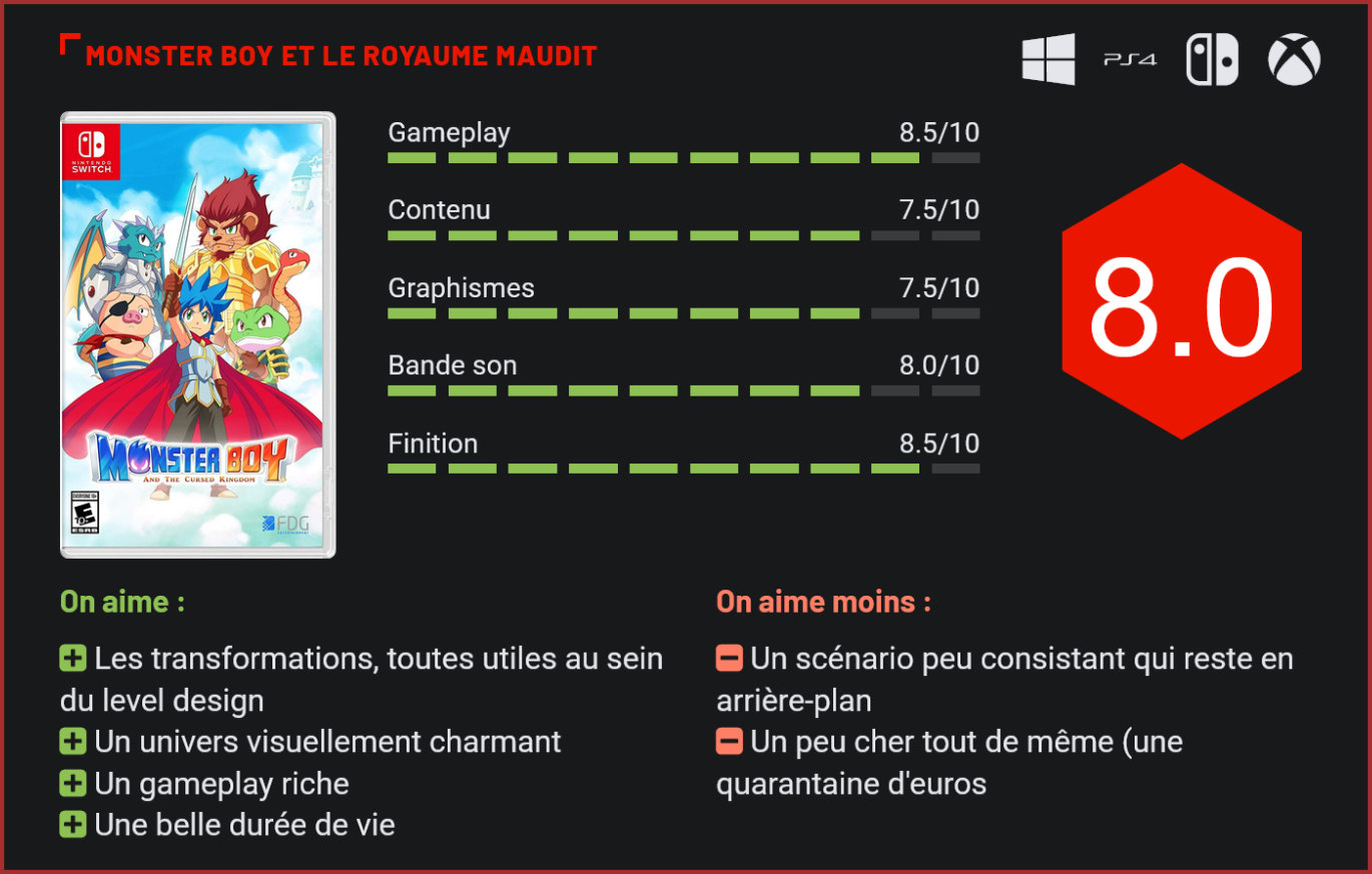 C’est au studio français Game Atelier que l’on doit ce Monster Boy et le Royaume Maudit, jeu d’action-aventure lorgnant du côté de Metroid et surtout de la saga Wonder Boy de Sega, puisqu’il bénéficie de l’aura de son créateur. Sorti au début du mois de décembre sur toutes les plateformes, Monster Boy et le Royaume Maudit a été développé en parallèle du remake Dragon’s Trap sorti l’an dernier. Comme ce dernier, le jeu rend hommage à la série Wonder Boy sur Sega, bénéficiant d’ailleurs du regard de Ryuichi Nishizawa, le papa de Wonder Boy in Monster World. Cette nouvelle aventure entièrement inédite nous fait incarner le jeune Jin qui part à la recherche d’orbes afin de faire lever la malédiction qui s’est abattue sur le Royaume de Monster World, transformant tous ses habitants en animaux. Une malédiction dont est en partie responsable l’oncle fou du héros. Le gameplay emprunte aux bons vieux Metroid en permettant de débloquer au fur et à mesure jusqu’à six transformations (en comptant son apparence humaine) et des capacités qui ouvriront de nouvelles voies. Au programme : ennemis, boss, trésors, cachettes et truffes à dénicher (qui débloquent ou améliorent les pouvoirs). Des pièces d’équipements sont aussi à trouver, Jin pouvant changer d’épée, de bottes ou de bouclier au besoin. Selon l’équipement choisi, on débloque le double saut, le renvoi de projectiles ou encore la création de blocs de glace. De nombreuses capacités et subtilités sont à découvrir au fil de l’aventure, qui propose une jolie durée de vie (une quinzaine d’heures) pour un titre, rappelons-le, indépendant. Mais le must revient aux différentes transformations du héros, qui a lui aussi muté en animal. Au fur et à mesure de ses pérégrinations, il pourra ainsi prendre l’apparence d’un cochon, d’un serpent, d’une grenouille, d’un lion et d’un dragon. Sous la forme du cochon, impossible d’utiliser une épée ou tout autre équipement, mais en revanche, vous bénéficiez de sorts (comme le lancer de boomerang ou de boules de feu, pour ne citer que ceux-là) et d’un sens olfactif sur-développé pour révéler des passages et indices, ou encore trouver les truffes cachées. Le serpent peut quant à lui se glisser dans les plus petits trous et rester accroché à certaines surfaces ; la grenouille utilise sa langue pour se propulser ou gober des ennemis (ce qui redonne de la vie); le lion peut lancer une charge destructrice sur certains blocs qui barrent le passage et le dragon peut voler et cracher du feu. Chacune de ses capacités est utilisée au sein du level design, qui se complexifie lui aussi durant l’aventure. Parfois, plusieurs d’entre elles seront même à combiner pour pouvoir résoudre les nombreuses énigmes qui émaillent l’aventure. S’il apparaîtra au premier abord enfantin aux yeux de certains, Monster Boy et le Royaume Maudit s’avère en réalité assez riche et dispose d’une belle difficulté progressive, sans jamais s’avérer insurmontable. Comme dit plus haut, le level design s’enrichit de plus en plus en progressant, et certaines zones s’apparenteront à des donjons labyrinthiques où il faudra faire preuve d’observation. Ajoutez à cela une dimension RPG avec des pièces d’équipements à améliorer chez un forgeron, et vous obtenez un jeu très riche et complet. Visuellement, le titre est très coloré et bénéficie de jolies animations avec de nombreuses trognes et mimiques irrésistibles. Tout se déroule en 2D (les décors sont aussi joliment détaillés), à l’exception de quelques passages en arrière-plan, finalement peu nombreux. Les morceaux de musique, aussi beaux qu’entêtants, participent également à une immersion totale dans cet univers chatoyant et très kawai (le cochon fait très Ranma ½, par exemple). Seuls les réfractaires à ce style pourraient adopter une attitude répulsive. Mais ce serait passer à côté d’un excellent jeu. Conclusion Il n’y a pas grand-chose à reprocher à ce Monster Boy et le Royaume Maudit qui, outre afficher un univers joliment coloré et animé, bénéficie d’un gameplay riche en adéquation avec le level design. On pointera peut-être juste du doigt un manque d’originalité dans la narration et une très grande accessibilité qui pourrait décevoir les puristes en quête de challenge. Pas que ce Monster Boy en soit dépourvu, mais sa difficulté progressive reste à la portée des plus observateurs. Pas vraiment un défaut en soi pour un titre auquel petits et grands pourront facilement y trouver leur bonheur, d’autant que la durée de vie (15h environ) est très honorable.