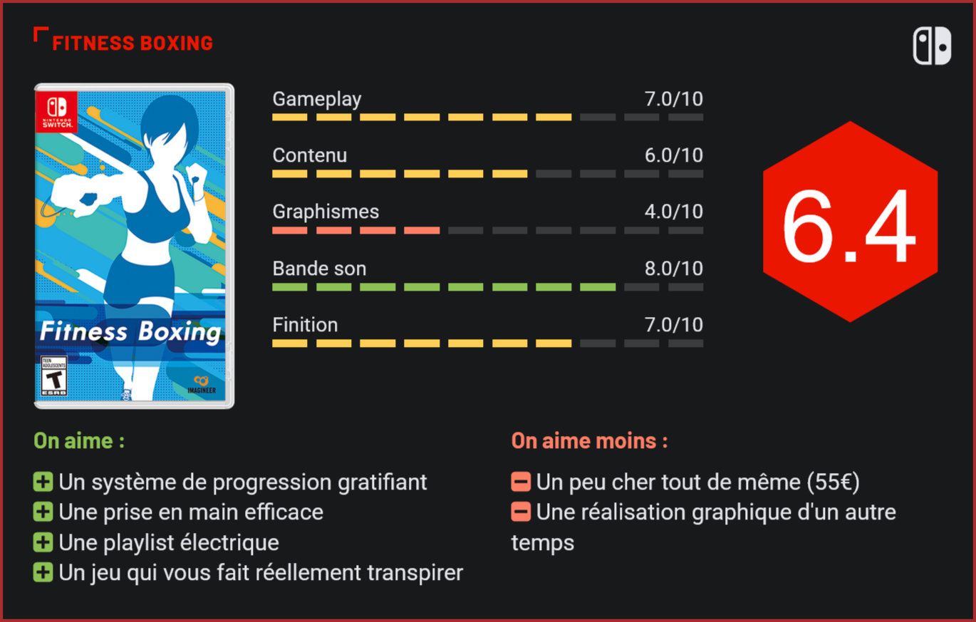 A côté de son Super Smash Bros et de Mario Party, Nintendo livre une autre exclusivité pour les propriétaires de sa Switch en cette fin d’année, avec un véritable programme d’entraînement pour les amateurs de fitness. Après Wii Fitness, Nintendo retente sa chance sur le segment des jeux de remise en forme avec un titre beaucoup plus nerveux qui vous fera brûler les calories gagnées durant la période des fêtes de fin d’année. Vendu au prix plein (54,99€ tout de même), le jeu propose toutefois un contenu très riche, avec des programmes de remise en forme efficaces et une prise en main qui épouse parfaitement le principe de la console… Là où le titre surprend agréablement, c’est dans sa capacité à faire suer le joueur, à l’inverse de la majorité des programmes de remise en forme croisés sur les précédentes générations de console. Nintendo l’a bien compris : les joueurs veulent des résultats. S’adressant tant aux débutants qu’aux sportifs endurcis qui tiennent simplement à entretenir leur forme, Fitness Boxing permet aux joueurs de créer leur propre programme d’entraînement, des exercices à enchaîner aux playlists complètes ! Le degré de personnalisation est tout bonnement impressionnant. L’autre richesse du jeu, c’est de proposer des programmes très riches, avec des entraînements qui poussent réellement le joueur à se dépasser. Exit les sessions de 5 minutes. Il sera ici question de sessions beaucoup plus longues, de 30 à 45 minutes pour la plupart. Car pour obtenir des résultats, il faudra suer. Sur des rythmes entraînants (LMFAO et les Maroon 5 répondent présents !), le joueur devra boxer dans le vide, sa paire de joy-cons soigneusement attachée autour de ses poignets. Les exercices s’enchaînent à une vitesse impressionnante sur des playlists énergiques. Si la reconnaissance des mouvements n’est pas au top, la plupart des exercices proposés ne sont guère très difficiles à reproduire, d’autant plus que chaque nouvel exercice nous est présenté à travers un petit tutoriel. En dehors des sessions longues et des duels entre amis, il est possible d’opter pour des sessions courtes de 15 minutes, qui forceront le joueur à revenir chaque jour s’entraîner. A la clé : des dizaines de tenues, morceaux et exercices à débloquer à travers le mode solo, qui offre un système de progression très entraînant. A ce titre, Fitness Boxing est l’un des très rares représentants du genre à parvenir à générer un réel enthousiasme de la part du joueur. On notera également que le jeu propose de personnaliser ses entraînements en choisissant la section de son corps à travailler. S’il le souhaite, le joueur pourra donc choisir de ne travailler que ses mollets, sa poitrine ou ses biceps. Pratique ! Seul bémol majeur : il faudra tenir plus de quelques jours avant que les sessions ne se corsent réellement. Inutile donc espérer subir des courbatures dès les premiers jours de votre programme. Au même titre, on aurait aimé raccourcir les séquences d’étirements. Là où Nintendo marque des points en revanche, c’est au niveau de la portabilité de son jeu, qui reste parfaitement jouable en mode nomade et pourra donc accompagner son propriétaire dans ses déplacements professionnels, même à l’autre bout de la planète. Pour le reste, sans réinventer la roue, le jeu parvient à séduire par sa nervosité, ses playlists endiablées et le fun qu’il parvient à délivrer. A l’inverse, il ne faudra pas attendre de miracle de sa réalisation graphique, d’un autre âge. Avec ses décors vides, ses personnages sans caractère et ses menus épurés, Fitness Boxing ne se présente malheureusement pas sous son meilleur jour. Difficile donc de justifier un passage en caisse au prix fort. D’autant plus que si le programme se révèle plutôt efficace, le contenu du jeu reste relativement limité pour le moment. Conclusion D’une efficacité redoutable, le programme de remise en forme imaginé par Nintendo pour sa petite console nomade est une franche réussite. Très nerveux, le jeu parvient à délivrer une expérience gratifiante grâce à son système de progression et la flexibilité de ses programmes d’entraînement. Aucun doute, vous allez rapidement perdre vos calories si vous vous y tenez ! Reste qu’avec sa réalisation technique d’un autre temps et son contenu relativement limité, le jeu de Nintendo aurait dû être vendu à un tarif beaucoup plus attractif que celui auquel il est proposé…