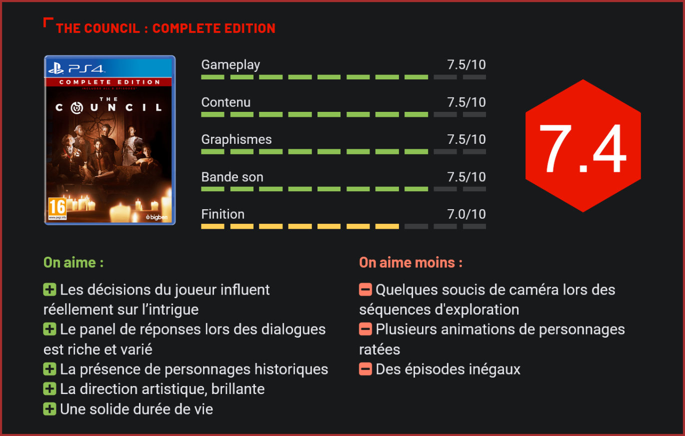 Après plusieurs mois d’attente, le chapitre final de The Council est enfin là. Le studio français Big Bad Wolf revisite le jeu d’aventure narratif à travers un projet particulièrement ambitieux – désormais proposé dans son intégralité, au format physique. Proposé sous forme épisodique, The Council nous fait découvrir les aventures de Louis de Richet, enquêteur et membre d’une société secrète, à travers 5 chapitres, désormais rassemblés sur un seul et même disque. Une intrigue qui prend racine dans la disparition de sa mère, Sarah de Richet, lors de sa visite du manoir de Lord Mortimer, établi sur une petite île reculée. Une disparition qui forcera notre héros à se rendre sur place et à tenter de faire la part des choses à travers les discours et faux-semblants des invités du Lord. À première vue, le manoir n’est le théâtre que d’une simple réception mondaine. Mais le joueur sera vite confronté à de nombreuses situations étranges, remplies de mystères et de choses inexpliquées. Les invités, dont certaines figures historiques emblématiques du XVIIIe siècle telles que George Washington ou Napoléon Bonaparte, ne font que rendre l’expérience que plus divertissante à travers de nombreux dialogues passionnants qui permettront au joueur d’y voir progressivement plus clair… Des choix lourds de conséquences En tant que jeu d’aventure narratif, la progression de l’enquête de Louis de Richet se fera en fonction des informations récoltées durant ses discussions avec les autres personnages, ainsi que des fouilles du manoir. Les échanges avec les différents protagonistes seront véritablement au centre de l’aventure narrative. Le joueur pourra d’ailleurs influencer sur les dialogues ou moments clés en choisissant la réponse de son choix. Libre à lui ainsi e mentir, dire la vérité ou préférer omettre un détail dans ses explications… Chaque choix effectué aura un véritable impact sur le déroulement de l’intrigue. Celui-ci pouvant mener à la simple vexation d’un invité, à la confrontation plus physique avec un autre, voire à la modification de la suite des événements. The Council a le mérite de pousser le concept à son apogée en ne permettant à aucun moment au joueur de faire marche arrière pour modifier sa décision. Un aspect qui aura également son importance durant les joutes oratoires. Les affrontements traditionnels des RPG prendront la forme de dialogues plus intenses – les confrontations – où, chacun à son tour, les personnages devront réagir aux propos de l’autre afin de débloquer l’un ou l’autre tableau narratif. Le joueur aura ainsi une ou plusieurs chances de choisir le bon argument à adresser à son interlocuteur pour le convaincre et “gagner” la confrontation. En cas d’échec, impossible de revenir en arrière. La stratégie et la réflexion sont véritablement au centre du titre du studio français Big Bad Wolf. Spécialisation et arbre de compétences Pour mener son enquête à bon terme, Louis de Richet pourra compter sur ses compétences qui lui permettront de débloquer des propositions supplémentaires durant les conversations, voire de se montrer plus manipulateur que ses interlocuteurs. Comme dans tout RPG qui se respecte, le joueur pourra accumuler de l’expérience qui lui permettra d’activer de nouvelles compétences parmi trois classes : ésotérisme, diplomatie et enquête. Chacune propose ses propres spécificités utiles dans les confrontations, discussions et lors de la résolution d’énigmes. Ainsi, grâce à ses grandes connaissances en géopolitique, Louis pourra se joindre aux discussions entre Bonaparte et Washington. Il pourra également crocheter la serrure d’un coffre pour en récupérer le contenu. Les compétences d’enquêteurs permettront également à Louis de déterminer plus facilement lorsqu’on lui ment. Atmosphère lugubre et « classique » L’intrigue mêlant mystère, ésotérisme et révélations est parfaitement cadrée par l’esthétique développée dans The Council. Les couloirs et les décorations du manoir de Lord Mortimer imposent une atmosphère lourde, en proie aux manifestations lugubres. Une atmosphère soulignée par des couleurs sombres de rouge sang, de bleu nuit, de gris et de marbre terne qui traduisent parfaitement l’idée que l’on peut se faire des grandes demeures moroses du XVIIIe siècle. Pour ce qui est des personnages, les détails de leurs visages sont poussés à l’extrême. Les rides, la fatigue, les excès de maquillages sont effrayants de réalisme. Malheureusement, leurs gesticulations et expressions manquent cruellement de fluidité. Leur réalisme est souligné par un doublage anglais de grande qualité. Chaque personnage disposant de son propre accent en fonction de son origine française, américaine ou anglaise. L’atmosphère et la progression sont soutenues par une bande-son incroyablement juste. Chaque morceau vient souligner la tension, la légèreté ou le mystère des événements à l’image. Un véritable plaisir pour les oreilles qui sert à l’immersion dans l’intrigue. Cinq chapitres à la qualité variable Au fil des chapitres, l’attention apportée par les Français de Big Bad Wolf semble inégale. Les différents actes sont de tailles et d’intérêts différents. Tantôt longue et intrigante, tantôt courte et banale, la progression a de quoi frustrer le joueur. L’intrigue principale et les mécanismes de jeu restent cependant prenants, chaque chapitre apportant son lot de secrets et de révélations. Autre constante : les répercussions des choix du joueur sur l’histoire. L’intensité des épisodes est d’ailleurs très influencée, voire raccourcie, par les décisions prises par celui-ci. Après presque huit mois d’attente, le chapitre final ne clôture pas véritablement l’aventure au sommet. Avec ce cinquième et dernier épisode, Big Bad Wolf