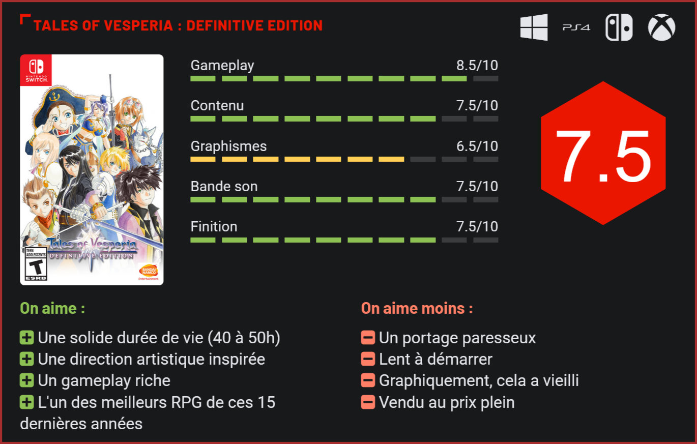 Sorti il y a 10 ans en exclusivité sur Xbox 360, Tales of Vesperia fait partie de ces RPG cultes à côté duquel de nombreux joueurs étaient passés sans même s’en rendre compte. Pour célébrer son dixième anniversaire, Namco Bandaï nous livre une réédition du titre sur PS4, Xbox One, Switch et PC. S’il n’avait pas rencontré un énorme succès à l’époque, Tales of Vesperia a acquis a fil des années un statut de jeu culte auprès des amateurs de jeux de rôle. Outre sa direction artistique, c’est surtout son univers et la richesse de son gameplay qui en ont fait un titre incontournable, que tous les rôlistes se doivent d’avoir fait au moins une fois dans leur vie… Malheureusement, on ne peut pas dire que Namco-Bandaï s’est montré très généreux avec les fans de la franchise, avec cette Definitive Edition, qui propose outre des graphismes en Full HD et quelques nouveaux morceaux, quelques contenus inédits, dont des tenues, quelques mini-jeux et boss inédits – et c’est à peu près tout, le tout à un tarif qui fera probablement frôler l’arrêt cardiaque aux joueurs les plus économes. Car il faudra tout de même débourser près de 50€ pour la réédition d’un titre sorti il y a maintenant 10 ans et qui a tout de même bien mal vieilli… Il s’agira – sans aucun doute – du plus gros frein à l’achat pour cette réédition du pauvre, qui aurait clairement dû être vendue à un tarif bien inférieur. Pour autant, difficile de ne pas se laisser séduire par ce RPG délicieusement old-school et son univers coloré. S’il est plutôt lent à démarrer, Tales of Vesperia n’en demeure pas moins un titre riche en contenu, qui n’hésite pas non plus à prendre une approche très différente des autres JRPG avec son personnage central torturé et son aventure aux allures de road-trip. L’aventure vous place dans la peau de Yuri Lowell, un ancien chevalier impérial qui va partir sur les traces d’un voleur de “noyaux” avec un petit groupe de compagnons de voyage et explorer de nombreuses contrées différentes. Si les débuts de l’aventure sont plutôt mous, la suite se corse assez rapidement, avec un système de combat évolué et des mécanismes de jeu progressifs. De prime abord très simple d’accès, le jeu réserve donc un contenu très riche et un gameplay qui ne cesse d’évoluer tout au cours de l’aventure. Aux débuts de l’aventure, le joueur n’aura accès qu’à quelques armes pas forcément très efficaces. Après quelques heures de jeu, il se rendra toutefois compte qu’il lui est possible de les améliorer en combinant plusieurs éléments, et surtout de tirer parti de leurs capacités spécifiques durant les combats. Chaque arme confère en effet des bonus non-négligeables aux personnages qui les portent durant les combats, permettant par exemple de mieux encaisser les coups ou mieux se rétablir après un saut. Les combats occupent ici une partie centrale dans l’aventure et se montrent étonnamment funs à parcourir, une fois les mécanismes de base maitrisés. La mise en scène est dynamique et les quelques boss rencontrés dans l’aventure en donneront largement pour votre argent. Avec sa quarantaine d’heures de jeu, le jeu de Namco-Bandaï offre donc une excellente longévité. Plus encore pour ceux qui choisiront de résoudre les nombreuses quêtes annexes. Paradoxalement, cette Definitive Edition n’offre pas vraiment une expérience de jeu différente de celle de l’époque. Si vous aviez déjà bouclé l’aventure sur Xbox 360, il n’est donc pas forcément nécessaire de se tourner vers cette Definitive Edition. Pour ceux qui étaient passés à côté à l’époque en revanche, cette Definitive Edition est donc un joli cadeau des dieux – même si l’on aurait sans doute préféré un prix plus doux pour sa sortie… Le travail de remasterisation reste ici minimaliste, avec quelques morceaux inédits et des graphismes tout juste HDisés. On est très loin d’un remake ou d’un remaster en bonne et due forme. La bonne nouvelle, c’est que le titre est enfin disponible sur toutes les plates-formes et a eu droit à un portage de qualité. Pas de ralentissements à noter donc, ni de bugs à profusion. Conclusion Si elle ne convainc pas totalement – la faute en grande partie à son prix qui frôle les 50€ -, cette réédition de Tales of Vesperia n’en reste pas moins un incontournable pour les amateurs de JRPG qui étaient passés à côté de cette pépite au moment de sa sortie. Avec son aventure de près de 50 heures, sa direction artistique exemplaire, ses décors variés et son gameplay riche et dynamique, Tales of Vesperia est un jeu de rôle à part, qui est parvenu à se forger sa propre identité et qui mérite dès lors que l’on s’y intéresse, même 10 ans après sa sortie. Si le titre a vieilli graphiquement, il n’en conserve pas moins une aura particulière. Regrettable toutefois qu’aucun ajout ne justifie le prix – particulièrement élevé – de cette réédition, qui aurait probablement mérité un travail plus en profondeur.