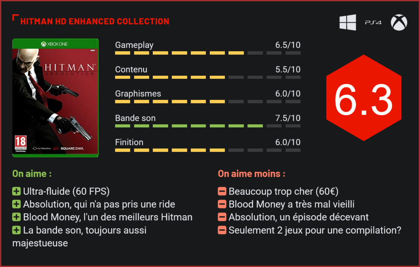 Après Hitman 2, IO Interactive nous livre une compilation qui rassemble deux des derniers volets de la franchise – en l’occurrence l’excellent Hitman : Blood Money et le très joli Hitman : Absolution. La séparation à peine prononcée avec Square-Enix, IO Interactive annonçait déjà une réédition de son reboot de Hitman sur consoles et PC. Quelques mois plus tard, le studio danois enchaînait avec un second volet très séduisant. Trois mois plus tard, IO Interactive nous livre une compilation qui rassemble les deux sortis précédemment sur PC et sur les consoles de la précédente génération. Au programme donc : l’épisode Absolution, qui est considéré par de nombreux fans comme l’un des moins bons volets de la franchise et l’excellent Blood Money. Cette “collection” ne rassemble donc que deux jeux, Hitman Contracts , Hitman 2 et Hitman n’ayant pas droit au même traitement que leurs successeurs. Paradoxalement pourtant, Warner Bros ne se gêne pas pour facturer sa compilation au prix fort. Il faudra débourser – accrochez-vous! – 60€ pour en faire l’acquisition. Les deux titres peuvent toutefois être achetés séparément, si le cœur vous en dit. Inutile de le préciser toutefois, c’est au moins 30€ de trop… Hitman Blood Money vient de célébrer son treizième anniversaire, et Hitman : Absolution était quant à lui sorti il y a 6 ans déjà… Graphiquement pourtant, Absolution ne s’en sort pas trop mal. Le jeu affiche des graphismes colorés et très détaillés, qui ne sont que sublimés par l’affichage en 4K. Hitman : Blood Money en revanche accuse le poids des années… Visuellement, le jeu est très loin d’être à la hauteur de standards actuels – logique dans la mesure où il était sorti initialement sur… PS2 et Xbox! Etrangement, Absolution et Blood Money sont deux épisodes complémentaires. Le premier avait fait rugir les fans de rage à l’époque, en raison de son orientation trop grand public et de l’IA – désastreuse – des opposants. Le second, à l’inverse, s’était imposé comme un titre riche en contenu, complexe et terriblement ambitieux pour son temps. S’ils n’avaient fait qu’un, Absolution et Blood Money auraient sans doute été le titre parfait. Dans la pratique, difficile de s’enthousiasmer pour une compilation beaucoup trop chère, qui se contente du minimum syndical au niveau de la remasterisation, avec du 4K et du 60 FPS, et c’est à peu près tout. N’espérez pas trouver ici de contenu inédit ni une refonte intégrale des graphismes. Les jeux sont fluides et tournent parfaitement sur un écran 4K, mais graphiquement rien n’a changé. C’est un fait, cette compilation ne s’adresse pas tant aux fans de la franchise mais davantage à ceux qui l’ont prise en cours de route et souhaiteraient redécouvrir le passé de l’agent 47. Malheureusement, Blood Money n’est pas forcément la meilleure porte d’entrée dans la série. Comme nous l’expliquions plus haut, le jeu a mal vieilli, tant graphiquement qu’au niveau de sa prise en main. Il s’agit typiquement d’un épisode qui contentera les fans. Là où Absolution était au contraire une porte d’entrée dans la franchise. Au final, difficile donc de savoir comment se positionner vis-à-vis de cette compilation, qui offre certes un contenu très séduisant, mais qui est loin d’offrir l’expérience qu’on aurait été en droit d’attendre d’un jeu vendu à 60€. Une chose est sûre, l’Agent 47 a encore de beaux jours devant lui en tant que tueur à gage. La dimension très cinématographique d’Absolution contraste avec le réalisme des deux derniers volets. S’il est critiquable, Absolution n’en reste pas moins un jeu d’action très divertissant, avec un scénario accrocheur et de très jolis graphismes. Blood Money à l’inverse se rapproche d’une simulation décalée de tueur à gage, avec un gameplay typiquement pensé pour être joué sur un PC et une expérience de jeu beaucoup plus riche. Côté level-design, Blood Money se rapproche du modèle très ouvert des autres Hitman, tandis qu’Absolution se rapproche d’un jeu d’action qui se joue en ligne droite. A défaut de totalement convaincre, les deux saveurs se mélangent plutôt bien. Conclusion Beaucoup trop cher par rapport au contenu qu’il propose, Hitman HD Enhanced Collection n’en reste pas moins une compilation intéressante pour les joueurs qui auraient pris le wagon en marche. Hitman Absolution offre une approche plus narrative de la franchise, avec un gameplay davantage orienté vers l’action, des séquences très cinématographiques mais un level-design plus paresseux. Blood Money, à l’inverse, se montre beaucoup plus généreux en contenu et offre un gameplay d’une rare profondeur. Si Absolution reste étonnamment beau malgré ses six ans, Blood Money a en revanche très mal vieilli. Vu le prix, on aurait été en droit de s’attendre à un joli lifting. Warner Bros s’est toutefois montré très paresseux avec cette compilation, pour laquelle on craquera de préférence durant les soldes… histoire de mieux digérer la pilule.