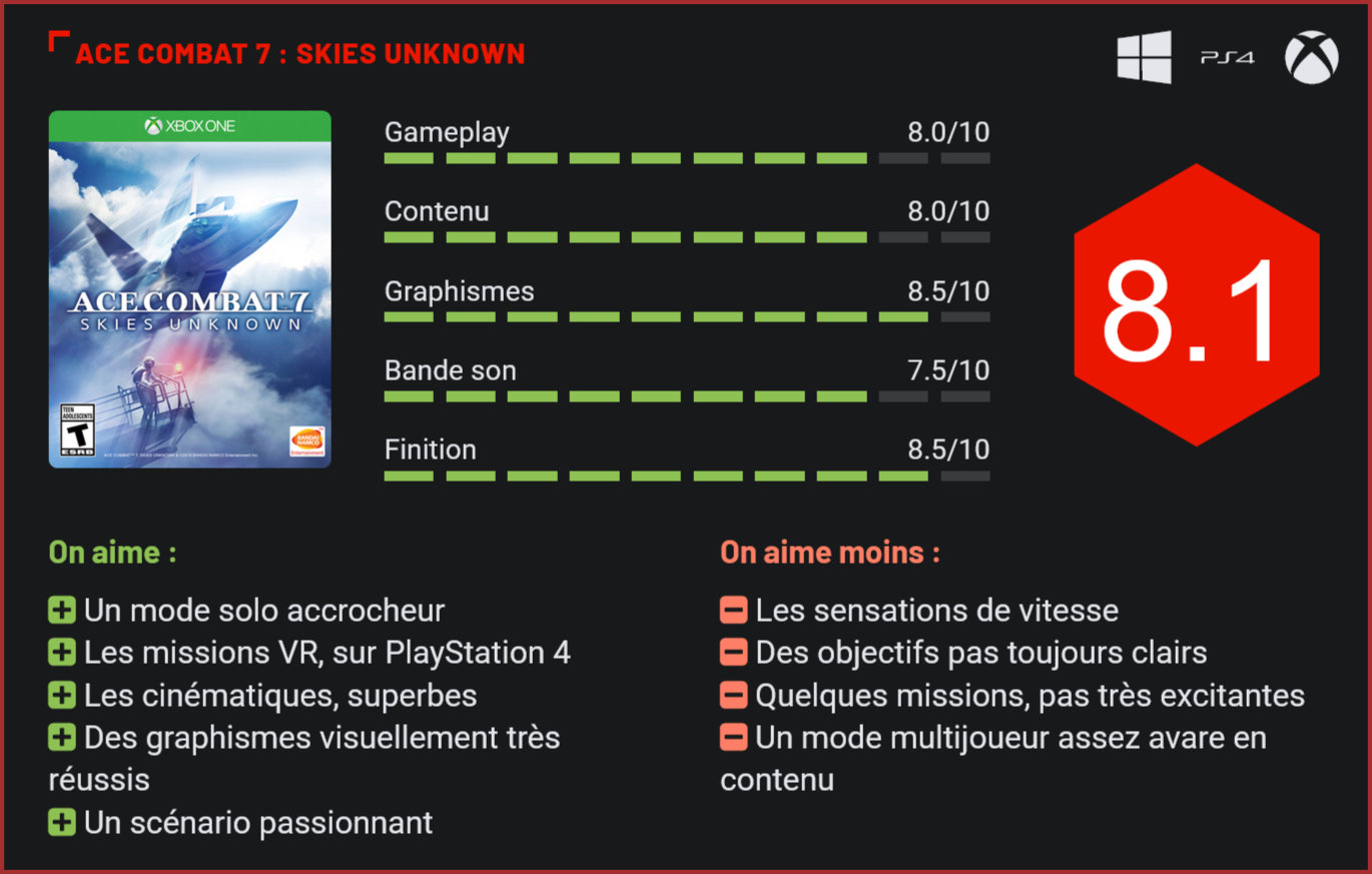 12 ans, c’est le temps que les fans auront dû patienter pour avoir enfin droit à une suite digne de ce nom à Ace Combat 6 : Fires of Liberation, qui était à l’époque sorti exclusivement sur Xbox 360. Si l’on met de côté les multiples spin-off, sortis sur consoles portables et mobiles, et l’épisode Assault Horizon, qui n’avait pas vraiment généré un franc engouement des fans, la série des Ace Combat n’avait plus droit à un nouveau volet depuis 2007, année au cours de laquelle Namco-Bandaï avait eu la drôle d’idée de réserver la sortie du sixième volet à la console de Microsoft. Malgré ses déboires, la série des Ace Combat n’en reste pas moins l’une des franchises les plus populaires de Namco-Bandaï, avec 14 millions d’unités écoulées, toutes consoles confondues. Après Assault Horizon, et cette longue période d’attente, les fans de la franchise étaient donc plutôt impatients de retrouver ce septième volet qui s’annonçait très alléchant. Que les fans se rassurent, Ace Combat 7 reste très fidèle aux précédents volets. Le gameplay, très arcade, se maîtrise rapidement, les gunfights sont passionnants et comme à son habitude, Namco-Bandaï délaisse l’actualité pour nous proposer une aventure purement fictive, dans laquelle le joueur incarnera une jeune pilote qui se retrouve malgré elle enrôlée dans un escadron suicide, en pleine guerre entre les nations d’Oséa et d’Eruséa. Malgré son scénario fictif, le mode solo d’Ace Combat 7 n’en reste pas moins passionnant. Namco Bandaï s’est inspiré des superproductions hollywoodiennes et nous livre un titre qui use et abuse des flash-backs et développe progressivement l’histoire de son héroïne. Passionnante de bout en bout, l’aventure se révèle globalement très bien rythmée et dépeint un portrait très réaliste d’un conflit purement fictif. Là où Ace Combat 7 marque des points, c’est au niveau de sa prise en main. Réaliste, le jeu de Namco Bandaï n’en reste pas moins très fun et très accessible. Le joueur est d’ailleurs plongé immédiatement dans le feu de l’action puisqu’il devra faire décoller son F-16 pour descendre un escadron ennemi qui attaque sa base, dès la première mission. Pas de long tutoriel barbant donc, ni de vidéos didactiques. Il faudra apprendre sur le tas à manœuvrer votre zinc. Heureusement, il n’y a rien de vraiment compliqué à tourbillonner dans les airs tout en canardant les ennemis. ACE COMBAT™ 7: SKIES UNKNOWN_20180719174922 Là où les choses se compliqueront, c’est au niveau des missions. Si le jeu reste accessible, cela ne l’empêche pas de proposer un niveau de difficulté suffisamment corsé pour accrocher les habitués. Dans certaines missions, le joueur devra ainsi voler à raz du sol pour éviter les radars, affronter des drones de combat capables d’opérer des manœuvres impressionnantes et semer des ennemis dans les nuages. Dynamiques, les duels aériens donnent lieu à des chorégraphies superbes et mettront à contribution votre sens du risque et votre tactique. Pour vaincre ses adversaires, le joueur devra parfois prendre de très gros risques, en frôlant les buildings et s’enfonçant dans de gigantesques masses nuageuses sans savoir ce qu’elles cachent. S’il reste accessible, Ace Combat 7 n’en est pas moins riche en contenu. Le joueur aura d’ailleurs la possibilité d’opter pour les armes de son choix en équipant son jet de différentes armes qu’il débloquera au cours de l’aventure, grâce aux fonds accumulés au cours des missions. Il aura également la possibilité de débloquer différents types d’avions, qui lui serviront dans différents cas de figure. Si les sensations sont plutôt bonnes durant les combats, on a en revanche la désagréable sensation de piloter un vieux coucou de la Seconde Guerre mondiale lors des plus longs trajets. La lisibilité au cours des missions n’est pas non plus toujours optimale, avec de nombreuses indications qui s’affichent à l’écran. Difficile de savoir ce qu’il est préférable de faire pour réussir sa mission… Globalement, l’aventure solo n’en reste pas moins très réussie, malgré quelques missions en deçà. Le scénario est efficace, la mise en scène dynamique et les environnements suffisamment variés pour nous faire voir du pays. Du côté du multijoueur, Namco-Bandaï nous livre une copie presque parfaite, avec des combats jusqu’à 8 joueurs efficaces, à défaut d’être vraiment surprenants. Il est possible de s’y affronter en équipe ou en chacun pour soi. Via les paramètres de la partie, il est possible de choisir les avions qui peuvent être utilisés et ceux qui seront bloqués, pour équilibrer un maximum les affrontements. Seul bémol : le nombre de cartes reste relativement limité puisque seulement 6 cartes sont au programme au lancement du jeu. On regrettera par ailleurs que l’éditeur n’ait pas fait preuve de plus d’originalité au niveau des modes de jeu, en proposant par exemple un mode battle royale ou des missions scénarisées. A noter que pour ceux qui en ont l’opportunité, il est préférable d’opter pour la version PS4 du jeu, qui propose un mode VR particulièrement immersif. Deux options VR leur seront proposées. Les passionnés d’aviation pourront ainsi approcher les jets dans un hangar. Ceux qui préfèrent se plonger dans l’action auront accès à plusieurs missions inédites qui se jouent exclusivement en vue à la première personne. Direction le cockpit donc du jet, pour des séquences d’action palpitantes. Ca bouge très, très vite, les sensations sont excellentes et on en vient finalement à regretter que tout le jeu ne soit pas en VR. Seul bémol : pour éviter les vertiges, il faudra faire régulièrement des pauses… Sur Xbox One, il faudra (malheureusement) se contenter d’Assault Horizon, le précédent volet de la franchise, qui est