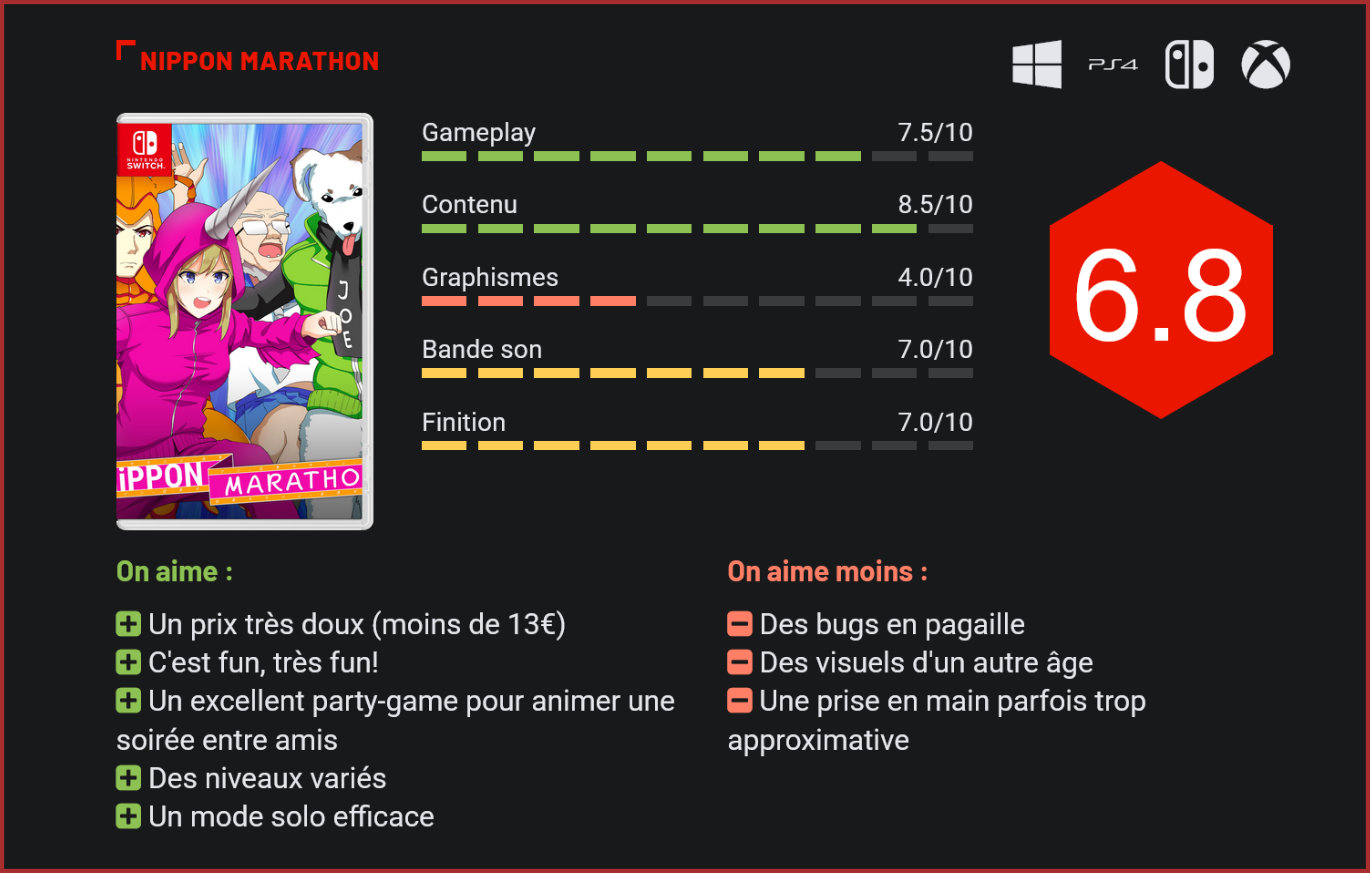 Sorti de nulle part, Nippon Marathon est un party-game qui s’inspire des shows télévisés nippons les plus décalés pour proposer une expérience d’un nouveau genre… Repéré par Pqube, le jeu est sorti en catimini en fin d’année 2018, sous forme digitale uniquement. Passé sous les radars, il a toutefois généré un très vif enthousiasme des gamers au point d’attirer notre attention. Dans Nippon Marathon, le joueur incarne le participant d’un gigantesque marathon dans les rues de Tokyo. Il aura le choix parmi une belle brochette de bras cassés, de la femme-licorne au type déguisé en homard. Totalement décalé, le jeu d’Onion Soup Interactive n’hésite pas à jouer la carte du grand n’importe quoi pour séduire. Dans le fond, le principe n’est pourtant pas si différent d’un Mariokart. Le joueur y affronte trois autres joueurs – ou IA, selon qu’il joue en solo ou en multijoueur – à travers une série de défis qui prennent la forme de courses durant lesquelles il pourra utiliser différents power-ups pour retarder ses adversaires, comme une peau de banane ou une pastèque, qu’il pourra envoyer à la figure de ses adversaires. Le gameplay se limite ici à quelques touches. Une touche pour sauter, une touche pour utiliser le bonus, une autre pour s’accroupir, les directions… est c’est à peu près tout. La caméra se positionne ici au-dessus du parcours. Comme dans un MicroMachines, le joueur devra tenter de rester à l’écran le plus longtemps possible, en évitant les obstacles qui se profilent sur son parcours et en empruntant un maximum de raccourcis. S’il est très accessible, Nippon Marathon n’en reste pas moins exigeant. Pour remporter la partie, il faudra maîtriser les différents power-ups et avoir de très bons réflexes. Fendard, le titre montre tout son potentiel en multijoueur, à quatre, mais il intègre toutefois également un mode solo. Dans le mode solo, le joueur découvrira le background des personnages de la série à travers une série de défis étalés sur un total de six marathons. Loin d’être un simple tutoriel, le mode solo du jeu se révèle efficace et permettra surtout au joueur de récolter des crédits pour débloquer divers contenus. Quel que soit le support sur lequel vous jouerez toutefois, c’est bien en multijoueur que le titre montrera son véritable potentiel pour animer des soirées entre amis. Les parties s’enchaînent à un rythme impressionnant et il est souvent très difficile de garder son sérieux face au comique des situations. Car comme nous l’évoquions plus haut dans cet article, Nippon Marathon n’hésite pas à aller très loin dans le délire. A l’image d’un Katamari Damacy, le jeu n’hésite pas à jouer avec les codes du genre. Sur votre parcours, vous rencontrerez donc de nombreux obstacles. Vous devrez ainsi éviter des hordes de chiens qui se lanceront à votre trousse, des porteurs de vitre qui traversent la route, des véhicules lancés à toute allure ou des rangées de tonneaux qui dévalent une pente. Les obstacles sont nombreux. Malgré son tout petit prix, le titre propose une large palette de décors, pièges et obstacles. Dès qu’il quitte l’écran, le joueur est éliminé de la course. C’est donc le leader de la course qui mène la danse, et peut choisir d’éliminer ses adversaires en étirant un maximum le cadre. Une fois qu’il est le seul rescapé, il récolte un point, et la partie reprend avec les quatre joueurs jusqu’à la fin du run. A la fin de la course, il reçoit un certain nombre de points, qui seront ajoutés aux autres points accumulés dans les autres parcours à la fin du “marathon”. Outre son mode solo et son multijoueur, le jeu propose également un second mode de jeu dans lequel le joueur devra sauter dans une caddie pour dévaler une pente et renverser un maximum de quilles. Un concept amusant qui offre d’ailleurs une excellente rejouabilité à plusieurs. Dommage toutefois que le studio de développement ne nous livre pas davantage de modes de jeu. En ce qui concerne la réalisation en revanche, difficile d’applaudir le travail des développeurs. Nippon Marathon a tout du jeu développé avec trois bouts de ficelle. A un tel point que le titre aurait très bien pu tourner sur PlayStation 2. Les personnages sont modélisés à la truelle, les bugs légion et les décors manquent cruellement de profondeur. La bande sonore s’en sort un peu mieux avec des morceaux loufoques et des doublages décalés, qui rythment parfaitement l’action. On ne criera pas au génie, mais à sa manière Nippon Marathon parvient à s’en tirer très bien malgré une réalisation graphique d’un autre âge. La bonne nouvelle, c’est que son prix reste très accessible. Il ne faudra de ce fait débourser qu’une petite dizaine d’euros pour en faire l’acquisition… Conclusion Difficile de ne pas être séduit par le concept complètement décalé de Nippon Marathon, un party-game qui vous propose de vous embarquer dans une course effrénée dans les rues de Tokyo avec vos potes. Terriblement fun, le jeu d’Onion Soup Interactive séduit grâce à sa prise en main très accessible, son univers décalé et ses graphismes colorés. Il ne faudra en revanche pas être trop exigeant pour ce qui est des graphismes – d’un autre âge -, qui ne font pas véritablement honneur aux supports. Nombreux, les bugs ne gâchent heureusement rien au plaisir de jeu. Vendu une petite dizaine d’euros, le titre d’Onion Soup Interactive mérite en tout cas le détour, ne serait-ce que pour son concept à part et le fun qu’il procure.
