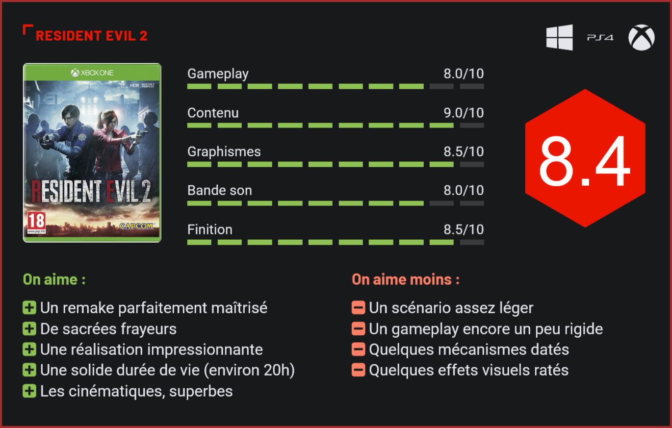 20 ans après sa sortie, Resident Evil 2 revient d’entre les morts avec un remake en bonne et due forme, qui exploite tout le potentiel des consoles de dernière génération et offre une expérience de jeu glaçante. Pari réussi pour Capcom? Attendu au tournant, le remake de Resident Evil 2 se devait d’offrir une expérience de jeu terrifiante. En 20 ans, le jeu de Capcom a beaucoup vieilli. L’éditeur avait donc logiquement décidé de livrer un remake complet, et non pas un simple remaster comme il avait pu le faire par le passé avec Onimusha ou Okami. Comme dans le remake du premier volet, sorti en 2002 sur GameCube, il est question d’une refonte en profondeur, avec l’usage d’un nouveau moteur graphique, des mécanismes de gameplay entièrement revus et quelques passages inédits. Les joueurs qui avaient parcouru le titre au moment de sa sortie, en 1998, seront donc agréablement surpris par ce remake, qui ne se contente pas d’un simple lifting graphique. La première différence notoire vient de la caméra, qui n’est plus en plan fixe mais passe à la troisième personne pour plonger littéralement le joueur au cœur de l’action et de l’horreur. Un choix intelligent, dans la mesure où cette orientation rend l’expérience beaucoup plus immersive et amplifie encore l’effet de surprise. Resident Evil 2 hérite également de certains mécanismes de jeu introduits avec les précédents volets de la franchise. Ainsi, un couteau de combat permet d’affronter au corps à corps les zombies. Les munitions étant moins nombreuses que l’opus originel, cet accessoire s’avérera d’une grande utilité dans votre progression. D’autant plus que sa prise en main est d’une simplicité enfantine. S’il propose une expérience de jeu très proche du jeu originel, ce remake se permet quelques libertés. Quelques passages inédits font leur apparition. Les développeurs n’ont aussi pas hésité à repenser le level-design pour surprendre ceux qui avaient parcouru le jeu à l’époque. Le commissariat a ainsi été entièrement repensé et le positionement des zombies a été modifié. Côté gameplay également, quelques petites nouveautés sont au programme, comme le scan d’environnement. Dans la peau du personnage mystérieux d’Ada Wong – qui apparaît en cours d’aventure -, le joueur devra ainsi scanner les décors à la recherche de boitiers électriques. Dans le même ordre d’idée, on remarquera que les zombies sont beaucoup plus agressifs et dangereux que dans l’opus originel. Désormais, une porte ne les arrête plus. Il est donc important d’être rapide dans ses choix. Pour permettre aux joueurs de se protéger, les développeurs ont ajouté un système de barricades qui permettent de tenir certains zombies à l’écart en renforçant une fenêtre ou une porte. Vu leur rareté, il faudra toutefois en faire bon usage… Dans l’ensemble, le jeu reste toutefois très fidèle à son ancêtre, si ce n’est peut-être en ce qui concerne son rythme, beaucoup plus rapide, et l’ambiance générale qu’il dégage, beaucoup plus effrayante qu’à l’époque, avec des décors suffocants, beaucoup de nervosité et des sursauts en pagaille. Un énorme travail a été fait au niveau de la mise en scène, qui rapproche le jeu d’un film hollywoodien à gros budget. Dès l’introduction, le ton est donné. Les habitués auront par ailleurs tôt fait de remarquer que ce nouveau Resident Evil 2 est beaucoup plus corsé que son ancêtre. Et pour cause puisque les munitions sont moins nombreuses et les zombies beaucoup plus résistants. Impossible ici de les tuer tous. La plupart du temps, il faudra prendre la fuite. Pour le reste, on retrouve tout ce qui a fait le succès du jeu de base avec des combats de boss nerveux, des énigmes corsées, des tas d’objets à ramasser et des personnages secondaires à incarner lors de courtes séquences. Le scénario du jeu n’évolue guère – et reste en toute honnêteté l’un des principaux défauts de cet opus, vu sa légèreté. Le joueur pourra ainsi débuter l’aventure dans la peau de Léon Kennedy, un “rookie” qui est censé intégrer les forces de la police de Racoon City et qui se retrouve malgré lui en plein apocalypse-zombie, ou de Claire Redfield, une jeune femme lancée à la recherche de son frère. Comme dans le jeu originel, les deux campagnes proposent des aventures différentes et se rejoignent épisodiquement. Pour boucler l’ensemble de l’aventure, il faudra compter environ 20h de jeu tout de même. Et beaucoup plus encore si vous prenez le temps de tout débloquer et de résoudre chaque énigme… Malgré la simplicité de son scénario, Resident Evil 2 n’en reste pas moins l’un des épisodes les plus aboutis de la série, en grande partie grâce à sa localisation, en plein cœur de Raccoon City. Riche en contenu, le titre de Capcom offre une solide durée de vie avec ses 20h de campagne et ses nombreux éléments déblocables. Graphiquement, le jeu impressionne également avec ses décors léchés, ses zombies effrayants et les nombreux détails de ses objets. Capcom nous livre une expérience de jeu glaçante de réalisme, avec des zombies qui perdent un bras, une jambe ou une main à chaque coup de feu, rampent, se débâtent, et tombent sous les coups, pour se relever quelques instants plus tard, bien décidés à vous dévorer vivant. Certes, on regrettera quelques expressions faciales pas très convaincantes et quelques effets visuels pas très réussis, mais dans l’ensemble, Resident Evil 2 met une jolie claque. D’autant plus que le jeu tourne à 60 images par seconde et est parfaitement optimisé pour les consoles de dernière génération (Xbox One X et PS4 Pro). Au niveau de la bande sonore aussi, Capcom assure, avec des bruitages plus vrais que natures et des doublages très convaincants. Seules les musiques du jeu restent au second plan, avec un nombre rel