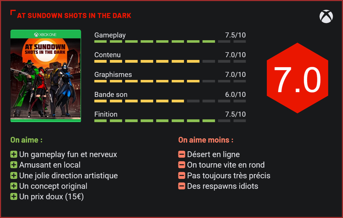 A côté des nombreux hits de ce début d’année, on retrouve une belle brochette de petits titres indés qui tentent de se faire remarquer. Après le sympathique Hong Kong Massacre, place à un autre shooter, cette fois orienté vers le multijoueur. Passé totalement inaperçu ces derniers jours, At Sundown shots in the dark est pourtant l’une des bonnes surprises de ce début d’année. Le jeu du studio Mild Beast Games, composé d’une petite poignée de développeurs tout juste gradués, est un joli pied de nez aux grosses productions hollywoodiennes. S’il reprend un genre très populaire (le twin-stick shooter), le titre ose sortir des sentiers battus pour proposer une expérience de jeu véritablement unique puisqu’il est ici question d’une véritable partie de cache-cache entrecoupée de fusillades. Comme dans Bomberman, le joueur est plongé dans un niveau rectangulaire aux allures labyrinthiques dans lequel il devra affronter ses 3 adversaires. Le titre se joue seul – mais de préférence à plusieurs -, avec la possibilité d’affronter également des IA gérées par la console. Pour massacrer ses adversaires, le joueur pourra utiliser tout l’arsenal à sa disposition : revolvers mais aussi shotguns, épées et plus encore. La particularité du jeu vient du fait que le joueur doit ici rester tapis dans l’ombre pour éviter de se faire remarquer et surprendre son adversaire. La plupart du temps, cela donne lieu à des fusillades à l’aveuglette, prétextes à de belles esclaffes entre amis. Mélange de jeu du chat et de la souris, de rogue-like et de twin-stick shooter, At Sundown shots in the dark est un titre résolument fun qui joue la carte de l’action décomplexée. On notera d’ailleurs que le level-design des niveaux est en soi un petite merveille d’ingénierie puisque chaque niveau a ici sa particularité. Dans l’un, vous devrez éviter à tout prix des pièges pour éviter d’activer une alarme qui montrera votre position aux autres joueurs. Dans l’autre, il faudra être réactif aux coups de tonnerre qui illumineront brièvement les décors, vous permettant de localiser vos ennemis un bref instant. Dans le même ordre d’esprit, on notera la présence de nombreux power-ups à récupérer qui vous donneront des capacités spéciales mais indiqueront temporairement votre position à vos adversaires. Totalement délirant, le jeu de Mild Beast Games montre son véritable potentiel à quatre joueurs. Malheureusement, le mode en ligne reste désespérément vide. Inutile donc d’espérer y jouer si vous n’avez pas d’ami sous la main pour y jouer en local… Décalé, le concept du jeu montre relativement vite ses limites puisqu’on en aura fait le tour en 4 ou 5 heures. Pour une quinzaine d’euros, cela représente plutôt un bon investissement mais quelques cartes de plus n’auraient clairement pas été de refus. Au niveau des regrets, on évoquera brièvement les points de respawn idiots, qui vous amènent à réapparaître parfois juste en face de l’adversaire et une prise en main qui manque quelque peu de précision. La bande sonore du jeu, très discrète, ne lui donne également aucune identité particulière – à l’inverse de sa direction artistique, qui le rapproche d’un animé. C’est beau, fluide et totalement décalé. Bref, une bien jolie surprise. Conclusion S’il séduit par son concept qui sort des sentiers battus, sa direction artistique inspirée et son gameplay nerveux, At Sundown shots in the dark n’en reste pas moins un shooter multijoueur sans grande prétention, qui vous occupera le temps d’une ou deux soirées avec des amis – mais guère plus, la faute à un concept qui peine à se renouveler et à un contenu un peu trop léger. Utiliser l’ombre pour se déplacer et éliminer ses ennemis a rarement été aussi fun. L’ennui, c’est qu’on fait un peu trop vite le tour du jeu et qu’en ligne, les serveurs restent désespérément déserts. Si vous êtes du genre à vous éclater entre amis devant Bomberman, n’hésitez toutefois pas, vous passerez assurément un très bon moment!