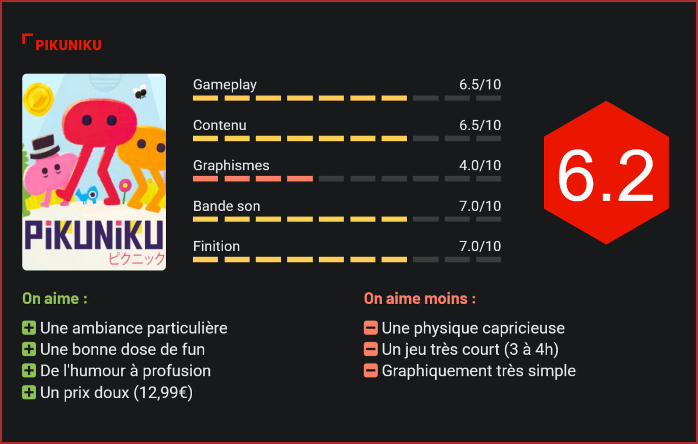 A la fois jeu de plate-forme, d’exploration et de puzzle original, Pikuniku prend place dans un univers coloré et enjoué qui rappelle l’univers caractéristique de Kirby. Mais au-delà de cette façade qui peut sembler assez simpliste, le jeu de Sectordub signé chez Devolver Digital renferme une impressionnante richesse et s’impose comme l’une des bonnes surprises de ce début d’année. Pikuniku joue la carte de la simplicité, mais derrière des graphismes élémentaires et colorés se cache un jeu de plate-forme drôle et touchant. Une fois passée l’introduction mettant en place le scénario, le joueur fait la connaissance d’un petit personnage rouge venant mettre la zizanie dans un monde dystopique coloré. Le terme de dystopie a été à juste titre évoqué, puisque le monde si coloré de Pikuniku n’est pas aussi rose que l’on pourrait le croire. On réalise très rapidement des manigances qui se profilent à l’horizon au sein de l’univers du titre. Cela ne gâche en rien l’envie de vouloir l’explorer et cette épopée sera rythmée par de nombreux dialogues. Généralement courts, ils sont surtout bourrés d’humour et c’est l’une des autres facettes qui contribue à rendre l’aventure globale amusante. La prise en main reste aussi simple que sa direction artistique. Il est donc possible de disposer d’une touche pour sauter et d’une autre pour frapper, avec également la possibilité d’effectuer quelques actions contextuelles. Rien de bien compliqué en soi, le seul problème, c’est la physique qui est un peu particulière et qui demandera un petit peu de patience parfois. L’aventure de Pikuniku devrait garantir 3 à 4h de jeu, bien que cela semble assez court, l’aventure reste néanmoins palpitante et divertissante et proposé à un tarif adapté (12,99€) – le titre en offre largement pour son argent. D’autant plus qu’il peut être possible d’y jouer seul ou à deux, le titre proposant alors des niveaux différents de l’histoire solo, de quoi donner l’envie de partager cette expérience avec son entourage puisque le jeu de Sectorsub s’avère plutôt accessible. Quant à sa musique, elle colle parfaitement à l’univers et contribue à donner cet air joyeux et bon enfant qui se dégage de ce titre. Conclusion Loin d’être un projet étudiant, ni un prototype raté, Pikuniku marque par sa conception et son univers décalé. Derrière ce jeu arborant un style graphique des plus candides, se cache pourtant une aventure drôle et amusante. Pikuniku est un jeu que l’on voudra partager et garantira alors une bonne dose de fun. Pour peu que l’on accroche à l’ambiance, le platformer a de quoi vous faire passer d’excellents moments. Dommage que l’aventure s’avère si courte puisqu’il faut s’attendre à environ 3 à 4h de jeu, en tout et pour tout. Vu son prix – une douzaine d’euros -, cela reste toutefois très respectable.
