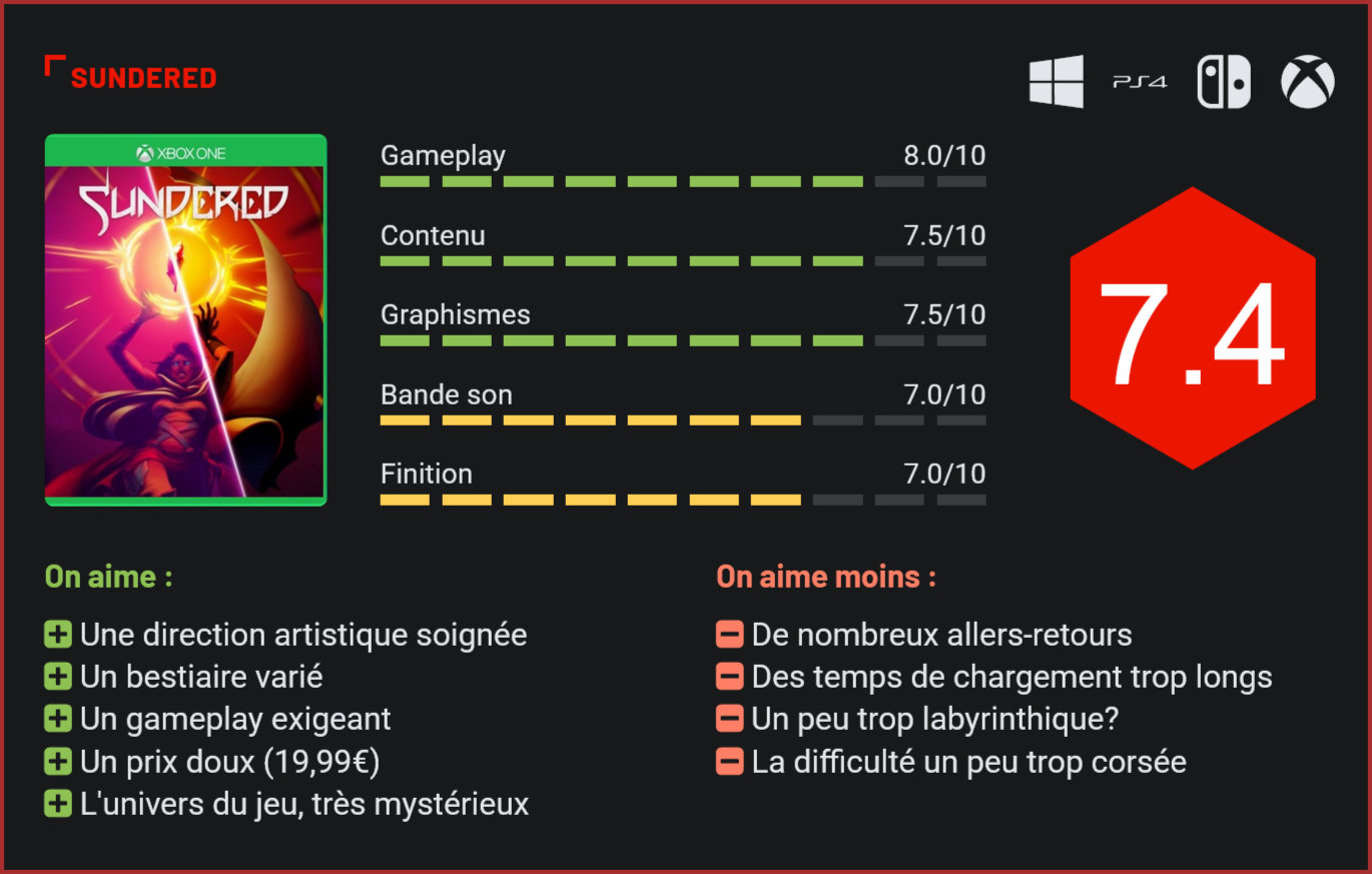 Peu chargé en sorties, ce début d’année aura toutefois été l’occasion de découvrir quelques bonnes surprises côté indé, avec récemment la sortie de l’excellent Unruly Heroes et du sympathique Pikuniku. Vient aujourd’hui se greffer une troisième entrée, qui pourrait bien séduire les amateurs de titres old-school… A mi-chemin entre un Metroïd et un Castlevania, Sundered est un titre atypique qui cible clairement un public de passionnés de rétrogaming. Développé par un tout petit studio canadien, le titre nous propose d’explorer un univers post-apocalyptique atypique, dans la peau d’une jeune femme baptisée Eshe qui devra explorer une ville sous-terraine pour en découvrir tous les secrets. D’entrée de jeu, on se rend compte que Thunder Lotus Games – les créateurs du très sympathique Jotun – ont pris soin de concevoir un univers très riche, emprunt d’une bonne dose de mystère, et qui ne révèlera ses secrets que très progressivement à travers l’aventure principale. C’est d’ailleurs ce qui fait tout le charme du jeu. Le joueur ignore quel personnage il incarne. Tout au plus sait-on qu’il s’agit d’une jeune femme (voilée), qui porte le nom de Eshe. Les premières minutes de jeu sont enivrantes, le joueur découvrant progressivement l’univers de Sundered. Il se retrouve malgré lui dans un véritable labyrinthe sous-terrain, qu’il devra explorer – selon ses envies mais également ses capacités, certaines zones de jeu se débloquant selon les capacités acquises. Inutile de le préciser, Sundered n’est pas un jeu dirigiste. Le joueur choisit son chemin, explorant chaque recoin de ce monde sous-terrain selon ses envies. A mi-chemin entre un Metroïd et un Castlevania, Sundered mélange brillamment plusieurs genres tout en misant principalement sur ses combats – très dynamiques – pour sortir du lot. Très nerveux, le jeu de Thunder Lotus Games impressionne par sa capacité à se renouveler tout au cours de l’aventure, en grande partie grâce à la diversité de son bestiaire, de ses décors et des séquences de jeu qui alternent plates-formes, affrontements et combats de boss. Nombreux et variés, les ennemis vous donneront un sacré fil à retordre. Le jeu est d’ailleurs loin d’être des plus faciles à dompter… On notera toutefois qu’avec de la persévérance le challenge reste faisable dans la mesure où il est possible de débloquer de nombreuses capacités du personnage en récupérant des cristaux à travers l’aventure. Le système d’évolution du personnage est d’ailleurs plutôt bien pensé et offre au joueur une jolie montée en puissance. On regrettera en revanche les longs trajets à parcourir à chaque mort et les longs temps de chargement à endurer… La direction prise par le studio canadien destine très clairement ce titre à un public de passionnés. Inutile donc de se lancer dans l’aventure si vous n’avez aucun intérêt pour les titres exigeant une bonne dose d’exploration et craignez l’oppression du Game Over. Pour le reste, c’est du tout bon. Thunder Lotus Games nous livre un jeu à la direction artistique très inspirée, avec un character design d’exception, des décors dessinés main absolument superbes, des animations stylées et des effets visuels très réussis. Si elle est discrète, la bande sonore n’en reste moins elle aussi très réussie avec des musiques oppressantes et des doublages glaçants. Plutôt généreux en contenu – pour le prix auquel il est proposé (19,99€) -, Sundered offre en soi une solide durée de vie et devrait dès lors n’avoir aucune difficulté à séduire les amateurs de Metroïdvania. Conclusion S’adressant à un public de puristes, Sundered est incontestablement l’une des petites pépites de ce début d’année 2019. Visuellement superbe, le jeu de Thunder Lotus Games séduit surtout par la richesse de son gameplay (calqué sur un certain Metroïd) et de son univers SF envoûtant et mystérieux. Hardcore, le titre n’hésite pas à submerger le joueur d’assaillants, le forçant à recommencer à plusieurs reprises certains segments du jeu. Exigeant, Sundered n’en reste pas moins un titre absolument délicieux à parcourir et un autre incontournable à ajouter à sa collection pour tous les passionnés de rétrogaming…
