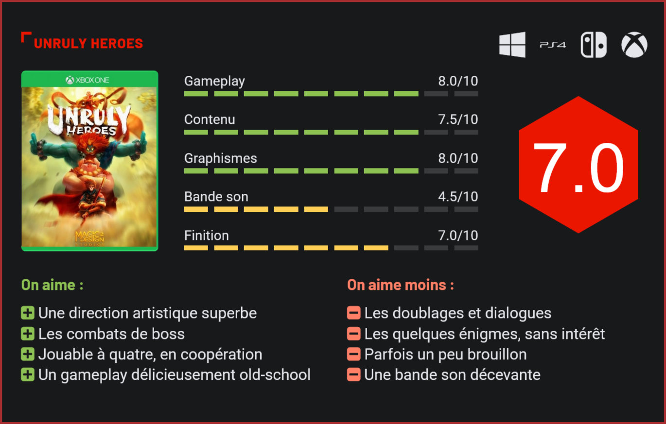 Inspiré de “La Pérégrination vers l’Ouest”, un ouvrage de Wu Cheng En, Unruly Heroes est un jeu d’aventure coopératif dans la droite lignée de Trine, qui pourrait bien séduire les amateurs de jeux de plates-formes et beat them all old-school… Développé par un petit studio indépendant français, Unruly Heroes est un titre atypique qui s’inspire ouvertement de Trine pour ce qui est du gameplay et nous fait découvrir une histoire méconnue en Occident, puisque Magic Design Studios a choisi de porter en jeu un ouvrage de l’auteur chinois Wu Cheng En baptisé “La Pérégrination vers l’Ouest.” Petit budget oblige, il ne faut pas s’attendre à un blockbuster. Les quelques séquences cinématiques présentent trahissent d’entrée de jeu le pédigrée du studio. On sent en effet que les développeurs de Magic Design Studios n’ont pas eu les moyens de peaufiner leur bébé. La narration n’est clairement pas le fort du studio. Les doublages sont médiocres, animations souvent ridicules et la bande sonore du jeu beaucoup trop en retrait. Pour autant, passer à côté d’Unruly Heroes sans s’y intéresser serait une grossière erreur tant le titre a de jolies choses à nous proposer… Tout d’abord, au niveau de sa réalisation graphique. Le jeu a bénéficié d’un traitement absolument remarquable, avec une direction artistique inspirée des aquarelles chinoises, des animations fluides et un style graphique qui rappelle globalement celui d’un Rayman Legends. Les décors, nombreux et variés, sont vraiment ce qui donne le plus de caractère à ce titre, qui vous fera voir du paysage. On notera au passage que les nombreux effets visuels, tels que les jeux de lumière ou la brume sont particulièrement réussis, plongeant le joueur dans une atmosphère très mystérieuse. L’autre grande qualité d’Unruly Heroes, c’est de proposer une expérience de jeu vraiment enivrante seul ou à quatre, grâce à son mode coopératif qui permet jusqu’à 4 joueurs de s’entraider dans l’aventure, en local. S’inspirant ouvertement de Trine, le titre permet au joueur de contrôler quatre héros et de passer de l’un à l’autre en pressant simplement sur un bouton. Chaque personnage dispose de capacités qui lui sont propres – il faudra donc passer régulièrement de l’un à l’autre pour progresser dans l’aventure en privilégiant les personnages plus physiques durant les affrontements et plus agiles pour les séquences de plates-formes. Comme Trine, Unruly Heroes mélange des séquences de plates-formes, d’affrontements, des énigmes et des combats de boss. L’aventure est globalement suffisamment riche pour vous garder scotché à votre pad. Seules les énigmes restent en retrait… Les combats de boss, à l’inverse, impressionnent par leur richesse et le fun qui s’en dégage… Avec sa direction artistique inspirée, son univers très riche, ses séquences de jeu variées et ses combats de boss d’une grande intensité, Unruly Heroes séduira les amoureux des jeux de plates-formes et de beat them all old-school. D’autant plus qu’il est proposé pour une bouchée de pain. Il ne faudra en effet débourser qu’un peu moins de 20€ pour en faire l’acquisition. Conclusion Vendu une vingtaine d’euros sur les principales plates-formes de téléchargement, Unruly Heroes est l’une des bonnes surprises indé de ce début d’année. Le petit studio français, auteur de ce platformer délicieusement old-school, multiplie les références, en s’inspirant des plus grands. Dans la droite lignée de Trine, Unruly Heroes mélange plate-forme, combats et énigmes avec brio et se laisse parcourir en solitaire ou en coop, jusqu’à quatre. Visuellement superbe, le titre de Magic Design Studios est incontestablement l’une des pépites de ce début d’année, à ne manquer sous aucun prétexte pour les amateurs de jeux indés…