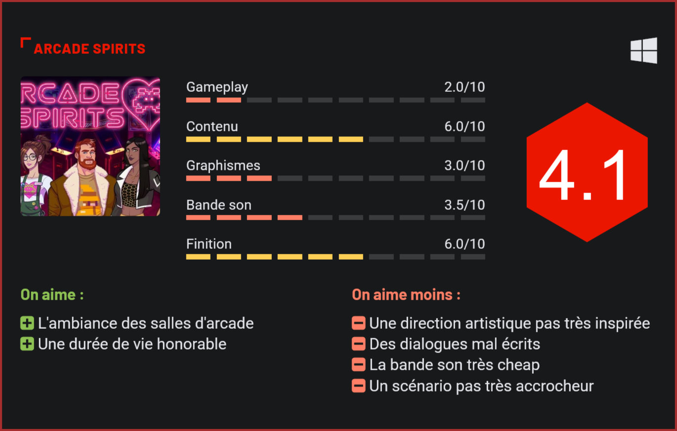 Arcade Spirits, le visual novels romantique de Fiction Factory Games, se déroule en 20XX dans une dimension où le krach du jeu vidéo de 1983 n’a jamais eu lieu. Romances, amitiés, disputes, vous êtes maître de votre destin tout au long de votre aventure. Mettons directement les points sur les « i » : si vous n’êtes pas fan des visual novels, ce jeu n’est pas fait pour vous. Il s’inscrit dans la lignée directe du genre et se distingue des autres titres grâce à son univers différent de ce qu’on a l’habitude de voir : les jeux vidéo, et plus particulièrement les salles d’arcade. Les visual novels ont une dynamique très particulière. Très appréciés au Japon, ces jeux se rapprochent plus d’un livre que d’un jeu vidéo. Le texte défile dans un encadré et est souvent accompagné d’une voix ou d’une musique. L’interaction se fait lorsque vous devez choisir entre plusieurs phrases ou plusieurs actions qui détermineront la suite de l’histoire. Lors de votre aventure, vous incarnerez votre propre personnage que vous aurez eu l’occasion de personnaliser au début de la partie. Le choix n’est pas très large mais ça n’a aucune incidence sur le déroulé de l’histoire. La mise en place de celle-ci est tirée en longueur et on en perd le fil assez vite. Si vous aimez les jeux dynamiques et mouvementés, passez donc votre chemin. Après avoir emmagasiné toutes les informations concernant le contexte du jeu, un tutoriel est mis à votre disposition. Il vous permet de comprendre tous les comportements qu’il vous est possible d’avoir. Celui-ci est bien réalisé, on comprend très vite le principe de base du jeu. L’inconvénient est que si vous n’êtes pas bilingues, certains termes utilisés sont difficiles à comprendre. Vient ensuite la découverte du lieu principal de l’action : la salle d’arcade. L’ambiance rétro qu’elle apporte est très intéressante et rendra nostalgiques ceux qui ont connus ces lieux. L’entretien d’embauche est assez cocasse et l’humour de certains moments est très appréciable. Vous aurez l’occasion de rencontrer un certain nombre de personnages au cours de votre aventure. Il vous sera possible d’avoir n’importe quel type de relation avec tous les personnages du jeu, hommes ou femmes, ce qui apporte une plus grande dimension à votre histoire. L’IRIS, intelligence artificielle qui vous aidera tout au long du jeu, est un personnage très attachant grâce à son humour et sa franchise. Au niveau de la réalisation, les graphismes ne sont pas les plus beaux mais ce n’est pas ce qui est attendu pour ce style de jeu. Le principal, c’est l’histoire. Et c’est à ce niveau que le bas blesse, car si l’univers d’Arcade Spirits est séduisant, son scénario peinera à vous tenir scotché à votre pad. Graphiquement, le titre n’atteint pas non plus des sommets avec un character design très moyen et des artworks de qualité moyenne. On a déjà vu beaucoup mieux. Côté bande sonore, pas de grosse surprise là non plus. Les musiques sont très répétitives, les voix se coupent régulièrement et les doublages sont de qualité modestes. Bref, ça transpire la petite production et on en vient à penser qu’il aurait mieux valu se contenter de textes simples. Conclusion : Arcade Spirits est un visual novel qui change de ce qu’on a l’habitude de voir grâce à son univers délicieusement vintage qui vous emmènera à la découverte des salles d’arcade. Mais dans l’ensemble, il s’inscrit dans un domaine dont on fait vite le tour. Le côté rétro apporte un certain charme au jeu mais la pauvreté des dialogues et la qualité moyenne de l’écriture en font un titre très dispensable. Côté réalisation, rien de très impressionnant non plus avec une direction artistique moyenne et une bande son du pauvre. Heureusement, le titre n’est vendu qu’une poignée d’euros (12,99€).