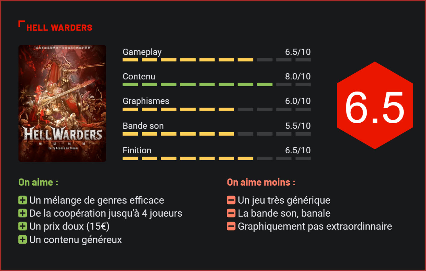 Anti Gravity Game Studio nous montre que les jeux mélangeant tower defense et hack’n’slash ne sont pas définitivement morts avec Hell Warders. Hell Warders est un jeu qui mélange des genres que l’on ne voit plus trop dans l’horizon vidéoludique. Le champ est donc libre en la matière, c’est pourquoi le studio hongkongais s’est empressé de le proposer en accès anticipé sur PC. La version testée n’est d’ailleurs pas très éloignée de sa version finale, puisque le titre ne devrait plus trop tarder à sortir. Le studio Anti Gravity reprend une formule déjà bien établie par des licences assez connues dans le genre comme Orcs Must Die ou Dungeon Defenders. De ce côté, ses concepteurs n’ont donc pas réinventé la roue et l’on reste dans les classiques. Il faut donc affronter des vagues d’ennemis en défendant un cristal et en évitant que celui-ci ne prenne trop dégâts. Cet aspect défensif est rendu possible via quelques unités que l’on peut disséminer n’importe où sur chaque carte. De plus, il est même possible d’affronter les vagues de démons directement. Il est possible de choisir entre plusieurs types de combattants certains étant plutôt destinés au corps à corps et d’autres plutôt taillés pour le combat à distance. Hell Warders est donc une production à laquelle on pouvait s’attendre et l’on reste dans le classicisme pur et dur. Quand bien même le titre possède un côté RPG, cela reste somme toute limité et relatif. Au niveau de la difficulté, Hell Warders se veut être très exigeant. Le moindre mauvais placement ou mauvais choix de combinaison d’unités a de très grandes chances d’amener à la défaite. Le cas échéant, cela réduira les points d’habilité récupérés en fin de partie. Ces points récupérés dépendent des dégâts que le cristal aura reçu. Il faudra donc faire une partie parfaite afin de pouvoir en récupérer le maximum et de s’octroyer au passage un objet aux capacités uniques. Hell Warders est un jeu où la patience est de mise puisqu’il est nécessaire de devoir généralement recommencer chaque niveau plusieurs fois. D’ailleurs, au-delà de l’aspect stratégique il faut faire preuve de dextérité. Car il est important de ne pas foncer tête baissée sans réfléchir. Tomber au combat entraîne un délai de réapparition qui peut être problématique selon la situation. Venir à bout des différents niveaux n’est pas toujours chose aisée. Il sera parfois, si ce n’est souvent, nécessaire d’insister et de ne pas se décourager. Alors qu’il existe un niveau de difficulté encore plus élevé, il reste difficile d’imaginer pouvoir s’y essayer tant la difficulté de base reste un challenge. Il est d’ailleurs regrettable qu’un mode plus simple ne soit pas proposé et cela reste à espérer lors de la sortie de la version complète du titre. Hell Warders reste donc recommandé aux amateurs du genre et à ceux qui ne reculeront pas devant la difficulté. D’ailleurs, à la fin de chaque chapitre, il est à noter qu’il sera possible d’affronter un boss qu’il faudra affronter en 1 vs 1. La difficulté de ce côté-là est d’ailleurs mieux dosée, surtout une fois que le jeu commence à être maîtrisé. Au-delà du gameplay, la direction artistique est assez sympathique, bien que souffrant d’un manque d’originalité. Les styles des différents personnages jouables, ainsi que ceux des troupes et des démons, sont eux aussi très classiques. Rien ne se dégage en particulier du titre d’Anti Gravity de ce point de vue là. Graphiquement, le titre reste correct et n’est pas en deçà des productions équivalentes actuelles. La version anticipée que l’on peut actuellement retrouver sur PC propose un contenu qui saura satisfaire. Cette version est d’ailleurs proposée sur Steam à un prix réduit puisqu’elle n’est pas encore complète. Pour peu que l’on soit amateur du genre, il peut être intéressant de considérer l’achat du titre avant sa sortie définitive. D’autant plus qu’il est possible de partager son expérience puisque Hell Warders est jouable en coopération jusqu’à 4 en simultané. Il est possible de jouer avec des inconnus ou de pouvoir facilement retrouver ses amis. Conclusion Hell Warders est un jeu mélangeant tower defense et action qui saura satisfaire les amateurs du genre. Le titre possède pléthore de contenu et comporte des niveaux suffisamment bien conçus. Il est aussi jouable en coopération et permet ainsi à 4 joueurs de s’entraider pour venir à bout des hordes d’adversaires et de boss. Cependant, le studio hongkongais n’a fait preuve d’aucune originalité avec Hell Warders, tant au niveau du gameplay que de la direction artistique. Générique par nature, le titre reste plutôt plaisant à parcourir et vu son prix (15€), il sera difficile de ne pas craquer.
