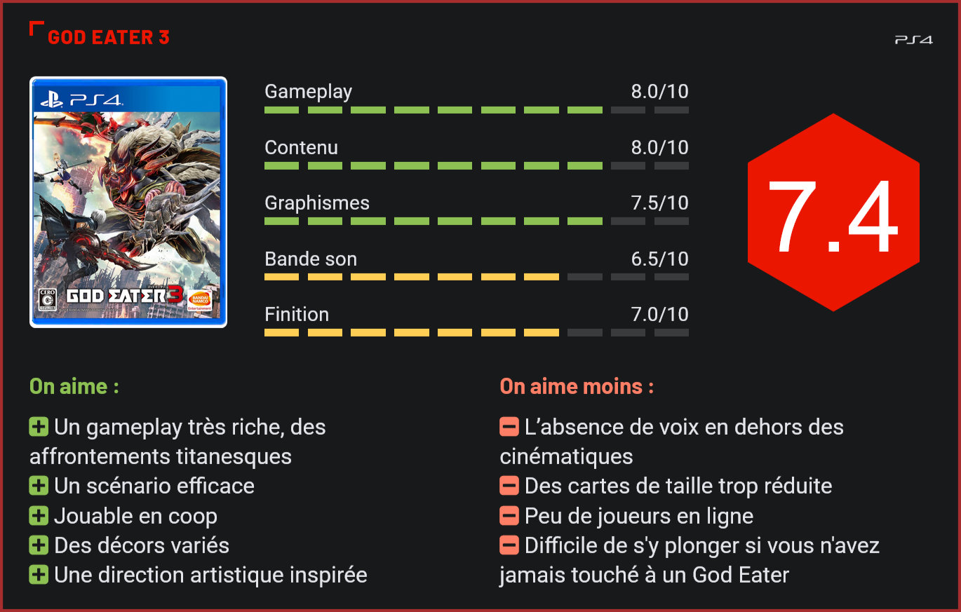Surfant sur le succès du colossal Monster Hunter World, God Eater 3 s’annonçait comme l’un des titres les plus séduisants de ce début d’année. Sorti depuis longtemps au Japon, le titre débarque avec quelques mois de retard Europe. Avec ce nouvel opus, l’éditeur japonais tente de séduire un nouveau public avec une aventure exigeante tout en restant accessible au plus grand nombre. Pour atteindre son objectif, Bandai Namco propose le nouvel épisode de God Eater sur PS4 et Steam plutôt que sur PS Vita, comme à son habitude – logique en soi puisque la console est désormais officiellement “morte”. Et pour cette version européenne, les anglophiles profiteront d’une adaptation anglaise sous-titrée français. Monstres divins et soldats d’élite La licence de God Eater est née en 2010 sur PSP et a connu un véritable succès au Japon et ailleurs. Adaptée en manga et série, God Eater compte aujourd’hui 6 jeux vidéo (3 titres principaux et 3 remakes). La série nous plonge dans un futur post-apocalyptique où l’humanité court à sa perte. Une extinction due à l’apparition des “Oracle Cells”, des cellules vivantes qui ont peu à peu englouti les êtres vivants, les transformant en des créatures tordues et féroces, les Aragamis ou “dieux violents”. La fin inexorable de notre civilisation a été ralentie grâce à une technologie capable d’incorporer les Oracles cells aux êtres humains. Désormais, les survivants capables de vivre avec ces parasites vouent leur existence à renverser les Aragamis, grâce à des armes surpuissantes, les God Arc. Un avenir apocalyptique des plus sombres Ce 3ème opus se révèle dès les premiers instants beaucoup plus sombres que les précédents. Les soldats d’élite que sont les God Eaters sont réduits à de simples armes de destruction chargés de repousser les monstres. Les mutations touchent désormais les plus jeunes, les Adaptative God Eaters. Des enfants-soldats pour lesquels les autres survivants n’ont aucune considération. L’histoire principale se distille entre les cinématiques et les phases préparatoires, avant les missions. Enfermés dans des cellules, attendant les ordres pour aller tuer des Aragami, les tueurs de dieux sont réduits à l’esclavage dans un endroit sombre et lugubre, où les plus jeunes se meurent peu à peu. Si l’ambiance est parfaitement pesante, soulignée par une direction artistique des plus bels effets, les séquences où l’on doit discuter avec les différents PNJ restent quelque peu répétitives et lassantes. God Eater 3 se veut accessible au grand public – heureusement pour nous, nous sommes justement néophytes à l’univers. Si la mécanique de jeu se révèle effectivement accessible grâce à une succession de missions extrêmement courtes à vocation tutoriel, l’histoire s’avère plus compliquée à pénétrer. Les tenants et aboutissants sont forcément moins essentiels pour un novice. Des bases sans saveur Emprisonné dans une salle avec d’autres mangeurs de dieux, notre héros pourra discuter avec les autres PNJ, mais également faire des allées et venues entre le terminal et le tableau de commande. Le premier lui sert à gérer son équipement, activer l’une ou l’autre compétence, fabriquer et améliorer des objets et découvrir des informations essentielles sur ce futur apocalyptique. Cette base de données rend donc accessible l’histoire de God Eater aux nouveaux venus, encore faut-il qu’ils se donnent la peine de lire la multitude de domaines (histoire, personnage, mécanique de jeu). Le tableau de commande, quant à lui, permet de visualiser et d’accepter les missions. Passage obligé pour avancer dans l’histoire. Une mécanique qui persiste même lorsque les soldats d’élite échangent leur prison pour un vaisseau allié. Dans l’idée de se rendre accessible, le début de l’aventure sera progressif avec une multitude de très courtes missions vouées à nous faire ingurgiter toutes les combinaisons de touches à connaitre pour venir à bout des Aragamis. Une succession de tutoriels indigestes qui sera véritablement compliquée à assimiler. La présence des commandes sur l’écran principale, en surimpression, rendra d’ailleurs les combats difficiles puisqu’ils inondent tout bonnement la visibilité. Une fois passée cette étape pédagogique, les missions deviennent heureusement plus vastes et les ennemis plus intéressants à affronter. On quitte d’ailleurs la prison pour d’autres lieux, avec des personnages plus causants que le gardien. Au fur et à mesure que l’aventure progresse, la difficulté ne fait que croître ce qui rend justice à la longue initiation des combats. Explorations et massacres Outre les cinématiques et discussions entre les personnages, God Eater 3 reprend le principe de base de ses prédécesseurs, à savoir la chasse aux monstres. Le joueur devra parcourir des sortes de mini-cartes afin de dénicher et massacrer les Aragamis, tout en récupérant quelques objets ici et là. Une aventure forcément limitée dans l’espace et dans le temps qui ne permettra pas au joueur d’explorer les environs comme bon lui semble. Les différentes cartes se montrent toutefois particulièrement bien réalisées, avec un level-design intelligent. On regrette juste leur étroitesse. Armes et attaques divines Pour arriver à bout de ces super-monstres, les God Eaters pourront compter sur leurs armes tout aussi puissantes. L’aspect équipementset compétence tient une place importante dans le titre très orienté “hack et slash”. Il faudra choisir les armes et pouvoirs de ses personnages – on peut activer les compétences des coéquipiers du personnage principal – afin de les faire gagner en puissance. Outre leurs compétences, les soldats pourront se reposer sur les Armes divines, infectées par les mêmes cellules divines que les monstres. Celles-ci se développent au fil des combats