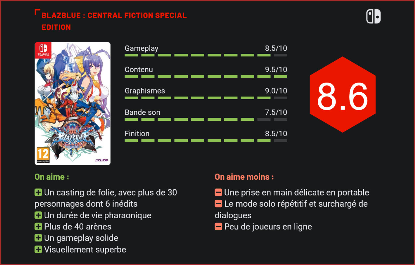 Sorti initialement en arcade, puis sur PC et PlayStation, l’excellent Blazblue : Central Fiction a aujourd’hui droit à une sortie sur la petite console de Nintendo dans une édition intégrale. Quatrième et dernier volet de la franchise, BlazBlue Central Fiction est considéré par de nombreux fans comme l’un des meilleurs épisodes de la saga, si pas le meilleur. Sa sortie sur Switch est donc une véritable bénédiction pour les amateurs de baston 2D. Sorti en 2016 sur PS4, Central Fiction n’a étonnamment presque pas vieilli. Le moteur employé par Arc System Works (les créateurs de Dragon Ball FighterZ et de Guilty Gear) reste toujours aussi impressionnant, malgré son âge. Les modélisations en 2D sont d’une propreté rare, les animations d’une grande fluidité, les décors surchargés en détails et le character design tout bonnement fantastique. Arrivée à maturité depuis la sortie du troisième volet, la série des BlazBlue est incontestablement devenue une incontournable pour les passionnés de jeux de baston en 2D. Il faut toutefois le reconnaître, Arc System a eu tendance à multiplier un peu trop les sorties ces dernières années, entre les rééditions et les suites. Restée à l’ombre pendant deux ans, la franchise s’est offerte une pause – bien nécessaire avant un retour sous le feu des projecteurs. Attention toutefois, Arc System Works l’avait à l’époque bien précisé : il n’y aura plus de nouveaux volets. Central Fiction est donc bel et bien l’épisode ultime de la franchise – à ne louper sous aucun prétexte si vous étiez passés à côté des derniers volets. Et le moins que l’on puisse dire, c’est que l’éditeur a mis les petits plats dans les grands pour nous livrer un titre très riche en contenu, avec pas moins de 42 arènes (auxquelles il faudra ajouter plusieurs variantes), 36 personnages (dont 6 nouveaux venus) et un nombre impressionnant de modes de jeu, allant du tutoriel au mode story, en passant par le mode Arcade, le Versus, le Speed Star, le Score Attack, le Grim of Abyss – un mode de jeu dans lequel le joueur doit enchainer affrontements et combats de boss avec une difficulté croissante et récupérer différentes compétences qui lui permettront d’améliorer son personnage au fil des parties -, sans oublier du multijoueur en local et en ligne. Une chose est sûre : vous en aurez largement pour votre argent, d’autant plus qu’à l’exception du mode story – beaucoup trop bavard, et un peu trop répétitif -, le contenu est d’une qualité surprenante. Ce fameux mode story n’en reste pas moins l’épine dorsale du jeu, et plaira sans aucun doute aux fans de visual novels avec ses longs discours et ses superbes séquences animées. Pour en voir le bout, on notera qu’il faudra tout de même passer plus de 7 heures devant sa console. Vous êtes prévenus! Bonne nouvelle, sur Switch les deux personnages proposés sous la forme de DLC sont offerts aux acheteurs du jeu. Les différents DLC ont également été intégrés à l’édition finale du titre, par courtoisie. Généreux en contenus, le jeu propose également quantité d’artworks à collectionner, lesquels seront regroupés, une fois acquis, dans le mode Galerie. Côté gameplay, on applaudit l’impressionnante diversité de coups et techniques des personnages. Dans Blazblue, les différents persos disposent tous de leur propre style de combat. Chacun y trouvera donc largement à son goût… Le gameplay reste très accessible puisqu’il s’agit ici de combiner les quatre touches avec des quarts de cercles pour enchainer les combos. Pour autant, Blazblue n’est pas ce qu’on pourrait appeler un jeu de baston pour néophytes. Il faudra en effet apprendre à maîtriser les nombreux coups spéciaux et le blocage pour espérer remporter ses combats. Hyper-technique, le jeu d’Arc System Works exige un excellent timing. Les débutants pourront apprendre à maîtriser les différentes techniques dans le mode tutoriel, fort bien conçu. Mieux encore : il est possible de modifier la prise en main du jeu avec le mode Stylish, qui permettra aux débutants d’enchainer les combos beaucoup plus facilement. Les habitués reprendront vite leurs marques puisqu’en soi, la recette n’a pas beaucoup évolué. Ce quatrième et dernier volet de la franchise ne se distingue du troisième volet pratiquement qu’au niveau de son contenu, particulièrement riche. Arc System Works a certes pris la peine d’améliorer certains mécanismes du jeu, mais les retouches restent légères. On pense notamment au raccourci du bouton SP qui permet de sortir facilement une super-attaque. Pratique, au point qu’on en viendrait même à se demander pourquoi si peu de jeux de baston en proposent une… Ce portage sur Switch s’en sort globalement très bien – surtout sur le plan technique. Le framerate est étonnamment stable, les menus très ergonomiques et les super-attaques crèvent littéralement l’écran. Carton rouge en revanche pour ce qui est de la prise en main en mode nomade, pas franchement ergonomique. BlazBlue est typiquement le jeu qu’on fera de préférence au pad pro ou au stick arcade. Pour le reste, Arc System Works a soigné sa copie : il y a du multijoueur en local et du multijoueur en ligne (même si le nombre de joueurs est relativement maigre), la bande sonore est efficace, à défaut d’être grandiose, avec des musiques électriques et des doublages en japonais d’une grande qualité. il faudra en revanche se contenter de sous-titres en anglais. Conclusion Les amateurs de jeux de baston en 2D sont décidément gâtés sur Switch. Après l’excellent Garou Mark of the Wolves, la console de Nintendo accueille un autre monument du jeu de combat avec le quatrième et dernier volet de la série des BlazBlue. Généreux en contenu, ce portage sur la console de Nintendo impressionne par sa fluidité, la diversité de ses modes de jeu e